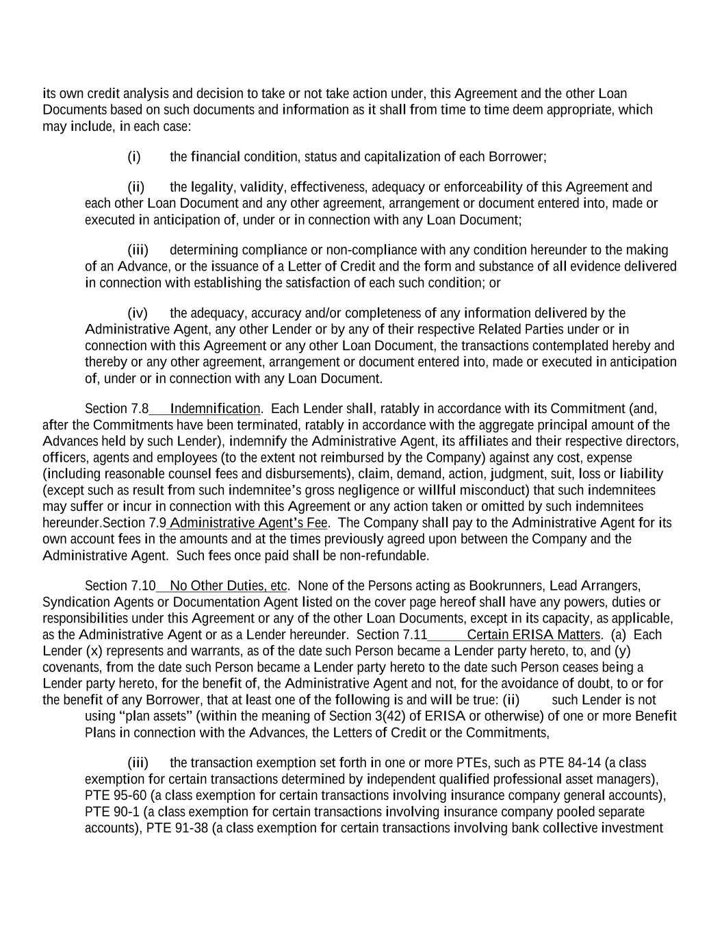 its own credit analysis and decision to take or not take action under, this Agreement and the other Loan Documents based on such documents and information as it shall from time to time deem appropriate, which may include, in each case: (i) the financial condition, status and capitalization of each Borrower; (ii) the legality, validity, effectiveness, adequacy or enforceability of this Agreement and each other Loan Document and any other agreement, arrangement or document entered into, made or executed in anticipation of, under or in connection with any Loan Document; (iii) determining compliance or non-compliance with any condition hereunder to the making of an Advance, or the issuance of a Letter of Credit and the form and substance of all evidence delivered in connection with establishing the satisfaction of each such condition; or (iv) the adequacy, accuracy and/or completeness of any information delivered by the Administrative Agent, any other Lender or by any of their respective Related Parties under or in connection with this Agreement or any other Loan Document, the transactions contemplated hereby and thereby or any other agreement, arrangement or document entered into, made or executed in anticipation of, under or in connection with any Loan Document. Section 7.8 Indemnification. Each Lender shall, ratably in accordance with its Commitment (and, after the Commitments have been terminated, ratably in accordance with the aggregate principal amount of the Advances held by such Lender), indemnify the Administrative Agent, its affiliates and their respective directors, officers, agents and employees (to the extent not reimbursed by the Company) against any cost, expense (including reasonable counsel fees and disbursements), claim, demand, action, judgment, suit, loss or liability (except such as result from such indemnitee’s gross negligence or willful misconduct) that such indemnitees may suffer or incur in connection with this Agreement or any action taken or omitted by such indemnitees hereunder.Section 7.9 Administrative Agent’s Fee. The Company shall pay to the Administrative Agent for its own account fees in the amounts and at the times previously agreed upon between the Company and the Administrative Agent. Such fees once paid shall be non-refundable. Section 7.10 No Other Duties, etc. None of the Persons acting as Bookrunners, Lead Arrangers, Syndication Agents or Documentation Agent listed on the cover page hereof shall have any powers, duties or responsibilities under this Agreement or any of the other Loan Documents, except in its capacity, as applicable, as the Administrative Agent or as a Lender hereunder. Section 7.11 Certain ERISA Matters. (a) Each Lender (x) represents and warrants, as of the date such Person became a Lender party hereto, to, and (y) covenants, from the date such Person became a Lender party hereto to the date such Person ceases being a Lender party hereto, for the benefit of, the Administrative Agent and not, for the avoidance of doubt, to or for the benefit of any Borrower, that at least one of the following is and will be true: (ii) such Lender is not using “plan assets” (within the meaning of Section 3(42) of ERISA or otherwise) of one or more Benefit Plans in connection with the Advances, the Letters of Credit or the Commitments, (iii) the transaction exemption set forth in one or more PTEs, such as PTE 84-14 (a class exemption for certain transactions determined by independent qualified professional asset managers), PTE 95-60 (a class exemption for certain transactions involving insurance company general accounts), PTE 90-1 (a class exemption for certain transactions involving insurance company pooled separate accounts), PTE 91-38 (a class exemption for certain transactions involving bank collective investment
