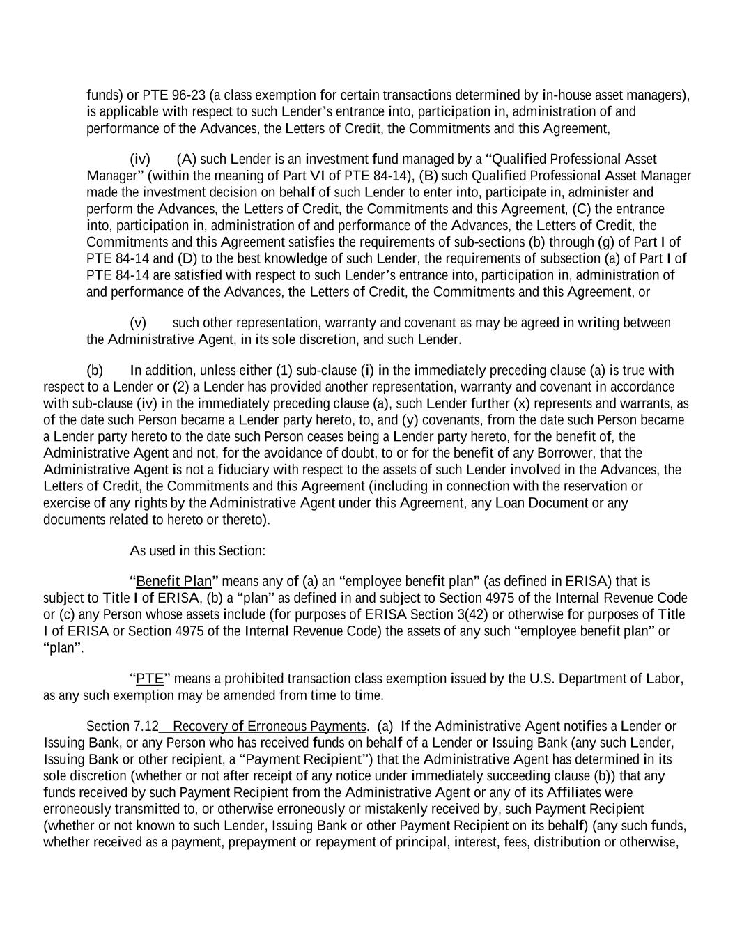 funds) or PTE 96-23 (a class exemption for certain transactions determined by in-house asset managers), is applicable with respect to such Lender’s entrance into, participation in, administration of and performance of the Advances, the Letters of Credit, the Commitments and this Agreement, (iv) (A) such Lender is an investment fund managed by a “Qualified Professional Asset Manager” (within the meaning of Part VI of PTE 84-14), (B) such Qualified Professional Asset Manager made the investment decision on behalf of such Lender to enter into, participate in, administer and perform the Advances, the Letters of Credit, the Commitments and this Agreement, (C) the entrance into, participation in, administration of and performance of the Advances, the Letters of Credit, the Commitments and this Agreement satisfies the requirements of sub-sections (b) through (g) of Part I of PTE 84-14 and (D) to the best knowledge of such Lender, the requirements of subsection (a) of Part I of PTE 84-14 are satisfied with respect to such Lender’s entrance into, participation in, administration of and performance of the Advances, the Letters of Credit, the Commitments and this Agreement, or (v) such other representation, warranty and covenant as may be agreed in writing between the Administrative Agent, in its sole discretion, and such Lender. (b) In addition, unless either (1) sub-clause (i) in the immediately preceding clause (a) is true with respect to a Lender or (2) a Lender has provided another representation, warranty and covenant in accordance with sub-clause (iv) in the immediately preceding clause (a), such Lender further (x) represents and warrants, as of the date such Person became a Lender party hereto, to, and (y) covenants, from the date such Person became a Lender party hereto to the date such Person ceases being a Lender party hereto, for the benefit of, the Administrative Agent and not, for the avoidance of doubt, to or for the benefit of any Borrower, that the Administrative Agent is not a fiduciary with respect to the assets of such Lender involved in the Advances, the Letters of Credit, the Commitments and this Agreement (including in connection with the reservation or exercise of any rights by the Administrative Agent under this Agreement, any Loan Document or any documents related to hereto or thereto). As used in this Section: “Benefit Plan” means any of (a) an “employee benefit plan” (as defined in ERISA) that is subject to Title I of ERISA, (b) a “plan” as defined in and subject to Section 4975 of the Internal Revenue Code or (c) any Person whose assets include (for purposes of ERISA Section 3(42) or otherwise for purposes of Title I of ERISA or Section 4975 of the Internal Revenue Code) the assets of any such “employee benefit plan” or “plan”. “PTE” means a prohibited transaction class exemption issued by the U.S. Department of Labor, as any such exemption may be amended from time to time. Section 7.12 Recovery of Erroneous Payments. (a) If the Administrative Agent notifies a Lender or Issuing Bank, or any Person who has received funds on behalf of a Lender or Issuing Bank (any such Lender, Issuing Bank or other recipient, a “Payment Recipient”) that the Administrative Agent has determined in its sole discretion (whether or not after receipt of any notice under immediately succeeding clause (b)) that any funds received by such Payment Recipient from the Administrative Agent or any of its Affiliates were erroneously transmitted to, or otherwise erroneously or mistakenly received by, such Payment Recipient (whether or not known to such Lender, Issuing Bank or other Payment Recipient on its behalf) (any such funds, whether received as a payment, prepayment or repayment of principal, interest, fees, distribution or otherwise,