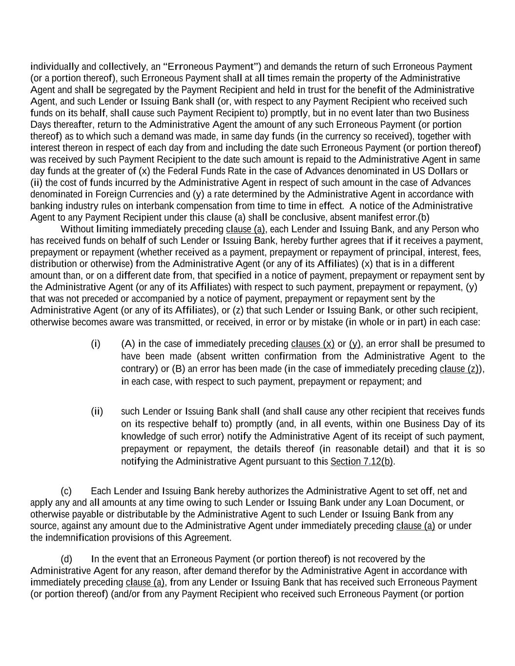 individually and collectively, an “Erroneous Payment”) and demands the return of such Erroneous Payment (or a portion thereof), such Erroneous Payment shall at all times remain the property of the Administrative Agent and shall be segregated by the Payment Recipient and held in trust for the benefit of the Administrative Agent, and such Lender or Issuing Bank shall (or, with respect to any Payment Recipient who received such funds on its behalf, shall cause such Payment Recipient to) promptly, but in no event later than two Business Days thereafter, return to the Administrative Agent the amount of any such Erroneous Payment (or portion thereof) as to which such a demand was made, in same day funds (in the currency so received), together with interest thereon in respect of each day from and including the date such Erroneous Payment (or portion thereof) was received by such Payment Recipient to the date such amount is repaid to the Administrative Agent in same day funds at the greater of (x) the Federal Funds Rate in the case of Advances denominated in US Dollars or (ii) the cost of funds incurred by the Administrative Agent in respect of such amount in the case of Advances denominated in Foreign Currencies and (y) a rate determined by the Administrative Agent in accordance with banking industry rules on interbank compensation from time to time in effect. A notice of the Administrative Agent to any Payment Recipient under this clause (a) shall be conclusive, absent manifest error.(b) Without limiting immediately preceding clause (a), each Lender and Issuing Bank, and any Person who has received funds on behalf of such Lender or Issuing Bank, hereby further agrees that if it receives a payment, prepayment or repayment (whether received as a payment, prepayment or repayment of principal, interest, fees, distribution or otherwise) from the Administrative Agent (or any of its Affiliates) (x) that is in a different amount than, or on a different date from, that specified in a notice of payment, prepayment or repayment sent by the Administrative Agent (or any of its Affiliates) with respect to such payment, prepayment or repayment, (y) that was not preceded or accompanied by a notice of payment, prepayment or repayment sent by the Administrative Agent (or any of its Affiliates), or (z) that such Lender or Issuing Bank, or other such recipient, otherwise becomes aware was transmitted, or received, in error or by mistake (in whole or in part) in each case: (i) (A) in the case of immediately preceding clauses (x) or (y), an error shall be presumed to have been made (absent written confirmation from the Administrative Agent to the contrary) or (B) an error has been made (in the case of immediately preceding clause (z)), in each case, with respect to such payment, prepayment or repayment; and (ii) such Lender or Issuing Bank shall (and shall cause any other recipient that receives funds on its respective behalf to) promptly (and, in all events, within one Business Day of its knowledge of such error) notify the Administrative Agent of its receipt of such payment, prepayment or repayment, the details thereof (in reasonable detail) and that it is so notifying the Administrative Agent pursuant to this Section 7.12(b). (c) Each Lender and Issuing Bank hereby authorizes the Administrative Agent to set off, net and apply any and all amounts at any time owing to such Lender or Issuing Bank under any Loan Document, or otherwise payable or distributable by the Administrative Agent to such Lender or Issuing Bank from any source, against any amount due to the Administrative Agent under immediately preceding clause (a) or under the indemnification provisions of this Agreement. (d) In the event that an Erroneous Payment (or portion thereof) is not recovered by the Administrative Agent for any reason, after demand therefor by the Administrative Agent in accordance with immediately preceding clause (a), from any Lender or Issuing Bank that has received such Erroneous Payment (or portion thereof) (and/or from any Payment Recipient who received such Erroneous Payment (or portion