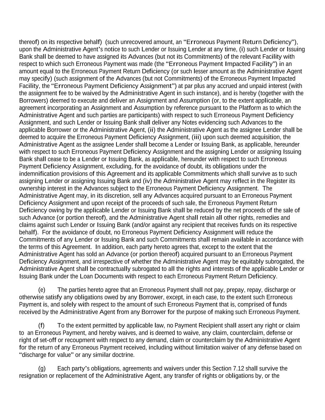 thereof) on its respective behalf) (such unrecovered amount, an “Erroneous Payment Return Deficiency”), upon the Administrative Agent’s notice to such Lender or Issuing Lender at any time, (i) such Lender or Issuing Bank shall be deemed to have assigned its Advances (but not its Commitments) of the relevant Facility with respect to which such Erroneous Payment was made (the “Erroneous Payment Impacted Facility”) in an amount equal to the Erroneous Payment Return Deficiency (or such lesser amount as the Administrative Agent may specify) (such assignment of the Advances (but not Commitments) of the Erroneous Payment Impacted Facility, the “Erroneous Payment Deficiency Assignment”) at par plus any accrued and unpaid interest (with the assignment fee to be waived by the Administrative Agent in such instance), and is hereby (together with the Borrowers) deemed to execute and deliver an Assignment and Assumption (or, to the extent applicable, an agreement incorporating an Assignment and Assumption by reference pursuant to the Platform as to which the Administrative Agent and such parties are participants) with respect to such Erroneous Payment Deficiency Assignment, and such Lender or Issuing Bank shall deliver any Notes evidencing such Advances to the applicable Borrower or the Administrative Agent, (ii) the Administrative Agent as the assignee Lender shall be deemed to acquire the Erroneous Payment Deficiency Assignment, (iii) upon such deemed acquisition, the Administrative Agent as the assignee Lender shall become a Lender or Issuing Bank, as applicable, hereunder with respect to such Erroneous Payment Deficiency Assignment and the assigning Lender or assigning Issuing Bank shall cease to be a Lender or Issuing Bank, as applicable, hereunder with respect to such Erroneous Payment Deficiency Assignment, excluding, for the avoidance of doubt, its obligations under the indemnification provisions of this Agreement and its applicable Commitments which shall survive as to such assigning Lender or assigning Issuing Bank and (iv) the Administrative Agent may reflect in the Register its ownership interest in the Advances subject to the Erroneous Payment Deficiency Assignment. The Administrative Agent may, in its discretion, sell any Advances acquired pursuant to an Erroneous Payment Deficiency Assignment and upon receipt of the proceeds of such sale, the Erroneous Payment Return Deficiency owing by the applicable Lender or Issuing Bank shall be reduced by the net proceeds of the sale of such Advance (or portion thereof), and the Administrative Agent shall retain all other rights, remedies and claims against such Lender or Issuing Bank (and/or against any recipient that receives funds on its respective behalf). For the avoidance of doubt, no Erroneous Payment Deficiency Assignment will reduce the Commitments of any Lender or Issuing Bank and such Commitments shall remain available in accordance with the terms of this Agreement. In addition, each party hereto agrees that, except to the extent that the Administrative Agent has sold an Advance (or portion thereof) acquired pursuant to an Erroneous Payment Deficiency Assignment, and irrespective of whether the Administrative Agent may be equitably subrogated, the Administrative Agent shall be contractually subrogated to all the rights and interests of the applicable Lender or Issuing Bank under the Loan Documents with respect to each Erroneous Payment Return Deficiency. (e) The parties hereto agree that an Erroneous Payment shall not pay, prepay, repay, discharge or otherwise satisfy any obligations owed by any Borrower, except, in each case, to the extent such Erroneous Payment is, and solely with respect to the amount of such Erroneous Payment that is, comprised of funds received by the Administrative Agent from any Borrower for the purpose of making such Erroneous Payment. (f) To the extent permitted by applicable law, no Payment Recipient shall assert any right or claim to an Erroneous Payment, and hereby waives, and is deemed to waive, any claim, counterclaim, defense or right of set-off or recoupment with respect to any demand, claim or counterclaim by the Administrative Agent for the return of any Erroneous Payment received, including without limitation waiver of any defense based on “discharge for value” or any similar doctrine. (g) Each party’s obligations, agreements and waivers under this Section 7.12 shall survive the resignation or replacement of the Administrative Agent, any transfer of rights or obligations by, or the