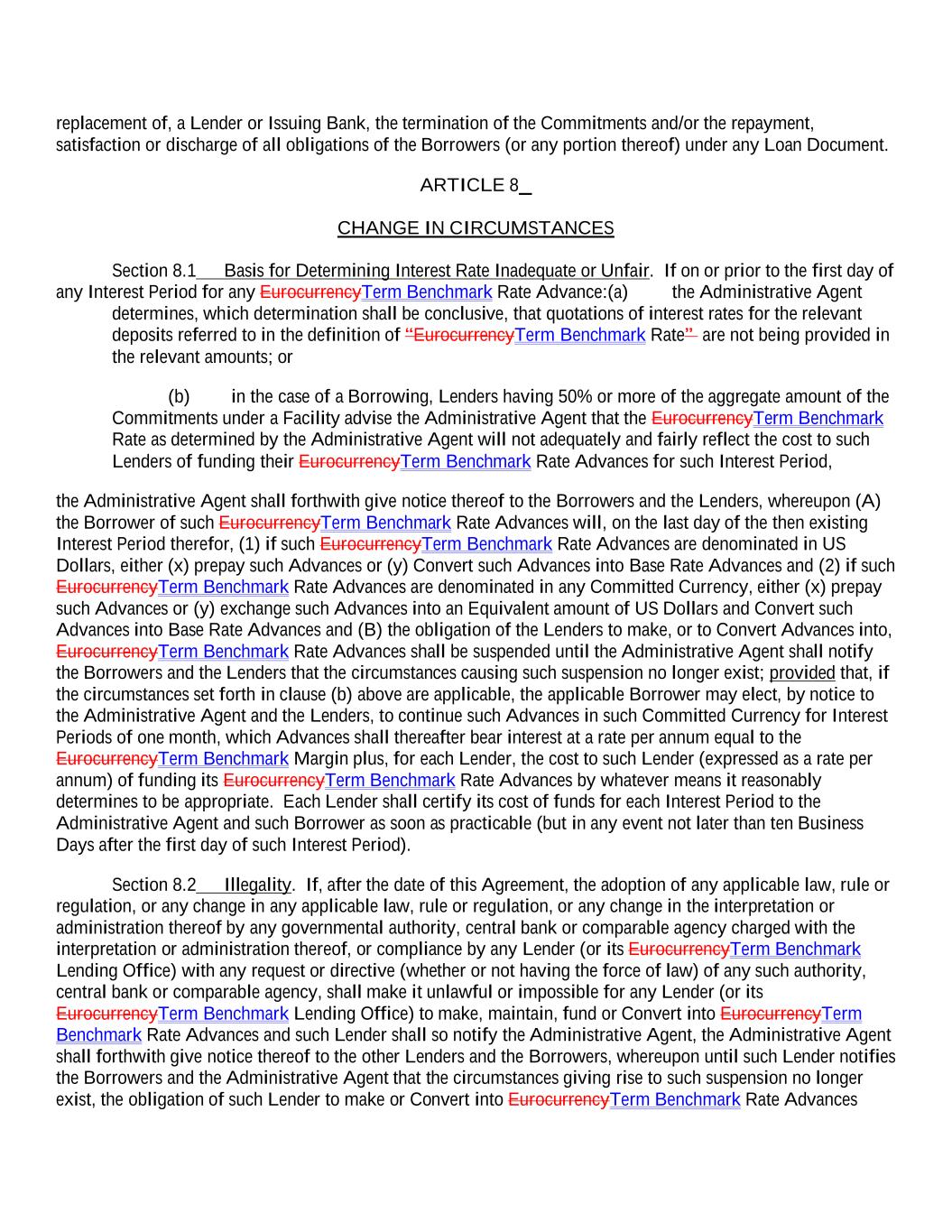 replacement of, a Lender or Issuing Bank, the termination of the Commitments and/or the repayment, satisfaction or discharge of all obligations of the Borrowers (or any portion thereof) under any Loan Document. ARTICLE 8 CHANGE IN CIRCUMSTANCES Section 8.1 Basis for Determining Interest Rate Inadequate or Unfair. If on or prior to the first day of any Interest Period for any EurocurrencyTerm Benchmark Rate Advance:(a) the Administrative Agent determines, which determination shall be conclusive, that quotations of interest rates for the relevant deposits referred to in the definition of “EurocurrencyTerm Benchmark Rate” are not being provided in the relevant amounts; or (b) in the case of a Borrowing, Lenders having 50% or more of the aggregate amount of the Commitments under a Facility advise the Administrative Agent that the EurocurrencyTerm Benchmark Rate as determined by the Administrative Agent will not adequately and fairly reflect the cost to such Lenders of funding their EurocurrencyTerm Benchmark Rate Advances for such Interest Period, the Administrative Agent shall forthwith give notice thereof to the Borrowers and the Lenders, whereupon (A) the Borrower of such EurocurrencyTerm Benchmark Rate Advances will, on the last day of the then existing Interest Period therefor, (1) if such EurocurrencyTerm Benchmark Rate Advances are denominated in US Dollars, either (x) prepay such Advances or (y) Convert such Advances into Base Rate Advances and (2) if such EurocurrencyTerm Benchmark Rate Advances are denominated in any Committed Currency, either (x) prepay such Advances or (y) exchange such Advances into an Equivalent amount of US Dollars and Convert such Advances into Base Rate Advances and (B) the obligation of the Lenders to make, or to Convert Advances into, EurocurrencyTerm Benchmark Rate Advances shall be suspended until the Administrative Agent shall notify the Borrowers and the Lenders that the circumstances causing such suspension no longer exist; provided that, if the circumstances set forth in clause (b) above are applicable, the applicable Borrower may elect, by notice to the Administrative Agent and the Lenders, to continue such Advances in such Committed Currency for Interest Periods of one month, which Advances shall thereafter bear interest at a rate per annum equal to the EurocurrencyTerm Benchmark Margin plus, for each Lender, the cost to such Lender (expressed as a rate per annum) of funding its EurocurrencyTerm Benchmark Rate Advances by whatever means it reasonably determines to be appropriate. Each Lender shall certify its cost of funds for each Interest Period to the Administrative Agent and such Borrower as soon as practicable (but in any event not later than ten Business Days after the first day of such Interest Period). Section 8.2 Illegality. If, after the date of this Agreement, the adoption of any applicable law, rule or regulation, or any change in any applicable law, rule or regulation, or any change in the interpretation or administration thereof by any governmental authority, central bank or comparable agency charged with the interpretation or administration thereof, or compliance by any Lender (or its EurocurrencyTerm Benchmark Lending Office) with any request or directive (whether or not having the force of law) of any such authority, central bank or comparable agency, shall make it unlawful or impossible for any Lender (or its EurocurrencyTerm Benchmark Lending Office) to make, maintain, fund or Convert into EurocurrencyTerm Benchmark Rate Advances and such Lender shall so notify the Administrative Agent, the Administrative Agent shall forthwith give notice thereof to the other Lenders and the Borrowers, whereupon until such Lender notifies the Borrowers and the Administrative Agent that the circumstances giving rise to such suspension no longer exist, the obligation of such Lender to make or Convert into EurocurrencyTerm Benchmark Rate Advances