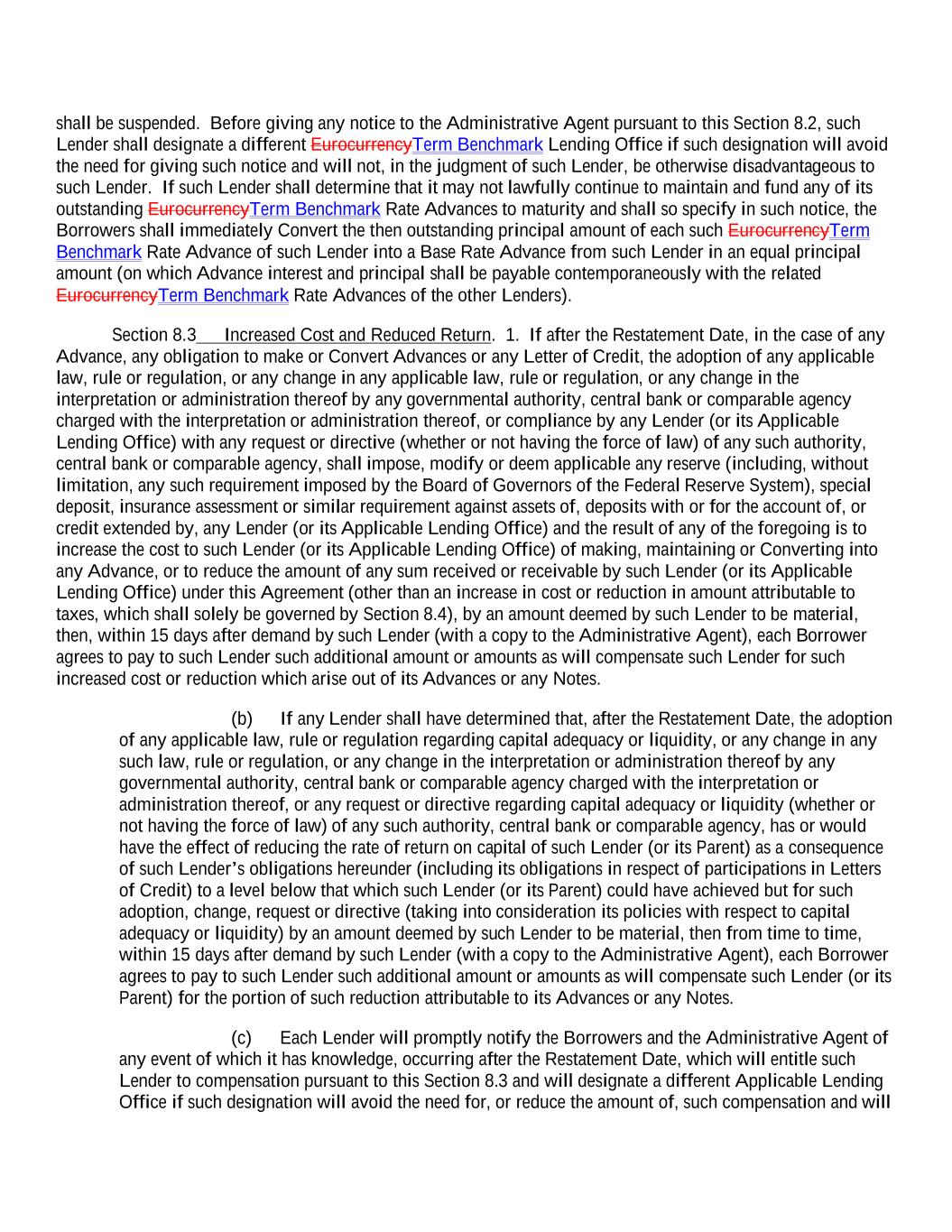 shall be suspended. Before giving any notice to the Administrative Agent pursuant to this Section 8.2, such Lender shall designate a different EurocurrencyTerm Benchmark Lending Office if such designation will avoid the need for giving such notice and will not, in the judgment of such Lender, be otherwise disadvantageous to such Lender. If such Lender shall determine that it may not lawfully continue to maintain and fund any of its outstanding EurocurrencyTerm Benchmark Rate Advances to maturity and shall so specify in such notice, the Borrowers shall immediately Convert the then outstanding principal amount of each such EurocurrencyTerm Benchmark Rate Advance of such Lender into a Base Rate Advance from such Lender in an equal principal amount (on which Advance interest and principal shall be payable contemporaneously with the related EurocurrencyTerm Benchmark Rate Advances of the other Lenders). Section 8.3 Increased Cost and Reduced Return. 1. If after the Restatement Date, in the case of any Advance, any obligation to make or Convert Advances or any Letter of Credit, the adoption of any applicable law, rule or regulation, or any change in any applicable law, rule or regulation, or any change in the interpretation or administration thereof by any governmental authority, central bank or comparable agency charged with the interpretation or administration thereof, or compliance by any Lender (or its Applicable Lending Office) with any request or directive (whether or not having the force of law) of any such authority, central bank or comparable agency, shall impose, modify or deem applicable any reserve (including, without limitation, any such requirement imposed by the Board of Governors of the Federal Reserve System), special deposit, insurance assessment or similar requirement against assets of, deposits with or for the account of, or credit extended by, any Lender (or its Applicable Lending Office) and the result of any of the foregoing is to increase the cost to such Lender (or its Applicable Lending Office) of making, maintaining or Converting into any Advance, or to reduce the amount of any sum received or receivable by such Lender (or its Applicable Lending Office) under this Agreement (other than an increase in cost or reduction in amount attributable to taxes, which shall solely be governed by Section 8.4), by an amount deemed by such Lender to be material, then, within 15 days after demand by such Lender (with a copy to the Administrative Agent), each Borrower agrees to pay to such Lender such additional amount or amounts as will compensate such Lender for such increased cost or reduction which arise out of its Advances or any Notes. (b) If any Lender shall have determined that, after the Restatement Date, the adoption of any applicable law, rule or regulation regarding capital adequacy or liquidity, or any change in any such law, rule or regulation, or any change in the interpretation or administration thereof by any governmental authority, central bank or comparable agency charged with the interpretation or administration thereof, or any request or directive regarding capital adequacy or liquidity (whether or not having the force of law) of any such authority, central bank or comparable agency, has or would have the effect of reducing the rate of return on capital of such Lender (or its Parent) as a consequence of such Lender’s obligations hereunder (including its obligations in respect of participations in Letters of Credit) to a level below that which such Lender (or its Parent) could have achieved but for such adoption, change, request or directive (taking into consideration its policies with respect to capital adequacy or liquidity) by an amount deemed by such Lender to be material, then from time to time, within 15 days after demand by such Lender (with a copy to the Administrative Agent), each Borrower agrees to pay to such Lender such additional amount or amounts as will compensate such Lender (or its Parent) for the portion of such reduction attributable to its Advances or any Notes. (c) Each Lender will promptly notify the Borrowers and the Administrative Agent of any event of which it has knowledge, occurring after the Restatement Date, which will entitle such Lender to compensation pursuant to this Section 8.3 and will designate a different Applicable Lending Office if such designation will avoid the need for, or reduce the amount of, such compensation and will
