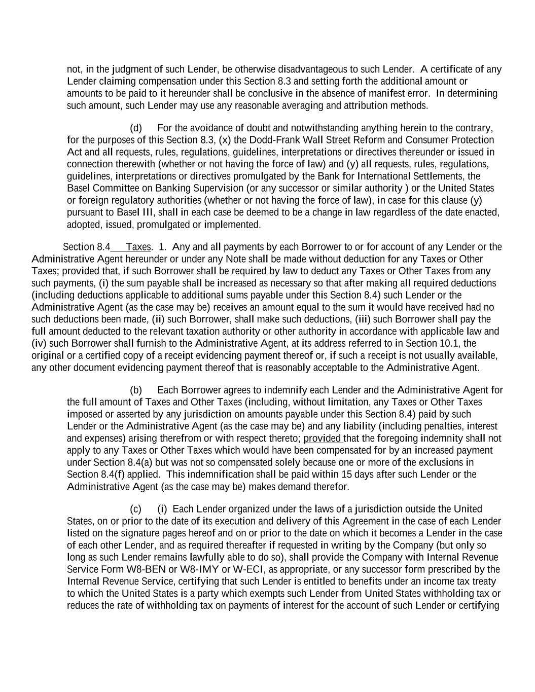 not, in the judgment of such Lender, be otherwise disadvantageous to such Lender. A certificate of any Lender claiming compensation under this Section 8.3 and setting forth the additional amount or amounts to be paid to it hereunder shall be conclusive in the absence of manifest error. In determining such amount, such Lender may use any reasonable averaging and attribution methods. (d) For the avoidance of doubt and notwithstanding anything herein to the contrary, for the purposes of this Section 8.3, (x) the Dodd-Frank Wall Street Reform and Consumer Protection Act and all requests, rules, regulations, guidelines, interpretations or directives thereunder or issued in connection therewith (whether or not having the force of law) and (y) all requests, rules, regulations, guidelines, interpretations or directives promulgated by the Bank for International Settlements, the Basel Committee on Banking Supervision (or any successor or similar authority ) or the United States or foreign regulatory authorities (whether or not having the force of law), in case for this clause (y) pursuant to Basel III, shall in each case be deemed to be a change in law regardless of the date enacted, adopted, issued, promulgated or implemented. Section 8.4 Taxes. 1. Any and all payments by each Borrower to or for account of any Lender or the Administrative Agent hereunder or under any Note shall be made without deduction for any Taxes or Other Taxes; provided that, if such Borrower shall be required by law to deduct any Taxes or Other Taxes from any such payments, (i) the sum payable shall be increased as necessary so that after making all required deductions (including deductions applicable to additional sums payable under this Section 8.4) such Lender or the Administrative Agent (as the case may be) receives an amount equal to the sum it would have received had no such deductions been made, (ii) such Borrower, shall make such deductions, (iii) such Borrower shall pay the full amount deducted to the relevant taxation authority or other authority in accordance with applicable law and (iv) such Borrower shall furnish to the Administrative Agent, at its address referred to in Section 10.1, the original or a certified copy of a receipt evidencing payment thereof or, if such a receipt is not usually available, any other document evidencing payment thereof that is reasonably acceptable to the Administrative Agent. (b) Each Borrower agrees to indemnify each Lender and the Administrative Agent for the full amount of Taxes and Other Taxes (including, without limitation, any Taxes or Other Taxes imposed or asserted by any jurisdiction on amounts payable under this Section 8.4) paid by such Lender or the Administrative Agent (as the case may be) and any liability (including penalties, interest and expenses) arising therefrom or with respect thereto; provided that the foregoing indemnity shall not apply to any Taxes or Other Taxes which would have been compensated for by an increased payment under Section 8.4(a) but was not so compensated solely because one or more of the exclusions in Section 8.4(f) applied. This indemnification shall be paid within 15 days after such Lender or the Administrative Agent (as the case may be) makes demand therefor. (c) (i) Each Lender organized under the laws of a jurisdiction outside the United States, on or prior to the date of its execution and delivery of this Agreement in the case of each Lender listed on the signature pages hereof and on or prior to the date on which it becomes a Lender in the case of each other Lender, and as required thereafter if requested in writing by the Company (but only so long as such Lender remains lawfully able to do so), shall provide the Company with Internal Revenue Service Form W8-BEN or W8-IMY or W-ECI, as appropriate, or any successor form prescribed by the Internal Revenue Service, certifying that such Lender is entitled to benefits under an income tax treaty to which the United States is a party which exempts such Lender from United States withholding tax or reduces the rate of withholding tax on payments of interest for the account of such Lender or certifying