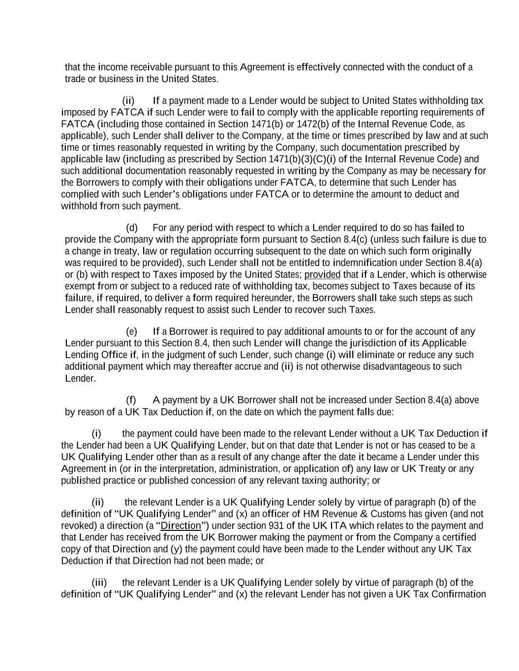 that the income receivable pursuant to this Agreement is effectively connected with the conduct of a trade or business in the United States. (ii) If a payment made to a Lender would be subject to United States withholding tax imposed by FATCA if such Lender were to fail to comply with the applicable reporting requirements of FATCA (including those contained in Section 1471(b) or 1472(b) of the Internal Revenue Code, as applicable), such Lender shall deliver to the Company, at the time or times prescribed by law and at such time or times reasonably requested in writing by the Company, such documentation prescribed by applicable law (including as prescribed by Section 1471(b)(3)(C)(i) of the Internal Revenue Code) and such additional documentation reasonably requested in writing by the Company as may be necessary for the Borrowers to comply with their obligations under FATCA, to determine that such Lender has complied with such Lender’s obligations under FATCA or to determine the amount to deduct and withhold from such payment. (d) For any period with respect to which a Lender required to do so has failed to provide the Company with the appropriate form pursuant to Section 8.4(c) (unless such failure is due to a change in treaty, law or regulation occurring subsequent to the date on which such form originally was required to be provided), such Lender shall not be entitled to indemnification under Section 8.4(a) or (b) with respect to Taxes imposed by the United States; provided that if a Lender, which is otherwise exempt from or subject to a reduced rate of withholding tax, becomes subject to Taxes because of its failure, if required, to deliver a form required hereunder, the Borrowers shall take such steps as such Lender shall reasonably request to assist such Lender to recover such Taxes. (e) If a Borrower is required to pay additional amounts to or for the account of any Lender pursuant to this Section 8.4, then such Lender will change the jurisdiction of its Applicable Lending Office if, in the judgment of such Lender, such change (i) will eliminate or reduce any such additional payment which may thereafter accrue and (ii) is not otherwise disadvantageous to such Lender. (f) A payment by a UK Borrower shall not be increased under Section 8.4(a) above by reason of a UK Tax Deduction if, on the date on which the payment falls due: (i) the payment could have been made to the relevant Lender without a UK Tax Deduction if the Lender had been a UK Qualifying Lender, but on that date that Lender is not or has ceased to be a UK Qualifying Lender other than as a result of any change after the date it became a Lender under this Agreement in (or in the interpretation, administration, or application of) any law or UK Treaty or any published practice or published concession of any relevant taxing authority; or (ii) the relevant Lender is a UK Qualifying Lender solely by virtue of paragraph (b) of the definition of “UK Qualifying Lender” and (x) an officer of HM Revenue & Customs has given (and not revoked) a direction (a “Direction”) under section 931 of the UK ITA which relates to the payment and that Lender has received from the UK Borrower making the payment or from the Company a certified copy of that Direction and (y) the payment could have been made to the Lender without any UK Tax Deduction if that Direction had not been made; or (iii) the relevant Lender is a UK Qualifying Lender solely by virtue of paragraph (b) of the definition of “UK Qualifying Lender” and (x) the relevant Lender has not given a UK Tax Confirmation