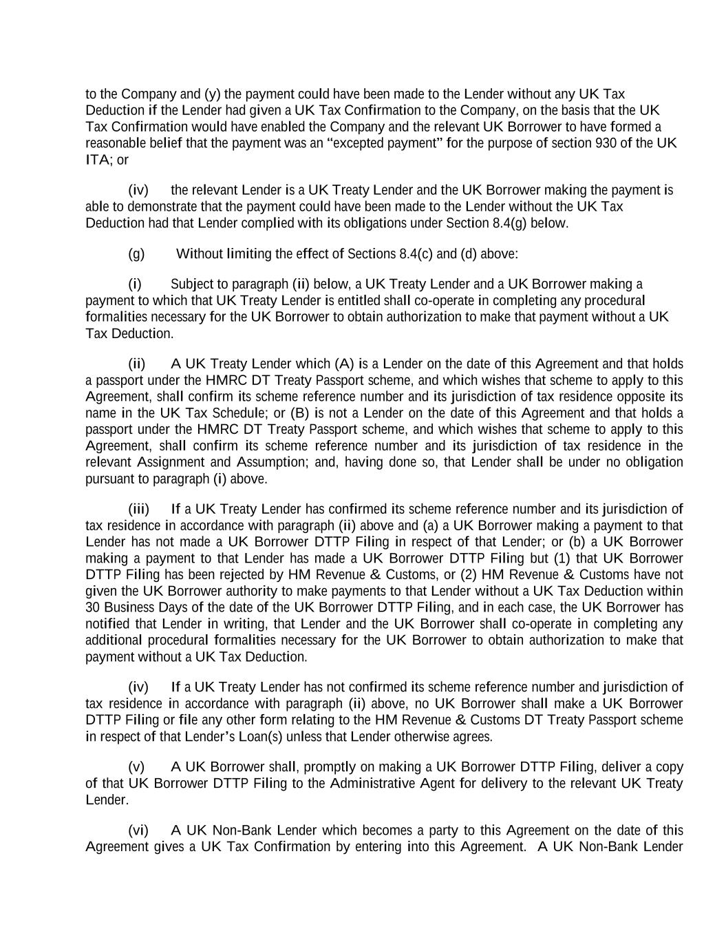 to the Company and (y) the payment could have been made to the Lender without any UK Tax Deduction if the Lender had given a UK Tax Confirmation to the Company, on the basis that the UK Tax Confirmation would have enabled the Company and the relevant UK Borrower to have formed a reasonable belief that the payment was an “excepted payment” for the purpose of section 930 of the UK ITA; or (iv) the relevant Lender is a UK Treaty Lender and the UK Borrower making the payment is able to demonstrate that the payment could have been made to the Lender without the UK Tax Deduction had that Lender complied with its obligations under Section 8.4(g) below. (g) Without limiting the effect of Sections 8.4(c) and (d) above: (i) Subject to paragraph (ii) below, a UK Treaty Lender and a UK Borrower making a payment to which that UK Treaty Lender is entitled shall co-operate in completing any procedural formalities necessary for the UK Borrower to obtain authorization to make that payment without a UK Tax Deduction. (ii) A UK Treaty Lender which (A) is a Lender on the date of this Agreement and that holds a passport under the HMRC DT Treaty Passport scheme, and which wishes that scheme to apply to this Agreement, shall confirm its scheme reference number and its jurisdiction of tax residence opposite its name in the UK Tax Schedule; or (B) is not a Lender on the date of this Agreement and that holds a passport under the HMRC DT Treaty Passport scheme, and which wishes that scheme to apply to this Agreement, shall confirm its scheme reference number and its jurisdiction of tax residence in the relevant Assignment and Assumption; and, having done so, that Lender shall be under no obligation pursuant to paragraph (i) above. (iii) If a UK Treaty Lender has confirmed its scheme reference number and its jurisdiction of tax residence in accordance with paragraph (ii) above and (a) a UK Borrower making a payment to that Lender has not made a UK Borrower DTTP Filing in respect of that Lender; or (b) a UK Borrower making a payment to that Lender has made a UK Borrower DTTP Filing but (1) that UK Borrower DTTP Filing has been rejected by HM Revenue & Customs, or (2) HM Revenue & Customs have not given the UK Borrower authority to make payments to that Lender without a UK Tax Deduction within 30 Business Days of the date of the UK Borrower DTTP Filing, and in each case, the UK Borrower has notified that Lender in writing, that Lender and the UK Borrower shall co-operate in completing any additional procedural formalities necessary for the UK Borrower to obtain authorization to make that payment without a UK Tax Deduction. (iv) If a UK Treaty Lender has not confirmed its scheme reference number and jurisdiction of tax residence in accordance with paragraph (ii) above, no UK Borrower shall make a UK Borrower DTTP Filing or file any other form relating to the HM Revenue & Customs DT Treaty Passport scheme in respect of that Lender’s Loan(s) unless that Lender otherwise agrees. (v) A UK Borrower shall, promptly on making a UK Borrower DTTP Filing, deliver a copy of that UK Borrower DTTP Filing to the Administrative Agent for delivery to the relevant UK Treaty Lender. (vi) A UK Non-Bank Lender which becomes a party to this Agreement on the date of this Agreement gives a UK Tax Confirmation by entering into this Agreement. A UK Non-Bank Lender
