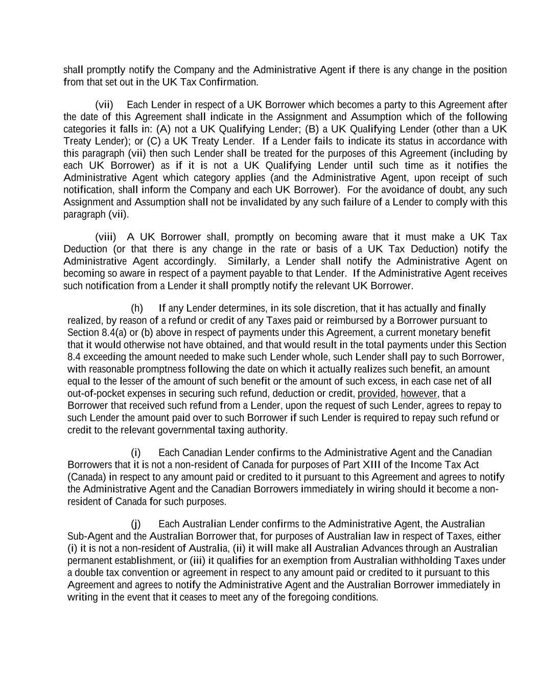 shall promptly notify the Company and the Administrative Agent if there is any change in the position from that set out in the UK Tax Confirmation. (vii) Each Lender in respect of a UK Borrower which becomes a party to this Agreement after the date of this Agreement shall indicate in the Assignment and Assumption which of the following categories it falls in: (A) not a UK Qualifying Lender; (B) a UK Qualifying Lender (other than a UK Treaty Lender); or (C) a UK Treaty Lender. If a Lender fails to indicate its status in accordance with this paragraph (vii) then such Lender shall be treated for the purposes of this Agreement (including by each UK Borrower) as if it is not a UK Qualifying Lender until such time as it notifies the Administrative Agent which category applies (and the Administrative Agent, upon receipt of such notification, shall inform the Company and each UK Borrower). For the avoidance of doubt, any such Assignment and Assumption shall not be invalidated by any such failure of a Lender to comply with this paragraph (vii). (viii) A UK Borrower shall, promptly on becoming aware that it must make a UK Tax Deduction (or that there is any change in the rate or basis of a UK Tax Deduction) notify the Administrative Agent accordingly. Similarly, a Lender shall notify the Administrative Agent on becoming so aware in respect of a payment payable to that Lender. If the Administrative Agent receives such notification from a Lender it shall promptly notify the relevant UK Borrower. (h) If any Lender determines, in its sole discretion, that it has actually and finally realized, by reason of a refund or credit of any Taxes paid or reimbursed by a Borrower pursuant to Section 8.4(a) or (b) above in respect of payments under this Agreement, a current monetary benefit that it would otherwise not have obtained, and that would result in the total payments under this Section 8.4 exceeding the amount needed to make such Lender whole, such Lender shall pay to such Borrower, with reasonable promptness following the date on which it actually realizes such benefit, an amount equal to the lesser of the amount of such benefit or the amount of such excess, in each case net of all out-of-pocket expenses in securing such refund, deduction or credit, provided, however, that a Borrower that received such refund from a Lender, upon the request of such Lender, agrees to repay to such Lender the amount paid over to such Borrower if such Lender is required to repay such refund or credit to the relevant governmental taxing authority. (i) Each Canadian Lender confirms to the Administrative Agent and the Canadian Borrowers that it is not a non-resident of Canada for purposes of Part XIII of the Income Tax Act (Canada) in respect to any amount paid or credited to it pursuant to this Agreement and agrees to notify the Administrative Agent and the Canadian Borrowers immediately in wiring should it become a non- resident of Canada for such purposes. (j) Each Australian Lender confirms to the Administrative Agent, the Australian Sub-Agent and the Australian Borrower that, for purposes of Australian law in respect of Taxes, either (i) it is not a non-resident of Australia, (ii) it will make all Australian Advances through an Australian permanent establishment, or (iii) it qualifies for an exemption from Australian withholding Taxes under a double tax convention or agreement in respect to any amount paid or credited to it pursuant to this Agreement and agrees to notify the Administrative Agent and the Australian Borrower immediately in writing in the event that it ceases to meet any of the foregoing conditions.