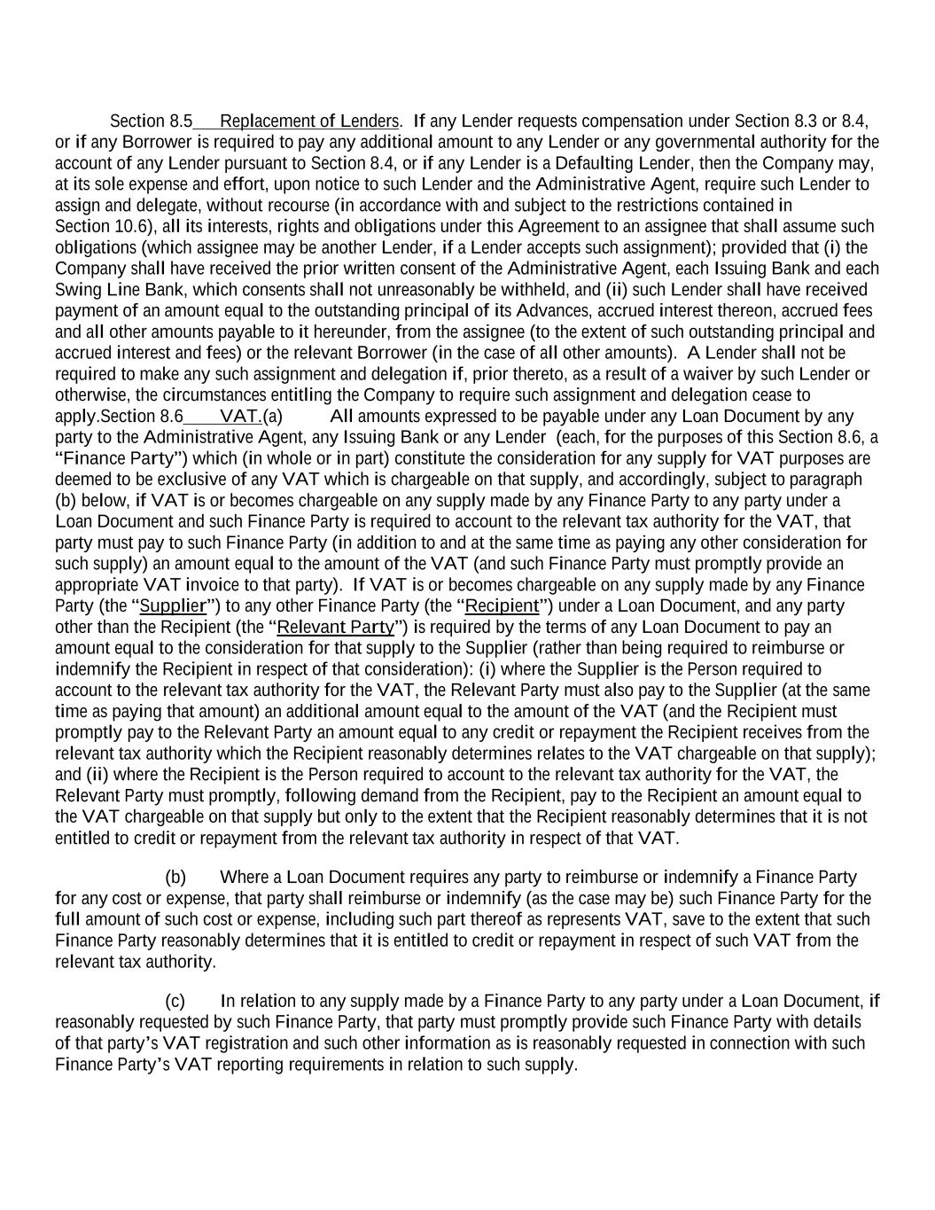 Section 8.5 Replacement of Lenders. If any Lender requests compensation under Section 8.3 or 8.4, or if any Borrower is required to pay any additional amount to any Lender or any governmental authority for the account of any Lender pursuant to Section 8.4, or if any Lender is a Defaulting Lender, then the Company may, at its sole expense and effort, upon notice to such Lender and the Administrative Agent, require such Lender to assign and delegate, without recourse (in accordance with and subject to the restrictions contained in Section 10.6), all its interests, rights and obligations under this Agreement to an assignee that shall assume such obligations (which assignee may be another Lender, if a Lender accepts such assignment); provided that (i) the Company shall have received the prior written consent of the Administrative Agent, each Issuing Bank and each Swing Line Bank, which consents shall not unreasonably be withheld, and (ii) such Lender shall have received payment of an amount equal to the outstanding principal of its Advances, accrued interest thereon, accrued fees and all other amounts payable to it hereunder, from the assignee (to the extent of such outstanding principal and accrued interest and fees) or the relevant Borrower (in the case of all other amounts). A Lender shall not be required to make any such assignment and delegation if, prior thereto, as a result of a waiver by such Lender or otherwise, the circumstances entitling the Company to require such assignment and delegation cease to apply.Section 8.6 VAT.(a) All amounts expressed to be payable under any Loan Document by any party to the Administrative Agent, any Issuing Bank or any Lender (each, for the purposes of this Section 8.6, a “Finance Party”) which (in whole or in part) constitute the consideration for any supply for VAT purposes are deemed to be exclusive of any VAT which is chargeable on that supply, and accordingly, subject to paragraph (b) below, if VAT is or becomes chargeable on any supply made by any Finance Party to any party under a Loan Document and such Finance Party is required to account to the relevant tax authority for the VAT, that party must pay to such Finance Party (in addition to and at the same time as paying any other consideration for such supply) an amount equal to the amount of the VAT (and such Finance Party must promptly provide an appropriate VAT invoice to that party). If VAT is or becomes chargeable on any supply made by any Finance Party (the “Supplier”) to any other Finance Party (the “Recipient”) under a Loan Document, and any party other than the Recipient (the “Relevant Party”) is required by the terms of any Loan Document to pay an amount equal to the consideration for that supply to the Supplier (rather than being required to reimburse or indemnify the Recipient in respect of that consideration): (i) where the Supplier is the Person required to account to the relevant tax authority for the VAT, the Relevant Party must also pay to the Supplier (at the same time as paying that amount) an additional amount equal to the amount of the VAT (and the Recipient must promptly pay to the Relevant Party an amount equal to any credit or repayment the Recipient receives from the relevant tax authority which the Recipient reasonably determines relates to the VAT chargeable on that supply); and (ii) where the Recipient is the Person required to account to the relevant tax authority for the VAT, the Relevant Party must promptly, following demand from the Recipient, pay to the Recipient an amount equal to the VAT chargeable on that supply but only to the extent that the Recipient reasonably determines that it is not entitled to credit or repayment from the relevant tax authority in respect of that VAT. (b) Where a Loan Document requires any party to reimburse or indemnify a Finance Party for any cost or expense, that party shall reimburse or indemnify (as the case may be) such Finance Party for the full amount of such cost or expense, including such part thereof as represents VAT, save to the extent that such Finance Party reasonably determines that it is entitled to credit or repayment in respect of such VAT from the relevant tax authority. (c) In relation to any supply made by a Finance Party to any party under a Loan Document, if reasonably requested by such Finance Party, that party must promptly provide such Finance Party with details of that party’s VAT registration and such other information as is reasonably requested in connection with such Finance Party’s VAT reporting requirements in relation to such supply.