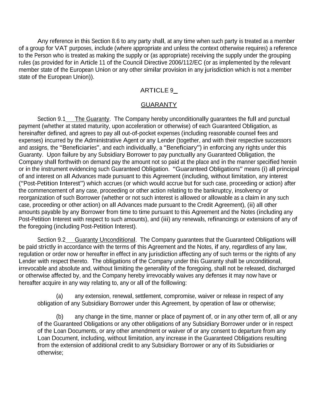 Any reference in this Section 8.6 to any party shall, at any time when such party is treated as a member of a group for VAT purposes, include (where appropriate and unless the context otherwise requires) a reference to the Person who is treated as making the supply or (as appropriate) receiving the supply under the grouping rules (as provided for in Article 11 of the Council Directive 2006/112/EC (or as implemented by the relevant member state of the European Union or any other similar provision in any jurisdiction which is not a member state of the European Union)). ARTICLE 9 GUARANTY Section 9.1 The Guaranty. The Company hereby unconditionally guarantees the full and punctual payment (whether at stated maturity, upon acceleration or otherwise) of each Guaranteed Obligation, as hereinafter defined, and agrees to pay all out-of-pocket expenses (including reasonable counsel fees and expenses) incurred by the Administrative Agent or any Lender (together, and with their respective successors and assigns, the “Beneficiaries”, and each individually, a “Beneficiary”) in enforcing any rights under this Guaranty. Upon failure by any Subsidiary Borrower to pay punctually any Guaranteed Obligation, the Company shall forthwith on demand pay the amount not so paid at the place and in the manner specified herein or in the instrument evidencing such Guaranteed Obligation. “Guaranteed Obligations” means (i) all principal of and interest on all Advances made pursuant to this Agreement (including, without limitation, any interest (“Post-Petition Interest”) which accrues (or which would accrue but for such case, proceeding or action) after the commencement of any case, proceeding or other action relating to the bankruptcy, insolvency or reorganization of such Borrower (whether or not such interest is allowed or allowable as a claim in any such case, proceeding or other action) on all Advances made pursuant to the Credit Agreement), (ii) all other amounts payable by any Borrower from time to time pursuant to this Agreement and the Notes (including any Post-Petition Interest with respect to such amounts), and (iii) any renewals, refinancings or extensions of any of the foregoing (including Post-Petition Interest). Section 9.2 Guaranty Unconditional. The Company guarantees that the Guaranteed Obligations will be paid strictly in accordance with the terms of this Agreement and the Notes, if any, regardless of any law, regulation or order now or hereafter in effect in any jurisdiction affecting any of such terms or the rights of any Lender with respect thereto. The obligations of the Company under this Guaranty shall be unconditional, irrevocable and absolute and, without limiting the generality of the foregoing, shall not be released, discharged or otherwise affected by, and the Company hereby irrevocably waives any defenses it may now have or hereafter acquire in any way relating to, any or all of the following: (a) any extension, renewal, settlement, compromise, waiver or release in respect of any obligation of any Subsidiary Borrower under this Agreement, by operation of law or otherwise; (b) any change in the time, manner or place of payment of, or in any other term of, all or any of the Guaranteed Obligations or any other obligations of any Subsidiary Borrower under or in respect of the Loan Documents, or any other amendment or waiver of or any consent to departure from any Loan Document, including, without limitation, any increase in the Guaranteed Obligations resulting from the extension of additional credit to any Subsidiary Borrower or any of its Subsidiaries or otherwise;