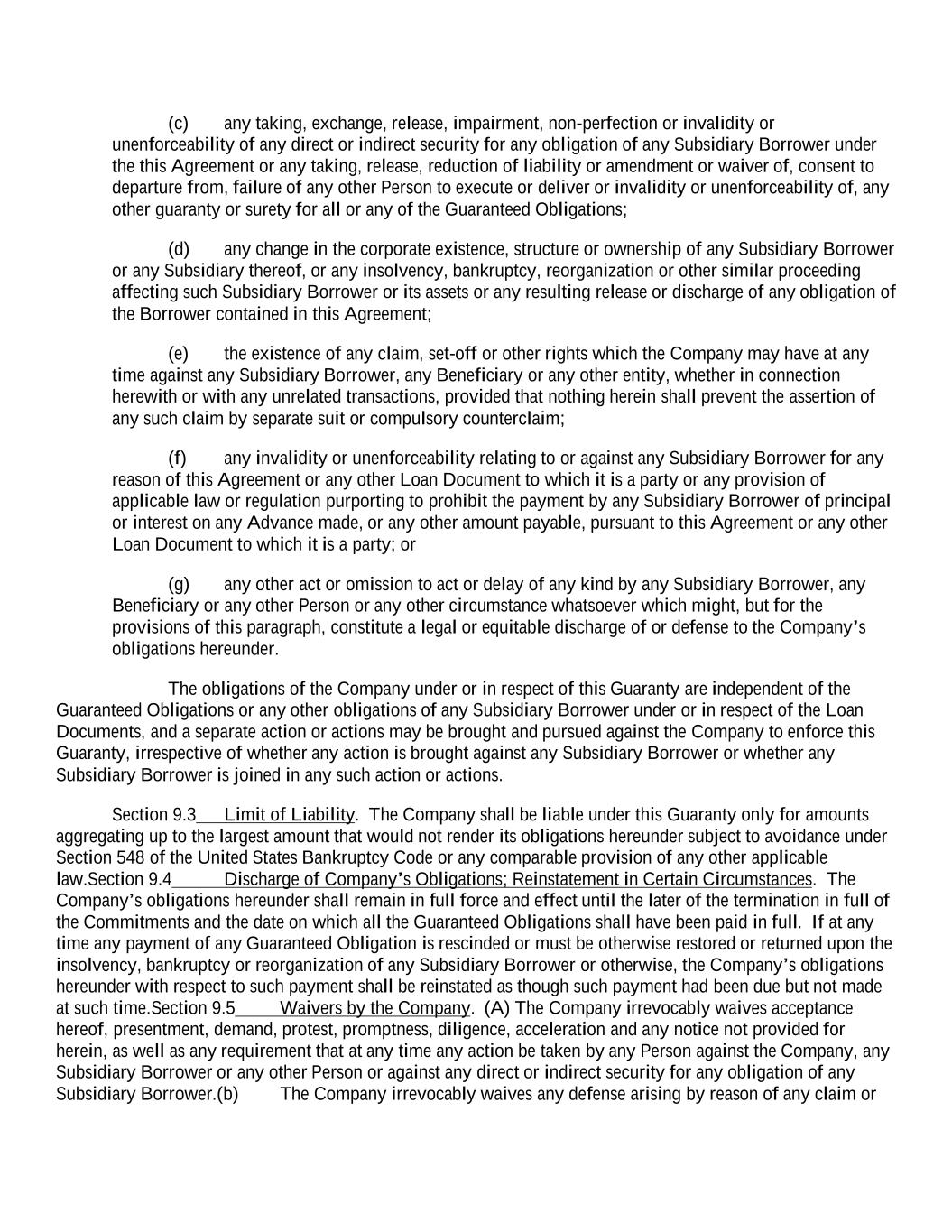 (c) any taking, exchange, release, impairment, non-perfection or invalidity or unenforceability of any direct or indirect security for any obligation of any Subsidiary Borrower under the this Agreement or any taking, release, reduction of liability or amendment or waiver of, consent to departure from, failure of any other Person to execute or deliver or invalidity or unenforceability of, any other guaranty or surety for all or any of the Guaranteed Obligations; (d) any change in the corporate existence, structure or ownership of any Subsidiary Borrower or any Subsidiary thereof, or any insolvency, bankruptcy, reorganization or other similar proceeding affecting such Subsidiary Borrower or its assets or any resulting release or discharge of any obligation of the Borrower contained in this Agreement; (e) the existence of any claim, set-off or other rights which the Company may have at any time against any Subsidiary Borrower, any Beneficiary or any other entity, whether in connection herewith or with any unrelated transactions, provided that nothing herein shall prevent the assertion of any such claim by separate suit or compulsory counterclaim; (f) any invalidity or unenforceability relating to or against any Subsidiary Borrower for any reason of this Agreement or any other Loan Document to which it is a party or any provision of applicable law or regulation purporting to prohibit the payment by any Subsidiary Borrower of principal or interest on any Advance made, or any other amount payable, pursuant to this Agreement or any other Loan Document to which it is a party; or (g) any other act or omission to act or delay of any kind by any Subsidiary Borrower, any Beneficiary or any other Person or any other circumstance whatsoever which might, but for the provisions of this paragraph, constitute a legal or equitable discharge of or defense to the Company’s obligations hereunder. The obligations of the Company under or in respect of this Guaranty are independent of the Guaranteed Obligations or any other obligations of any Subsidiary Borrower under or in respect of the Loan Documents, and a separate action or actions may be brought and pursued against the Company to enforce this Guaranty, irrespective of whether any action is brought against any Subsidiary Borrower or whether any Subsidiary Borrower is joined in any such action or actions. Section 9.3 Limit of Liability. The Company shall be liable under this Guaranty only for amounts aggregating up to the largest amount that would not render its obligations hereunder subject to avoidance under Section 548 of the United States Bankruptcy Code or any comparable provision of any other applicable law.Section 9.4 Discharge of Company’s Obligations; Reinstatement in Certain Circumstances. The Company’s obligations hereunder shall remain in full force and effect until the later of the termination in full of the Commitments and the date on which all the Guaranteed Obligations shall have been paid in full. If at any time any payment of any Guaranteed Obligation is rescinded or must be otherwise restored or returned upon the insolvency, bankruptcy or reorganization of any Subsidiary Borrower or otherwise, the Company’s obligations hereunder with respect to such payment shall be reinstated as though such payment had been due but not made at such time.Section 9.5 Waivers by the Company. (A) The Company irrevocably waives acceptance hereof, presentment, demand, protest, promptness, diligence, acceleration and any notice not provided for herein, as well as any requirement that at any time any action be taken by any Person against the Company, any Subsidiary Borrower or any other Person or against any direct or indirect security for any obligation of any Subsidiary Borrower.(b) The Company irrevocably waives any defense arising by reason of any claim or