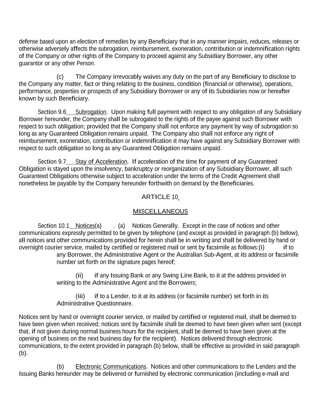 defense based upon an election of remedies by any Beneficiary that in any manner impairs, reduces, releases or otherwise adversely affects the subrogation, reimbursement, exoneration, contribution or indemnification rights of the Company or other rights of the Company to proceed against any Subsidiary Borrower, any other guarantor or any other Person. (c) The Company irrevocably waives any duty on the part of any Beneficiary to disclose to the Company any matter, fact or thing relating to the business, condition (financial or otherwise), operations, performance, properties or prospects of any Subsidiary Borrower or any of its Subsidiaries now or hereafter known by such Beneficiary. Section 9.6 Subrogation. Upon making full payment with respect to any obligation of any Subsidiary Borrower hereunder, the Company shall be subrogated to the rights of the payee against such Borrower with respect to such obligation; provided that the Company shall not enforce any payment by way of subrogation so long as any Guaranteed Obligation remains unpaid. The Company also shall not enforce any right of reimbursement, exoneration, contribution or indemnification it may have against any Subsidiary Borrower with respect to such obligation so long as any Guaranteed Obligation remains unpaid. Section 9.7 Stay of Acceleration. If acceleration of the time for payment of any Guaranteed Obligation is stayed upon the insolvency, bankruptcy or reorganization of any Subsidiary Borrower, all such Guaranteed Obligations otherwise subject to acceleration under the terms of the Credit Agreement shall nonetheless be payable by the Company hereunder forthwith on demand by the Beneficiaries. ARTICLE 10 MISCELLANEOUS Section 10.1 Notices(a) . (a) Notices Generally. Except in the case of notices and other communications expressly permitted to be given by telephone (and except as provided in paragraph (b) below), all notices and other communications provided for herein shall be in writing and shall be delivered by hand or overnight courier service, mailed by certified or registered mail or sent by facsimile as follows:(i) if to any Borrower, the Administrative Agent or the Australian Sub-Agent, at its address or facsimile number set forth on the signature pages hereof; (ii) if any Issuing Bank or any Swing Line Bank, to it at the address provided in writing to the Administrative Agent and the Borrowers; (iii) if to a Lender, to it at its address (or facsimile number) set forth in its Administrative Questionnaire. Notices sent by hand or overnight courier service, or mailed by certified or registered mail, shall be deemed to have been given when received; notices sent by facsimile shall be deemed to have been given when sent (except that, if not given during normal business hours for the recipient, shall be deemed to have been given at the opening of business on the next business day for the recipient). Notices delivered through electronic communications, to the extent provided in paragraph (b) below, shall be effective as provided in said paragraph (b). (b) Electronic Communications. Notices and other communications to the Lenders and the Issuing Banks hereunder may be delivered or furnished by electronic communication (including e-mail and