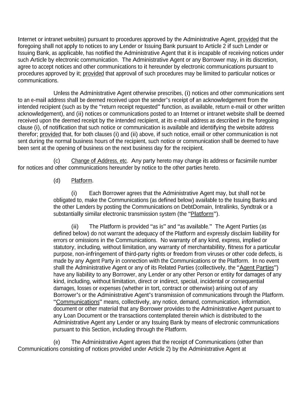 Internet or intranet websites) pursuant to procedures approved by the Administrative Agent, provided that the foregoing shall not apply to notices to any Lender or Issuing Bank pursuant to Article 2 if such Lender or Issuing Bank, as applicable, has notified the Administrative Agent that it is incapable of receiving notices under such Article by electronic communication. The Administrative Agent or any Borrower may, in its discretion, agree to accept notices and other communications to it hereunder by electronic communications pursuant to procedures approved by it; provided that approval of such procedures may be limited to particular notices or communications. Unless the Administrative Agent otherwise prescribes, (i) notices and other communications sent to an e-mail address shall be deemed received upon the sender’s receipt of an acknowledgement from the intended recipient (such as by the “return receipt requested” function, as available, return e-mail or other written acknowledgement), and (ii) notices or communications posted to an Internet or intranet website shall be deemed received upon the deemed receipt by the intended recipient, at its e-mail address as described in the foregoing clause (i), of notification that such notice or communication is available and identifying the website address therefor; provided that, for both clauses (i) and (ii) above, if such notice, email or other communication is not sent during the normal business hours of the recipient, such notice or communication shall be deemed to have been sent at the opening of business on the next business day for the recipient. (c) Change of Address, etc. Any party hereto may change its address or facsimile number for notices and other communications hereunder by notice to the other parties hereto. (d) Platform. (i) Each Borrower agrees that the Administrative Agent may, but shall not be obligated to, make the Communications (as defined below) available to the Issuing Banks and the other Lenders by posting the Communications on DebtDomain, Intralinks, Syndtrak or a substantially similar electronic transmission system (the “Platform”). (ii) The Platform is provided “as is” and “as available.” The Agent Parties (as defined below) do not warrant the adequacy of the Platform and expressly disclaim liability for errors or omissions in the Communications. No warranty of any kind, express, implied or statutory, including, without limitation, any warranty of merchantability, fitness for a particular purpose, non-infringement of third-party rights or freedom from viruses or other code defects, is made by any Agent Party in connection with the Communications or the Platform. In no event shall the Administrative Agent or any of its Related Parties (collectively, the “Agent Parties”) have any liability to any Borrower, any Lender or any other Person or entity for damages of any kind, including, without limitation, direct or indirect, special, incidental or consequential damages, losses or expenses (whether in tort, contract or otherwise) arising out of any Borrower’s or the Administrative Agent’s transmission of communications through the Platform. “Communications” means, collectively, any notice, demand, communication, information, document or other material that any Borrower provides to the Administrative Agent pursuant to any Loan Document or the transactions contemplated therein which is distributed to the Administrative Agent any Lender or any Issuing Bank by means of electronic communications pursuant to this Section, including through the Platform. (e) The Administrative Agent agrees that the receipt of Communications (other than Communications consisting of notices provided under Article 2) by the Administrative Agent at