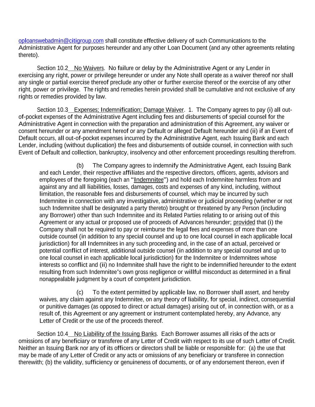 oploanswebadmin@citigroup.com shall constitute effective delivery of such Communications to the Administrative Agent for purposes hereunder and any other Loan Document (and any other agreements relating thereto). Section 10.2 No Waivers. No failure or delay by the Administrative Agent or any Lender in exercising any right, power or privilege hereunder or under any Note shall operate as a waiver thereof nor shall any single or partial exercise thereof preclude any other or further exercise thereof or the exercise of any other right, power or privilege. The rights and remedies herein provided shall be cumulative and not exclusive of any rights or remedies provided by law. Section 10.3 Expenses; Indemnification; Damage Waiver. 1. The Company agrees to pay (i) all out- of-pocket expenses of the Administrative Agent including fees and disbursements of special counsel for the Administrative Agent in connection with the preparation and administration of this Agreement, any waiver or consent hereunder or any amendment hereof or any Default or alleged Default hereunder and (ii) if an Event of Default occurs, all out-of-pocket expenses incurred by the Administrative Agent, each Issuing Bank and each Lender, including (without duplication) the fees and disbursements of outside counsel, in connection with such Event of Default and collection, bankruptcy, insolvency and other enforcement proceedings resulting therefrom. (b) The Company agrees to indemnify the Administrative Agent, each Issuing Bank and each Lender, their respective affiliates and the respective directors, officers, agents, advisors and employees of the foregoing (each an “Indemnitee”) and hold each Indemnitee harmless from and against any and all liabilities, losses, damages, costs and expenses of any kind, including, without limitation, the reasonable fees and disbursements of counsel, which may be incurred by such Indemnitee in connection with any investigative, administrative or judicial proceeding (whether or not such Indemnitee shall be designated a party thereto) brought or threatened by any Person (including any Borrower) other than such Indemnitee and its Related Parties relating to or arising out of this Agreement or any actual or proposed use of proceeds of Advances hereunder; provided that (i) the Company shall not be required to pay or reimburse the legal fees and expenses of more than one outside counsel (in addition to any special counsel and up to one local counsel in each applicable local jurisdiction) for all Indemnitees in any such proceeding and, in the case of an actual, perceived or potential conflict of interest, additional outside counsel (in addition to any special counsel and up to one local counsel in each applicable local jurisdiction) for the Indemnitee or Indemnitees whose interests so conflict and (ii) no Indemnitee shall have the right to be indemnified hereunder to the extent resulting from such Indemnitee’s own gross negligence or willful misconduct as determined in a final nonappealable judgment by a court of competent jurisdiction. (c) To the extent permitted by applicable law, no Borrower shall assert, and hereby waives, any claim against any Indemnitee, on any theory of liability, for special, indirect, consequential or punitive damages (as opposed to direct or actual damages) arising out of, in connection with, or as a result of, this Agreement or any agreement or instrument contemplated hereby, any Advance, any Letter of Credit or the use of the proceeds thereof. Section 10.4 No Liability of the Issuing Banks. Each Borrower assumes all risks of the acts or omissions of any beneficiary or transferee of any Letter of Credit with respect to its use of such Letter of Credit. Neither an Issuing Bank nor any of its officers or directors shall be liable or responsible for: (a) the use that may be made of any Letter of Credit or any acts or omissions of any beneficiary or transferee in connection therewith; (b) the validity, sufficiency or genuineness of documents, or of any endorsement thereon, even if