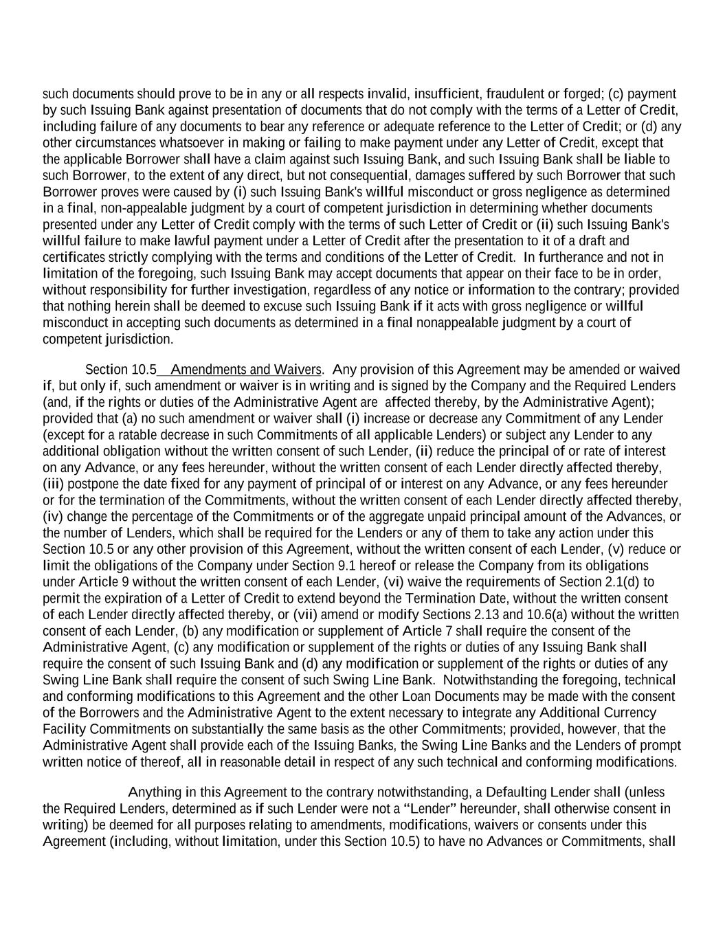 such documents should prove to be in any or all respects invalid, insufficient, fraudulent or forged; (c) payment by such Issuing Bank against presentation of documents that do not comply with the terms of a Letter of Credit, including failure of any documents to bear any reference or adequate reference to the Letter of Credit; or (d) any other circumstances whatsoever in making or failing to make payment under any Letter of Credit, except that the applicable Borrower shall have a claim against such Issuing Bank, and such Issuing Bank shall be liable to such Borrower, to the extent of any direct, but not consequential, damages suffered by such Borrower that such Borrower proves were caused by (i) such Issuing Bank's willful misconduct or gross negligence as determined in a final, non-appealable judgment by a court of competent jurisdiction in determining whether documents presented under any Letter of Credit comply with the terms of such Letter of Credit or (ii) such Issuing Bank's willful failure to make lawful payment under a Letter of Credit after the presentation to it of a draft and certificates strictly complying with the terms and conditions of the Letter of Credit. In furtherance and not in limitation of the foregoing, such Issuing Bank may accept documents that appear on their face to be in order, without responsibility for further investigation, regardless of any notice or information to the contrary; provided that nothing herein shall be deemed to excuse such Issuing Bank if it acts with gross negligence or willful misconduct in accepting such documents as determined in a final nonappealable judgment by a court of competent jurisdiction. Section 10.5 Amendments and Waivers. Any provision of this Agreement may be amended or waived if, but only if, such amendment or waiver is in writing and is signed by the Company and the Required Lenders (and, if the rights or duties of the Administrative Agent are affected thereby, by the Administrative Agent); provided that (a) no such amendment or waiver shall (i) increase or decrease any Commitment of any Lender (except for a ratable decrease in such Commitments of all applicable Lenders) or subject any Lender to any additional obligation without the written consent of such Lender, (ii) reduce the principal of or rate of interest on any Advance, or any fees hereunder, without the written consent of each Lender directly affected thereby, (iii) postpone the date fixed for any payment of principal of or interest on any Advance, or any fees hereunder or for the termination of the Commitments, without the written consent of each Lender directly affected thereby, (iv) change the percentage of the Commitments or of the aggregate unpaid principal amount of the Advances, or the number of Lenders, which shall be required for the Lenders or any of them to take any action under this Section 10.5 or any other provision of this Agreement, without the written consent of each Lender, (v) reduce or limit the obligations of the Company under Section 9.1 hereof or release the Company from its obligations under Article 9 without the written consent of each Lender, (vi) waive the requirements of Section 2.1(d) to permit the expiration of a Letter of Credit to extend beyond the Termination Date, without the written consent of each Lender directly affected thereby, or (vii) amend or modify Sections 2.13 and 10.6(a) without the written consent of each Lender, (b) any modification or supplement of Article 7 shall require the consent of the Administrative Agent, (c) any modification or supplement of the rights or duties of any Issuing Bank shall require the consent of such Issuing Bank and (d) any modification or supplement of the rights or duties of any Swing Line Bank shall require the consent of such Swing Line Bank. Notwithstanding the foregoing, technical and conforming modifications to this Agreement and the other Loan Documents may be made with the consent of the Borrowers and the Administrative Agent to the extent necessary to integrate any Additional Currency Facility Commitments on substantially the same basis as the other Commitments; provided, however, that the Administrative Agent shall provide each of the Issuing Banks, the Swing Line Banks and the Lenders of prompt written notice of thereof, all in reasonable detail in respect of any such technical and conforming modifications. Anything in this Agreement to the contrary notwithstanding, a Defaulting Lender shall (unless the Required Lenders, determined as if such Lender were not a “Lender” hereunder, shall otherwise consent in writing) be deemed for all purposes relating to amendments, modifications, waivers or consents under this Agreement (including, without limitation, under this Section 10.5) to have no Advances or Commitments, shall