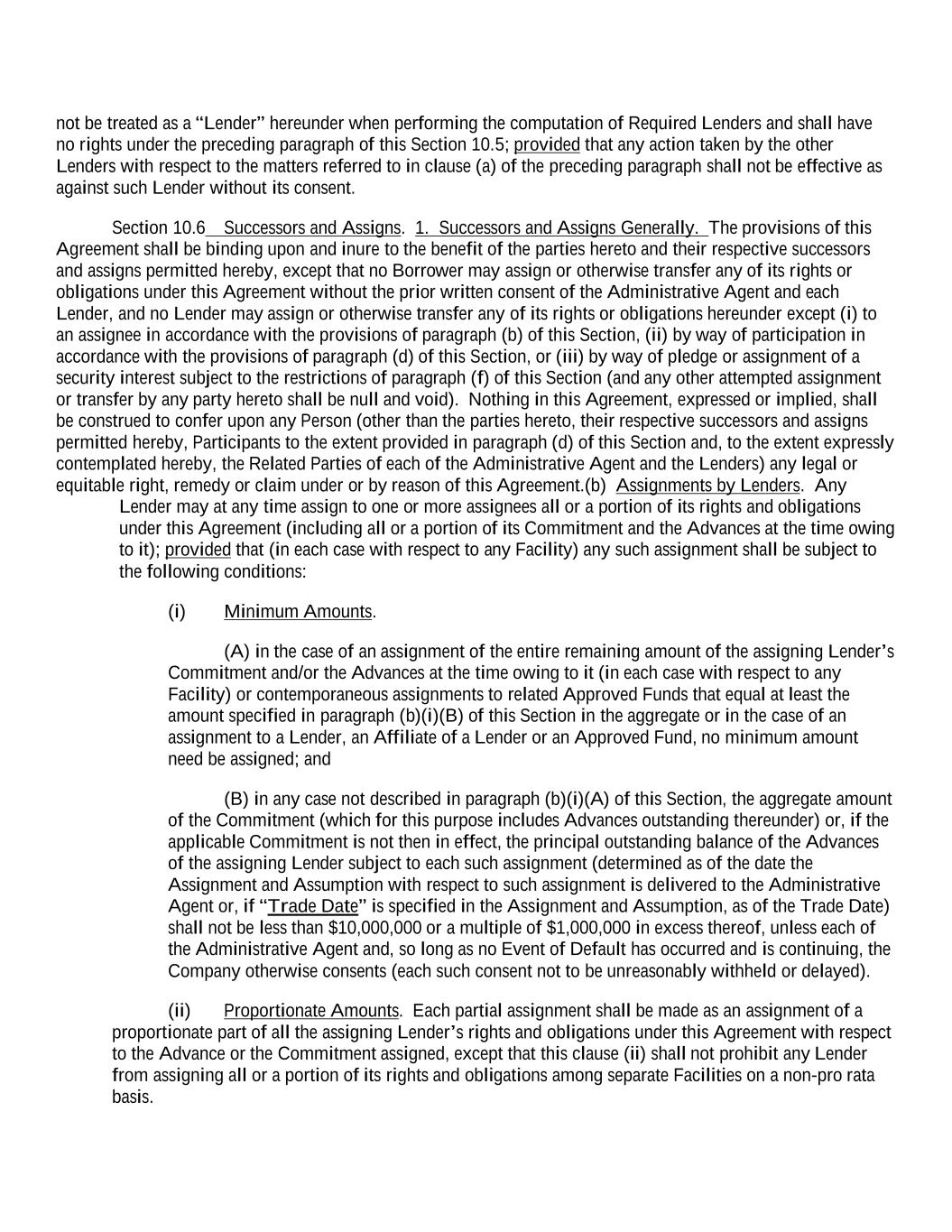 not be treated as a “Lender” hereunder when performing the computation of Required Lenders and shall have no rights under the preceding paragraph of this Section 10.5; provided that any action taken by the other Lenders with respect to the matters referred to in clause (a) of the preceding paragraph shall not be effective as against such Lender without its consent. Section 10.6 Successors and Assigns. 1. Successors and Assigns Generally. The provisions of this Agreement shall be binding upon and inure to the benefit of the parties hereto and their respective successors and assigns permitted hereby, except that no Borrower may assign or otherwise transfer any of its rights or obligations under this Agreement without the prior written consent of the Administrative Agent and each Lender, and no Lender may assign or otherwise transfer any of its rights or obligations hereunder except (i) to an assignee in accordance with the provisions of paragraph (b) of this Section, (ii) by way of participation in accordance with the provisions of paragraph (d) of this Section, or (iii) by way of pledge or assignment of a security interest subject to the restrictions of paragraph (f) of this Section (and any other attempted assignment or transfer by any party hereto shall be null and void). Nothing in this Agreement, expressed or implied, shall be construed to confer upon any Person (other than the parties hereto, their respective successors and assigns permitted hereby, Participants to the extent provided in paragraph (d) of this Section and, to the extent expressly contemplated hereby, the Related Parties of each of the Administrative Agent and the Lenders) any legal or equitable right, remedy or claim under or by reason of this Agreement.(b) Assignments by Lenders. Any Lender may at any time assign to one or more assignees all or a portion of its rights and obligations under this Agreement (including all or a portion of its Commitment and the Advances at the time owing to it); provided that (in each case with respect to any Facility) any such assignment shall be subject to the following conditions: (i) Minimum Amounts. (A) in the case of an assignment of the entire remaining amount of the assigning Lender’s Commitment and/or the Advances at the time owing to it (in each case with respect to any Facility) or contemporaneous assignments to related Approved Funds that equal at least the amount specified in paragraph (b)(i)(B) of this Section in the aggregate or in the case of an assignment to a Lender, an Affiliate of a Lender or an Approved Fund, no minimum amount need be assigned; and (B) in any case not described in paragraph (b)(i)(A) of this Section, the aggregate amount of the Commitment (which for this purpose includes Advances outstanding thereunder) or, if the applicable Commitment is not then in effect, the principal outstanding balance of the Advances of the assigning Lender subject to each such assignment (determined as of the date the Assignment and Assumption with respect to such assignment is delivered to the Administrative Agent or, if “Trade Date” is specified in the Assignment and Assumption, as of the Trade Date) shall not be less than $10,000,000 or a multiple of $1,000,000 in excess thereof, unless each of the Administrative Agent and, so long as no Event of Default has occurred and is continuing, the Company otherwise consents (each such consent not to be unreasonably withheld or delayed). (ii) Proportionate Amounts. Each partial assignment shall be made as an assignment of a proportionate part of all the assigning Lender’s rights and obligations under this Agreement with respect to the Advance or the Commitment assigned, except that this clause (ii) shall not prohibit any Lender from assigning all or a portion of its rights and obligations among separate Facilities on a non-pro rata basis.