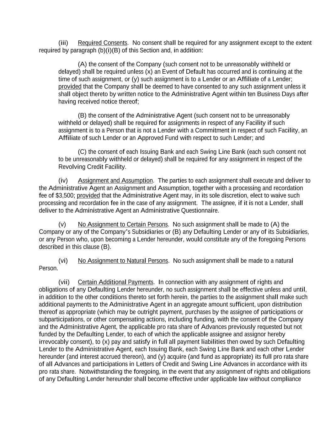 (iii) Required Consents. No consent shall be required for any assignment except to the extent required by paragraph (b)(i)(B) of this Section and, in addition: (A) the consent of the Company (such consent not to be unreasonably withheld or delayed) shall be required unless (x) an Event of Default has occurred and is continuing at the time of such assignment, or (y) such assignment is to a Lender or an Affiliate of a Lender; provided that the Company shall be deemed to have consented to any such assignment unless it shall object thereto by written notice to the Administrative Agent within ten Business Days after having received notice thereof; (B) the consent of the Administrative Agent (such consent not to be unreasonably withheld or delayed) shall be required for assignments in respect of any Facility if such assignment is to a Person that is not a Lender with a Commitment in respect of such Facility, an Affiliate of such Lender or an Approved Fund with respect to such Lender; and (C) the consent of each Issuing Bank and each Swing Line Bank (each such consent not to be unreasonably withheld or delayed) shall be required for any assignment in respect of the Revolving Credit Facility. (iv) Assignment and Assumption. The parties to each assignment shall execute and deliver to the Administrative Agent an Assignment and Assumption, together with a processing and recordation fee of $3,500; provided that the Administrative Agent may, in its sole discretion, elect to waive such processing and recordation fee in the case of any assignment. The assignee, if it is not a Lender, shall deliver to the Administrative Agent an Administrative Questionnaire. (v) No Assignment to Certain Persons. No such assignment shall be made to (A) the Company or any of the Company’s Subsidiaries or (B) any Defaulting Lender or any of its Subsidiaries, or any Person who, upon becoming a Lender hereunder, would constitute any of the foregoing Persons described in this clause (B). (vi) No Assignment to Natural Persons. No such assignment shall be made to a natural Person. (vii) Certain Additional Payments. In connection with any assignment of rights and obligations of any Defaulting Lender hereunder, no such assignment shall be effective unless and until, in addition to the other conditions thereto set forth herein, the parties to the assignment shall make such additional payments to the Administrative Agent in an aggregate amount sufficient, upon distribution thereof as appropriate (which may be outright payment, purchases by the assignee of participations or subparticipations, or other compensating actions, including funding, with the consent of the Company and the Administrative Agent, the applicable pro rata share of Advances previously requested but not funded by the Defaulting Lender, to each of which the applicable assignee and assignor hereby irrevocably consent), to (x) pay and satisfy in full all payment liabilities then owed by such Defaulting Lender to the Administrative Agent, each Issuing Bank, each Swing Line Bank and each other Lender hereunder (and interest accrued thereon), and (y) acquire (and fund as appropriate) its full pro rata share of all Advances and participations in Letters of Credit and Swing Line Advances in accordance with its pro rata share. Notwithstanding the foregoing, in the event that any assignment of rights and obligations of any Defaulting Lender hereunder shall become effective under applicable law without compliance