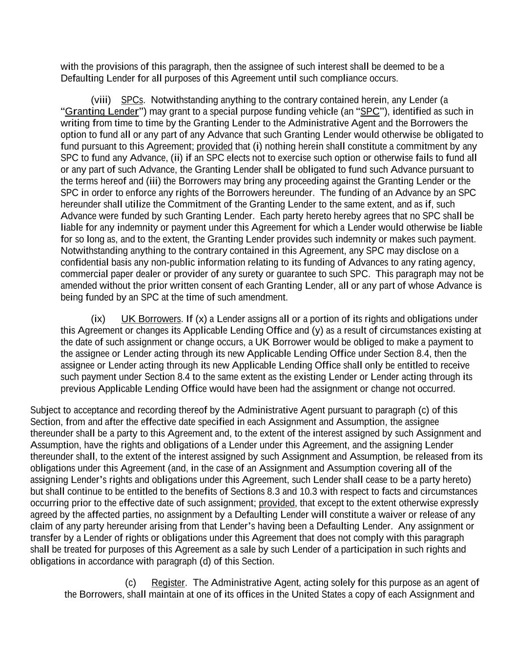 with the provisions of this paragraph, then the assignee of such interest shall be deemed to be a Defaulting Lender for all purposes of this Agreement until such compliance occurs. (viii) SPCs. Notwithstanding anything to the contrary contained herein, any Lender (a “Granting Lender”) may grant to a special purpose funding vehicle (an “SPC”), identified as such in writing from time to time by the Granting Lender to the Administrative Agent and the Borrowers the option to fund all or any part of any Advance that such Granting Lender would otherwise be obligated to fund pursuant to this Agreement; provided that (i) nothing herein shall constitute a commitment by any SPC to fund any Advance, (ii) if an SPC elects not to exercise such option or otherwise fails to fund all or any part of such Advance, the Granting Lender shall be obligated to fund such Advance pursuant to the terms hereof and (iii) the Borrowers may bring any proceeding against the Granting Lender or the SPC in order to enforce any rights of the Borrowers hereunder. The funding of an Advance by an SPC hereunder shall utilize the Commitment of the Granting Lender to the same extent, and as if, such Advance were funded by such Granting Lender. Each party hereto hereby agrees that no SPC shall be liable for any indemnity or payment under this Agreement for which a Lender would otherwise be liable for so long as, and to the extent, the Granting Lender provides such indemnity or makes such payment. Notwithstanding anything to the contrary contained in this Agreement, any SPC may disclose on a confidential basis any non-public information relating to its funding of Advances to any rating agency, commercial paper dealer or provider of any surety or guarantee to such SPC. This paragraph may not be amended without the prior written consent of each Granting Lender, all or any part of whose Advance is being funded by an SPC at the time of such amendment. (ix) UK Borrowers. If (x) a Lender assigns all or a portion of its rights and obligations under this Agreement or changes its Applicable Lending Office and (y) as a result of circumstances existing at the date of such assignment or change occurs, a UK Borrower would be obliged to make a payment to the assignee or Lender acting through its new Applicable Lending Office under Section 8.4, then the assignee or Lender acting through its new Applicable Lending Office shall only be entitled to receive such payment under Section 8.4 to the same extent as the existing Lender or Lender acting through its previous Applicable Lending Office would have been had the assignment or change not occurred. Subject to acceptance and recording thereof by the Administrative Agent pursuant to paragraph (c) of this Section, from and after the effective date specified in each Assignment and Assumption, the assignee thereunder shall be a party to this Agreement and, to the extent of the interest assigned by such Assignment and Assumption, have the rights and obligations of a Lender under this Agreement, and the assigning Lender thereunder shall, to the extent of the interest assigned by such Assignment and Assumption, be released from its obligations under this Agreement (and, in the case of an Assignment and Assumption covering all of the assigning Lender’s rights and obligations under this Agreement, such Lender shall cease to be a party hereto) but shall continue to be entitled to the benefits of Sections 8.3 and 10.3 with respect to facts and circumstances occurring prior to the effective date of such assignment; provided, that except to the extent otherwise expressly agreed by the affected parties, no assignment by a Defaulting Lender will constitute a waiver or release of any claim of any party hereunder arising from that Lender’s having been a Defaulting Lender. Any assignment or transfer by a Lender of rights or obligations under this Agreement that does not comply with this paragraph shall be treated for purposes of this Agreement as a sale by such Lender of a participation in such rights and obligations in accordance with paragraph (d) of this Section. (c) Register. The Administrative Agent, acting solely for this purpose as an agent of the Borrowers, shall maintain at one of its offices in the United States a copy of each Assignment and