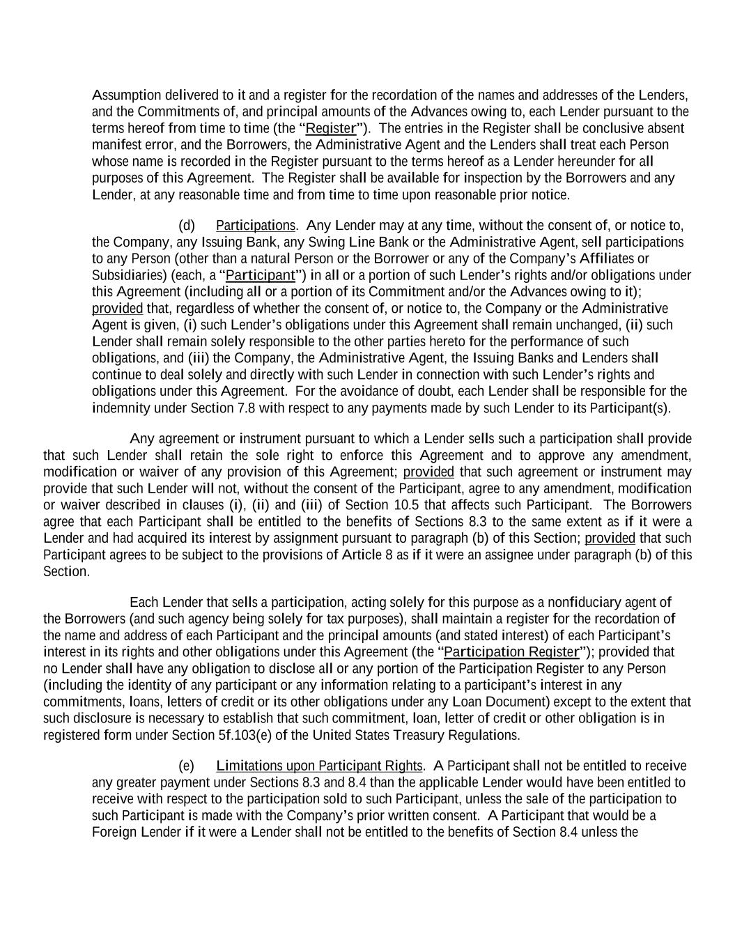 Assumption delivered to it and a register for the recordation of the names and addresses of the Lenders, and the Commitments of, and principal amounts of the Advances owing to, each Lender pursuant to the terms hereof from time to time (the “Register”). The entries in the Register shall be conclusive absent manifest error, and the Borrowers, the Administrative Agent and the Lenders shall treat each Person whose name is recorded in the Register pursuant to the terms hereof as a Lender hereunder for all purposes of this Agreement. The Register shall be available for inspection by the Borrowers and any Lender, at any reasonable time and from time to time upon reasonable prior notice. (d) Participations. Any Lender may at any time, without the consent of, or notice to, the Company, any Issuing Bank, any Swing Line Bank or the Administrative Agent, sell participations to any Person (other than a natural Person or the Borrower or any of the Company’s Affiliates or Subsidiaries) (each, a “Participant”) in all or a portion of such Lender’s rights and/or obligations under this Agreement (including all or a portion of its Commitment and/or the Advances owing to it); provided that, regardless of whether the consent of, or notice to, the Company or the Administrative Agent is given, (i) such Lender’s obligations under this Agreement shall remain unchanged, (ii) such Lender shall remain solely responsible to the other parties hereto for the performance of such obligations, and (iii) the Company, the Administrative Agent, the Issuing Banks and Lenders shall continue to deal solely and directly with such Lender in connection with such Lender’s rights and obligations under this Agreement. For the avoidance of doubt, each Lender shall be responsible for the indemnity under Section 7.8 with respect to any payments made by such Lender to its Participant(s). Any agreement or instrument pursuant to which a Lender sells such a participation shall provide that such Lender shall retain the sole right to enforce this Agreement and to approve any amendment, modification or waiver of any provision of this Agreement; provided that such agreement or instrument may provide that such Lender will not, without the consent of the Participant, agree to any amendment, modification or waiver described in clauses (i), (ii) and (iii) of Section 10.5 that affects such Participant. The Borrowers agree that each Participant shall be entitled to the benefits of Sections 8.3 to the same extent as if it were a Lender and had acquired its interest by assignment pursuant to paragraph (b) of this Section; provided that such Participant agrees to be subject to the provisions of Article 8 as if it were an assignee under paragraph (b) of this Section. Each Lender that sells a participation, acting solely for this purpose as a nonfiduciary agent of the Borrowers (and such agency being solely for tax purposes), shall maintain a register for the recordation of the name and address of each Participant and the principal amounts (and stated interest) of each Participant’s interest in its rights and other obligations under this Agreement (the “Participation Register”); provided that no Lender shall have any obligation to disclose all or any portion of the Participation Register to any Person (including the identity of any participant or any information relating to a participant’s interest in any commitments, loans, letters of credit or its other obligations under any Loan Document) except to the extent that such disclosure is necessary to establish that such commitment, loan, letter of credit or other obligation is in registered form under Section 5f.103(e) of the United States Treasury Regulations. (e) Limitations upon Participant Rights. A Participant shall not be entitled to receive any greater payment under Sections 8.3 and 8.4 than the applicable Lender would have been entitled to receive with respect to the participation sold to such Participant, unless the sale of the participation to such Participant is made with the Company’s prior written consent. A Participant that would be a Foreign Lender if it were a Lender shall not be entitled to the benefits of Section 8.4 unless the
