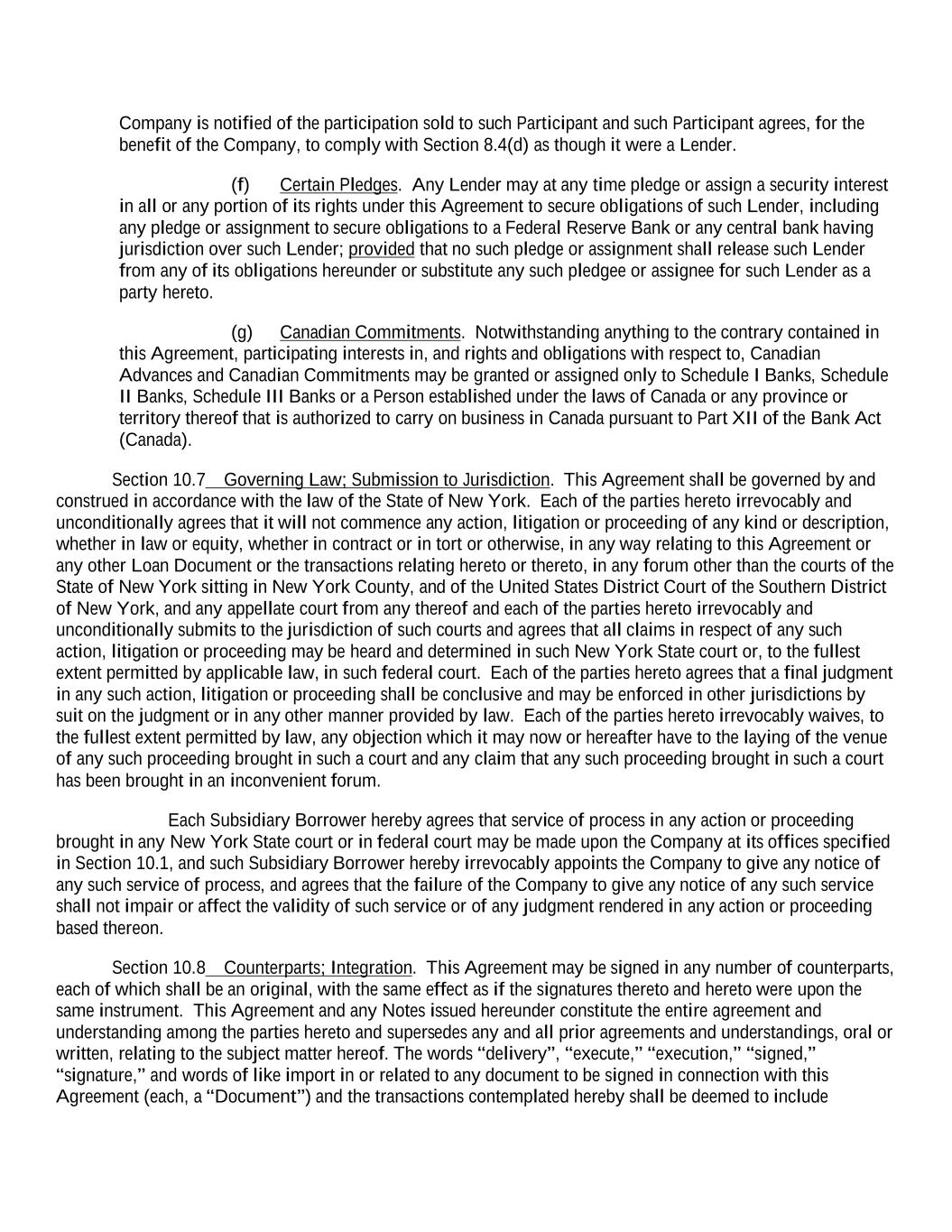 Company is notified of the participation sold to such Participant and such Participant agrees, for the benefit of the Company, to comply with Section 8.4(d) as though it were a Lender. (f) Certain Pledges. Any Lender may at any time pledge or assign a security interest in all or any portion of its rights under this Agreement to secure obligations of such Lender, including any pledge or assignment to secure obligations to a Federal Reserve Bank or any central bank having jurisdiction over such Lender; provided that no such pledge or assignment shall release such Lender from any of its obligations hereunder or substitute any such pledgee or assignee for such Lender as a party hereto. (g) Canadian Commitments. Notwithstanding anything to the contrary contained in this Agreement, participating interests in, and rights and obligations with respect to, Canadian Advances and Canadian Commitments may be granted or assigned only to Schedule I Banks, Schedule II Banks, Schedule III Banks or a Person established under the laws of Canada or any province or territory thereof that is authorized to carry on business in Canada pursuant to Part XII of the Bank Act (Canada). Section 10.7 Governing Law; Submission to Jurisdiction. This Agreement shall be governed by and construed in accordance with the law of the State of New York. Each of the parties hereto irrevocably and unconditionally agrees that it will not commence any action, litigation or proceeding of any kind or description, whether in law or equity, whether in contract or in tort or otherwise, in any way relating to this Agreement or any other Loan Document or the transactions relating hereto or thereto, in any forum other than the courts of the State of New York sitting in New York County, and of the United States District Court of the Southern District of New York, and any appellate court from any thereof and each of the parties hereto irrevocably and unconditionally submits to the jurisdiction of such courts and agrees that all claims in respect of any such action, litigation or proceeding may be heard and determined in such New York State court or, to the fullest extent permitted by applicable law, in such federal court. Each of the parties hereto agrees that a final judgment in any such action, litigation or proceeding shall be conclusive and may be enforced in other jurisdictions by suit on the judgment or in any other manner provided by law. Each of the parties hereto irrevocably waives, to the fullest extent permitted by law, any objection which it may now or hereafter have to the laying of the venue of any such proceeding brought in such a court and any claim that any such proceeding brought in such a court has been brought in an inconvenient forum. Each Subsidiary Borrower hereby agrees that service of process in any action or proceeding brought in any New York State court or in federal court may be made upon the Company at its offices specified in Section 10.1, and such Subsidiary Borrower hereby irrevocably appoints the Company to give any notice of any such service of process, and agrees that the failure of the Company to give any notice of any such service shall not impair or affect the validity of such service or of any judgment rendered in any action or proceeding based thereon. Section 10.8 Counterparts; Integration. This Agreement may be signed in any number of counterparts, each of which shall be an original, with the same effect as if the signatures thereto and hereto were upon the same instrument. This Agreement and any Notes issued hereunder constitute the entire agreement and understanding among the parties hereto and supersedes any and all prior agreements and understandings, oral or written, relating to the subject matter hereof. The words “delivery”, “execute,” “execution,” “signed,” “signature,” and words of like import in or related to any document to be signed in connection with this Agreement (each, a “Document”) and the transactions contemplated hereby shall be deemed to include