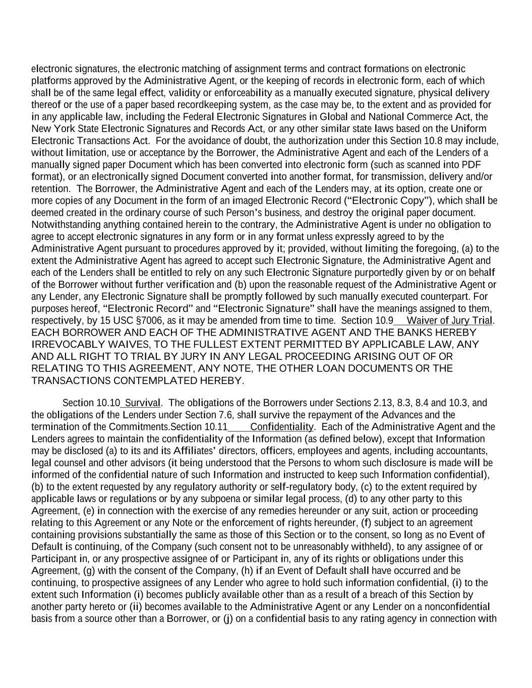 electronic signatures, the electronic matching of assignment terms and contract formations on electronic platforms approved by the Administrative Agent, or the keeping of records in electronic form, each of which shall be of the same legal effect, validity or enforceability as a manually executed signature, physical delivery thereof or the use of a paper based recordkeeping system, as the case may be, to the extent and as provided for in any applicable law, including the Federal Electronic Signatures in Global and National Commerce Act, the New York State Electronic Signatures and Records Act, or any other similar state laws based on the Uniform Electronic Transactions Act. For the avoidance of doubt, the authorization under this Section 10.8 may include, without limitation, use or acceptance by the Borrower, the Administrative Agent and each of the Lenders of a manually signed paper Document which has been converted into electronic form (such as scanned into PDF format), or an electronically signed Document converted into another format, for transmission, delivery and/or retention. The Borrower, the Administrative Agent and each of the Lenders may, at its option, create one or more copies of any Document in the form of an imaged Electronic Record (“Electronic Copy”), which shall be deemed created in the ordinary course of such Person’s business, and destroy the original paper document. Notwithstanding anything contained herein to the contrary, the Administrative Agent is under no obligation to agree to accept electronic signatures in any form or in any format unless expressly agreed to by the Administrative Agent pursuant to procedures approved by it; provided, without limiting the foregoing, (a) to the extent the Administrative Agent has agreed to accept such Electronic Signature, the Administrative Agent and each of the Lenders shall be entitled to rely on any such Electronic Signature purportedly given by or on behalf of the Borrower without further verification and (b) upon the reasonable request of the Administrative Agent or any Lender, any Electronic Signature shall be promptly followed by such manually executed counterpart. For purposes hereof, “Electronic Record” and “Electronic Signature” shall have the meanings assigned to them, respectively, by 15 USC §7006, as it may be amended from time to time. Section 10.9 Waiver of Jury Trial. EACH BORROWER AND EACH OF THE ADMINISTRATIVE AGENT AND THE BANKS HEREBY IRREVOCABLY WAIVES, TO THE FULLEST EXTENT PERMITTED BY APPLICABLE LAW, ANY AND ALL RIGHT TO TRIAL BY JURY IN ANY LEGAL PROCEEDING ARISING OUT OF OR RELATING TO THIS AGREEMENT, ANY NOTE, THE OTHER LOAN DOCUMENTS OR THE TRANSACTIONS CONTEMPLATED HEREBY. Section 10.10 Survival. The obligations of the Borrowers under Sections 2.13, 8.3, 8.4 and 10.3, and the obligations of the Lenders under Section 7.6, shall survive the repayment of the Advances and the termination of the Commitments.Section 10.11 Confidentiality. Each of the Administrative Agent and the Lenders agrees to maintain the confidentiality of the Information (as defined below), except that Information may be disclosed (a) to its and its Affiliates’ directors, officers, employees and agents, including accountants, legal counsel and other advisors (it being understood that the Persons to whom such disclosure is made will be informed of the confidential nature of such Information and instructed to keep such Information confidential), (b) to the extent requested by any regulatory authority or self-regulatory body, (c) to the extent required by applicable laws or regulations or by any subpoena or similar legal process, (d) to any other party to this Agreement, (e) in connection with the exercise of any remedies hereunder or any suit, action or proceeding relating to this Agreement or any Note or the enforcement of rights hereunder, (f) subject to an agreement containing provisions substantially the same as those of this Section or to the consent, so long as no Event of Default is continuing, of the Company (such consent not to be unreasonably withheld), to any assignee of or Participant in, or any prospective assignee of or Participant in, any of its rights or obligations under this Agreement, (g) with the consent of the Company, (h) if an Event of Default shall have occurred and be continuing, to prospective assignees of any Lender who agree to hold such information confidential, (i) to the extent such Information (i) becomes publicly available other than as a result of a breach of this Section by another party hereto or (ii) becomes available to the Administrative Agent or any Lender on a nonconfidential basis from a source other than a Borrower, or (j) on a confidential basis to any rating agency in connection with