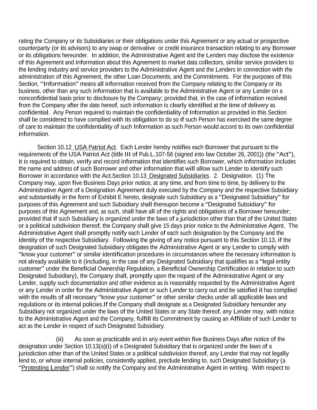 rating the Company or its Subsidiaries or their obligations under this Agreement or any actual or prospective counterparty (or its advisors) to any swap or derivative or credit insurance transaction relating to any Borrower or its obligations hereunder. In addition, the Administrative Agent and the Lenders may disclose the existence of this Agreement and information about this Agreement to market data collectors, similar service providers to the lending industry and service providers to the Administrative Agent and the Lenders in connection with the administration of this Agreement, the other Loan Documents, and the Commitments. For the purposes of this Section, “Information” means all information received from the Company relating to the Company or its business, other than any such information that is available to the Administrative Agent or any Lender on a nonconfidential basis prior to disclosure by the Company; provided that, in the case of information received from the Company after the date hereof, such information is clearly identified at the time of delivery as confidential. Any Person required to maintain the confidentiality of Information as provided in this Section shall be considered to have complied with its obligation to do so if such Person has exercised the same degree of care to maintain the confidentiality of such Information as such Person would accord to its own confidential information. Section 10.12 USA Patriot Act. Each Lender hereby notifies each Borrower that pursuant to the requirements of the USA Patriot Act (title III of Pub.L.107-56 (signed into law October 26, 2001)) (the “Act”), it is required to obtain, verify and record information that identifies such Borrower, which information includes the name and address of such Borrower and other information that will allow such Lender to identify such Borrower in accordance with the Act.Section 10.13 Designated Subsidiaries. 2. Designation. (1) The Company may, upon five Business Days prior notice, at any time, and from time to time, by delivery to the Administrative Agent of a Designation Agreement duly executed by the Company and the respective Subsidiary and substantially in the form of Exhibit E hereto, designate such Subsidiary as a “Designated Subsidiary” for purposes of this Agreement and such Subsidiary shall thereupon become a “Designated Subsidiary” for purposes of this Agreement and, as such, shall have all of the rights and obligations of a Borrower hereunder; provided that if such Subsidiary is organized under the laws of a jurisdiction other than that of the United States or a political subdivision thereof, the Company shall give 15 days prior notice to the Administrative Agent. The Administrative Agent shall promptly notify each Lender of each such designation by the Company and the identity of the respective Subsidiary. Following the giving of any notice pursuant to this Section 10.13, if the designation of such Designated Subsidiary obligates the Administrative Agent or any Lender to comply with “know your customer” or similar identification procedures in circumstances where the necessary information is not already available to it (including, in the case of any Designated Subsidiary that qualifies as a “legal entity customer” under the Beneficial Ownership Regulation, a Beneficial Ownership Certification in relation to such Designated Subsidiary), the Company shall, promptly upon the request of the Administrative Agent or any Lender, supply such documentation and other evidence as is reasonably requested by the Administrative Agent or any Lender in order for the Administrative Agent or such Lender to carry out and be satisfied it has complied with the results of all necessary “know your customer” or other similar checks under all applicable laws and regulations or its internal policies.If the Company shall designate as a Designated Subsidiary hereunder any Subsidiary not organized under the laws of the United States or any State thereof, any Lender may, with notice to the Administrative Agent and the Company, fulfill its Commitment by causing an Affiliate of such Lender to act as the Lender in respect of such Designated Subsidiary. (ii) As soon as practicable and in any event within five Business Days after notice of the designation under Section 10.13(a)(i) of a Designated Subsidiary that is organized under the laws of a jurisdiction other than of the United States or a political subdivision thereof, any Lender that may not legally lend to, or whose internal policies, consistently applied, preclude lending to, such Designated Subsidiary (a “Protesting Lender”) shall so notify the Company and the Administrative Agent in writing. With respect to