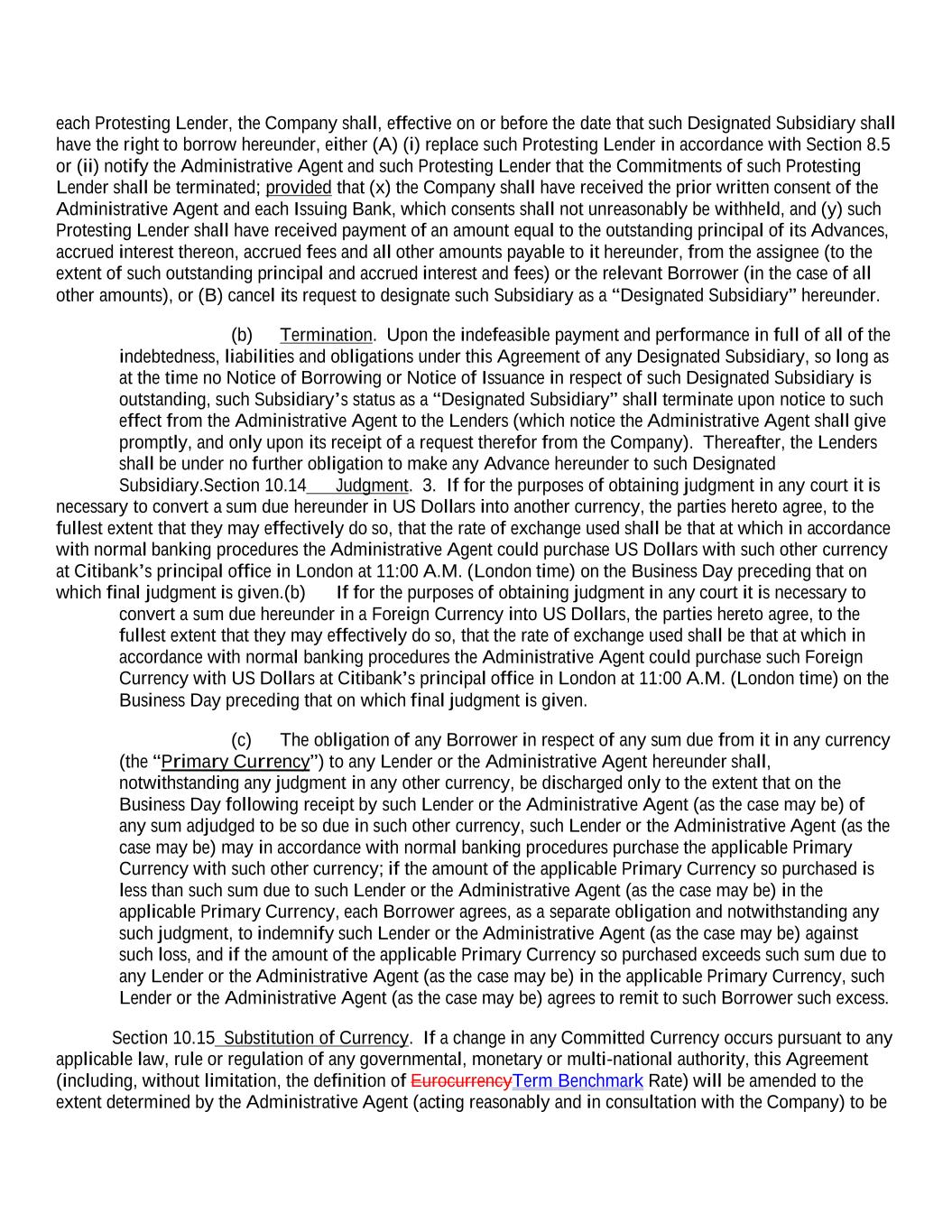 each Protesting Lender, the Company shall, effective on or before the date that such Designated Subsidiary shall have the right to borrow hereunder, either (A) (i) replace such Protesting Lender in accordance with Section 8.5 or (ii) notify the Administrative Agent and such Protesting Lender that the Commitments of such Protesting Lender shall be terminated; provided that (x) the Company shall have received the prior written consent of the Administrative Agent and each Issuing Bank, which consents shall not unreasonably be withheld, and (y) such Protesting Lender shall have received payment of an amount equal to the outstanding principal of its Advances, accrued interest thereon, accrued fees and all other amounts payable to it hereunder, from the assignee (to the extent of such outstanding principal and accrued interest and fees) or the relevant Borrower (in the case of all other amounts), or (B) cancel its request to designate such Subsidiary as a “Designated Subsidiary” hereunder. (b) Termination. Upon the indefeasible payment and performance in full of all of the indebtedness, liabilities and obligations under this Agreement of any Designated Subsidiary, so long as at the time no Notice of Borrowing or Notice of Issuance in respect of such Designated Subsidiary is outstanding, such Subsidiary’s status as a “Designated Subsidiary” shall terminate upon notice to such effect from the Administrative Agent to the Lenders (which notice the Administrative Agent shall give promptly, and only upon its receipt of a request therefor from the Company). Thereafter, the Lenders shall be under no further obligation to make any Advance hereunder to such Designated Subsidiary.Section 10.14 Judgment. 3. If for the purposes of obtaining judgment in any court it is necessary to convert a sum due hereunder in US Dollars into another currency, the parties hereto agree, to the fullest extent that they may effectively do so, that the rate of exchange used shall be that at which in accordance with normal banking procedures the Administrative Agent could purchase US Dollars with such other currency at Citibank’s principal office in London at 11:00 A.M. (London time) on the Business Day preceding that on which final judgment is given.(b) If for the purposes of obtaining judgment in any court it is necessary to convert a sum due hereunder in a Foreign Currency into US Dollars, the parties hereto agree, to the fullest extent that they may effectively do so, that the rate of exchange used shall be that at which in accordance with normal banking procedures the Administrative Agent could purchase such Foreign Currency with US Dollars at Citibank’s principal office in London at 11:00 A.M. (London time) on the Business Day preceding that on which final judgment is given. (c) The obligation of any Borrower in respect of any sum due from it in any currency (the “Primary Currency”) to any Lender or the Administrative Agent hereunder shall, notwithstanding any judgment in any other currency, be discharged only to the extent that on the Business Day following receipt by such Lender or the Administrative Agent (as the case may be) of any sum adjudged to be so due in such other currency, such Lender or the Administrative Agent (as the case may be) may in accordance with normal banking procedures purchase the applicable Primary Currency with such other currency; if the amount of the applicable Primary Currency so purchased is less than such sum due to such Lender or the Administrative Agent (as the case may be) in the applicable Primary Currency, each Borrower agrees, as a separate obligation and notwithstanding any such judgment, to indemnify such Lender or the Administrative Agent (as the case may be) against such loss, and if the amount of the applicable Primary Currency so purchased exceeds such sum due to any Lender or the Administrative Agent (as the case may be) in the applicable Primary Currency, such Lender or the Administrative Agent (as the case may be) agrees to remit to such Borrower such excess. Section 10.15 Substitution of Currency. If a change in any Committed Currency occurs pursuant to any applicable law, rule or regulation of any governmental, monetary or multi-national authority, this Agreement (including, without limitation, the definition of EurocurrencyTerm Benchmark Rate) will be amended to the extent determined by the Administrative Agent (acting reasonably and in consultation with the Company) to be