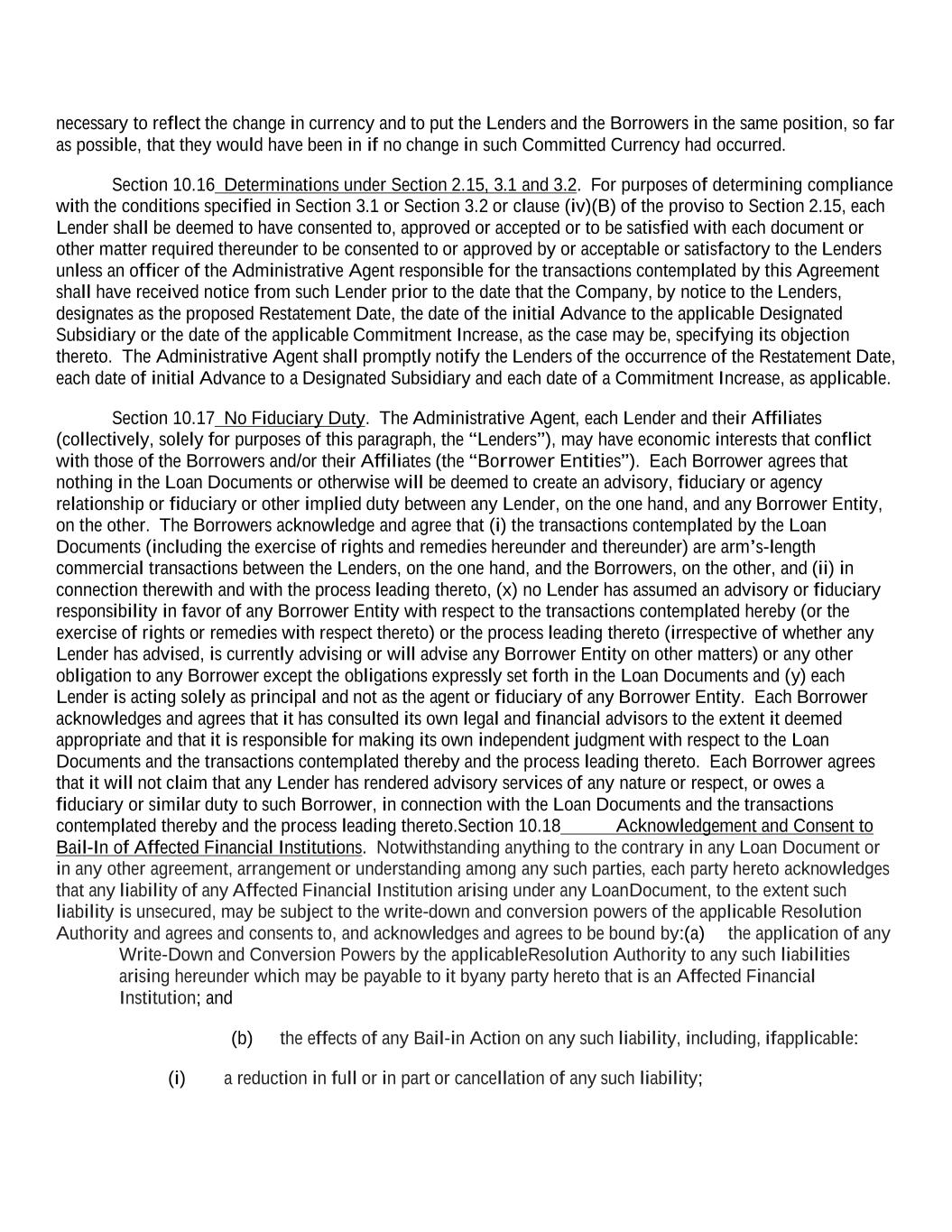 necessary to reflect the change in currency and to put the Lenders and the Borrowers in the same position, so far as possible, that they would have been in if no change in such Committed Currency had occurred. Section 10.16 Determinations under Section 2.15, 3.1 and 3.2. For purposes of determining compliance with the conditions specified in Section 3.1 or Section 3.2 or clause (iv)(B) of the proviso to Section 2.15, each Lender shall be deemed to have consented to, approved or accepted or to be satisfied with each document or other matter required thereunder to be consented to or approved by or acceptable or satisfactory to the Lenders unless an officer of the Administrative Agent responsible for the transactions contemplated by this Agreement shall have received notice from such Lender prior to the date that the Company, by notice to the Lenders, designates as the proposed Restatement Date, the date of the initial Advance to the applicable Designated Subsidiary or the date of the applicable Commitment Increase, as the case may be, specifying its objection thereto. The Administrative Agent shall promptly notify the Lenders of the occurrence of the Restatement Date, each date of initial Advance to a Designated Subsidiary and each date of a Commitment Increase, as applicable. Section 10.17 No Fiduciary Duty. The Administrative Agent, each Lender and their Affiliates (collectively, solely for purposes of this paragraph, the “Lenders”), may have economic interests that conflict with those of the Borrowers and/or their Affiliates (the “Borrower Entities”). Each Borrower agrees that nothing in the Loan Documents or otherwise will be deemed to create an advisory, fiduciary or agency relationship or fiduciary or other implied duty between any Lender, on the one hand, and any Borrower Entity, on the other. The Borrowers acknowledge and agree that (i) the transactions contemplated by the Loan Documents (including the exercise of rights and remedies hereunder and thereunder) are arm’s-length commercial transactions between the Lenders, on the one hand, and the Borrowers, on the other, and (ii) in connection therewith and with the process leading thereto, (x) no Lender has assumed an advisory or fiduciary responsibility in favor of any Borrower Entity with respect to the transactions contemplated hereby (or the exercise of rights or remedies with respect thereto) or the process leading thereto (irrespective of whether any Lender has advised, is currently advising or will advise any Borrower Entity on other matters) or any other obligation to any Borrower except the obligations expressly set forth in the Loan Documents and (y) each Lender is acting solely as principal and not as the agent or fiduciary of any Borrower Entity. Each Borrower acknowledges and agrees that it has consulted its own legal and financial advisors to the extent it deemed appropriate and that it is responsible for making its own independent judgment with respect to the Loan Documents and the transactions contemplated thereby and the process leading thereto. Each Borrower agrees that it will not claim that any Lender has rendered advisory services of any nature or respect, or owes a fiduciary or similar duty to such Borrower, in connection with the Loan Documents and the transactions contemplated thereby and the process leading thereto.Section 10.18 Acknowledgement and Consent to Bail-In of Affected Financial Institutions. Notwithstanding anything to the contrary in any Loan Document or in any other agreement, arrangement or understanding among any such parties, each party hereto acknowledges that any liability of any Affected Financial Institution arising under any Loan Document, to the extent such liability is unsecured, may be subject to the write-down and conversion powers of the applicable Resolution Authority and agrees and consents to, and acknowledges and agrees to be bound by:(a) the application of any Write-Down and Conversion Powers by the applicable Resolution Authority to any such liabilities arising hereunder which may be payable to it by any party hereto that is an Affected Financial Institution; and (b) the effects of any Bail-in Action on any such liability, including, if applicable: (i) a reduction in full or in part or cancellation of any such liability;