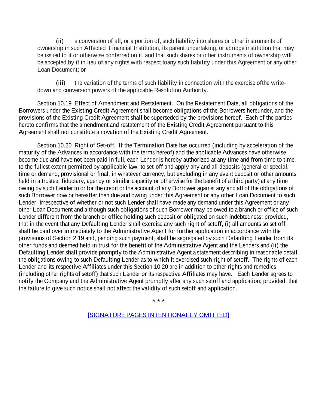 (ii) a conversion of all, or a portion of, such liability into shares or other instruments of ownership in such Affected Financial Institution, its parent undertaking, or a bridge institution that may be issued to it or otherwise conferred on it, and that such shares or other instruments of ownership will be accepted by it in lieu of any rights with respect to any such liability under this Agreement or any other Loan Document; or (iii) the variation of the terms of such liability in connection with the exercise of the write- down and conversion powers of the applicable Resolution Authority. Section 10.19 Effect of Amendment and Restatement. On the Restatement Date, all obligations of the Borrowers under the Existing Credit Agreement shall become obligations of the Borrowers hereunder, and the provisions of the Existing Credit Agreement shall be superseded by the provisions hereof. Each of the parties hereto confirms that the amendment and restatement of the Existing Credit Agreement pursuant to this Agreement shall not constitute a novation of the Existing Credit Agreement. Section 10.20 Right of Set-off. If the Termination Date has occurred (including by acceleration of the maturity of the Advances in accordance with the terms hereof) and the applicable Advances have otherwise become due and have not been paid in full, each Lender is hereby authorized at any time and from time to time, to the fullest extent permitted by applicable law, to set-off and apply any and all deposits (general or special, time or demand, provisional or final, in whatever currency, but excluding in any event deposit or other amounts held in a trustee, fiduciary, agency or similar capacity or otherwise for the benefit of a third party) at any time owing by such Lender to or for the credit or the account of any Borrower against any and all of the obligations of such Borrower now or hereafter then due and owing under this Agreement or any other Loan Document to such Lender, irrespective of whether or not such Lender shall have made any demand under this Agreement or any other Loan Document and although such obligations of such Borrower may be owed to a branch or office of such Lender different from the branch or office holding such deposit or obligated on such indebtedness; provided, that in the event that any Defaulting Lender shall exercise any such right of setoff, (i) all amounts so set off shall be paid over immediately to the Administrative Agent for further application in accordance with the provisions of Section 2.19 and, pending such payment, shall be segregated by such Defaulting Lender from its other funds and deemed held in trust for the benefit of the Administrative Agent and the Lenders and (ii) the Defaulting Lender shall provide promptly to the Administrative Agent a statement describing in reasonable detail the obligations owing to such Defaulting Lender as to which it exercised such right of setoff. The rights of each Lender and its respective Affiliates under this Section 10.20 are in addition to other rights and remedies (including other rights of setoff) that such Lender or its respective Affiliates may have. Each Lender agrees to notify the Company and the Administrative Agent promptly after any such setoff and application; provided, that the failure to give such notice shall not affect the validity of such setoff and application. * * * [SIGNATURE PAGES INTENTIONALLY OMITTED]