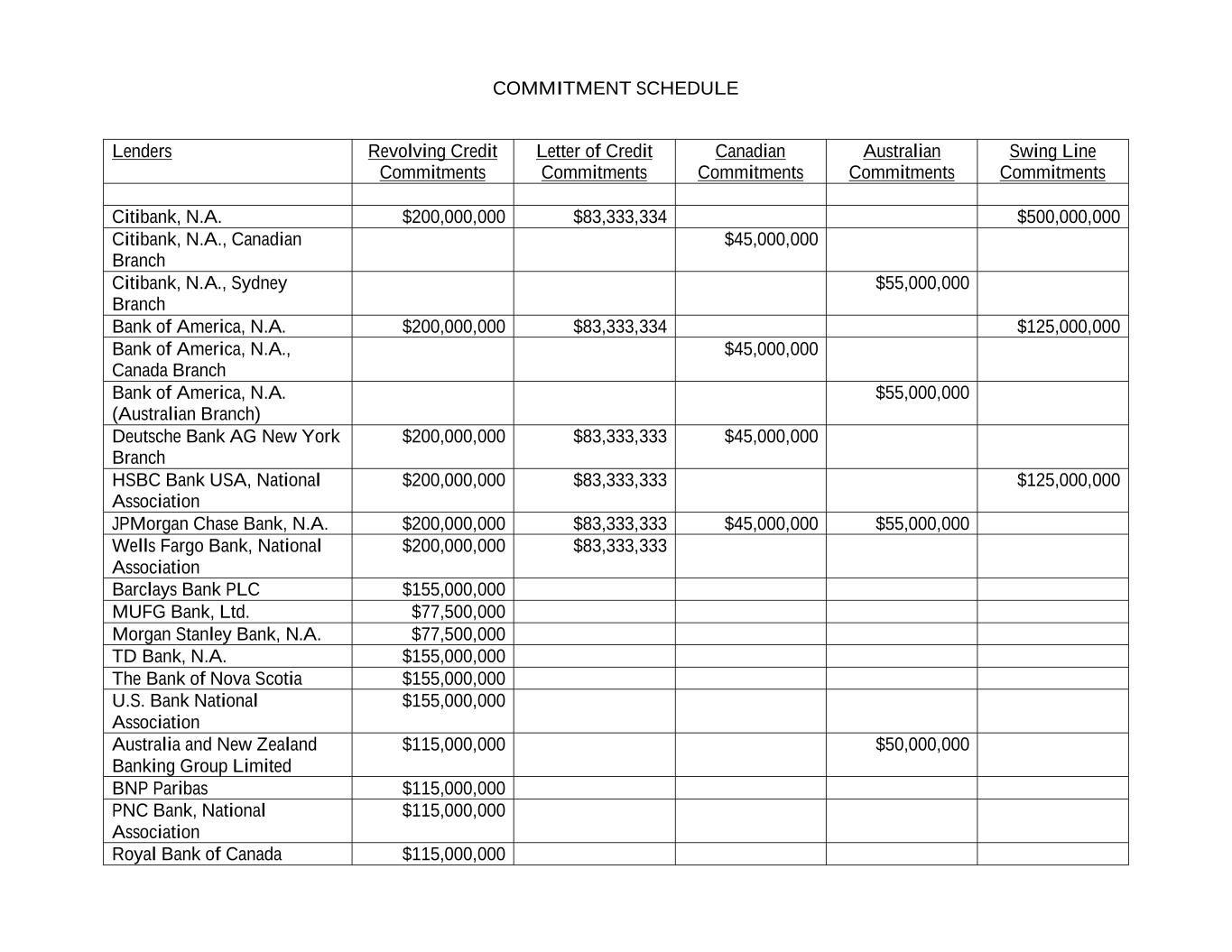 COMMITMENT SCHEDULE Lenders Revolving Credit Commitments Letter of Credit Commitments Canadian Commitments Australian Commitments Swing Line Commitments Citibank, N.A. $200,000,000 $83,333,334 $500,000,000 Citibank, N.A., Canadian Branch $45,000,000 Citibank, N.A., Sydney Branch $55,000,000 Bank of America, N.A. $200,000,000 $83,333,334 $125,000,000 Bank of America, N.A., Canada Branch $45,000,000 Bank of America, N.A. (Australian Branch) $55,000,000 Deutsche Bank AG New York Branch $200,000,000 $83,333,333 $45,000,000 HSBC Bank USA, National Association $200,000,000 $83,333,333 $125,000,000 JPMorgan Chase Bank, N.A. $200,000,000 $83,333,333 $45,000,000 $55,000,000 Wells Fargo Bank, National Association $200,000,000 $83,333,333 Barclays Bank PLC $155,000,000 MUFG Bank, Ltd. $77,500,000 Morgan Stanley Bank, N.A. $77,500,000 TD Bank, N.A. $155,000,000 The Bank of Nova Scotia $155,000,000 U.S. Bank National Association $155,000,000 Australia and New Zealand Banking Group Limited $115,000,000 $50,000,000 BNP Paribas $115,000,000 PNC Bank, National Association $115,000,000 Royal Bank of Canada $115,000,000