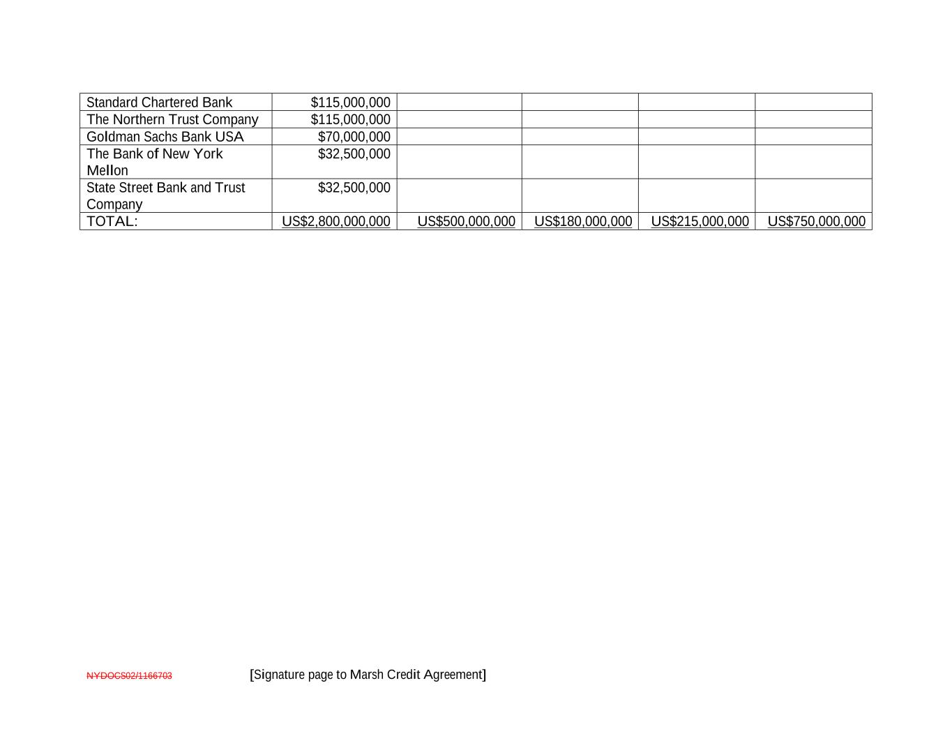 NYDOCS02/1166703 [Signature page to Marsh Credit Agreement] Standard Chartered Bank $115,000,000 The Northern Trust Company $115,000,000 Goldman Sachs Bank USA $70,000,000 The Bank of New York Mellon $32,500,000 State Street Bank and Trust Company $32,500,000 TOTAL: US$2,800,000,000 US$500,000,000 US$180,000,000 US$215,000,000 US$750,000,000