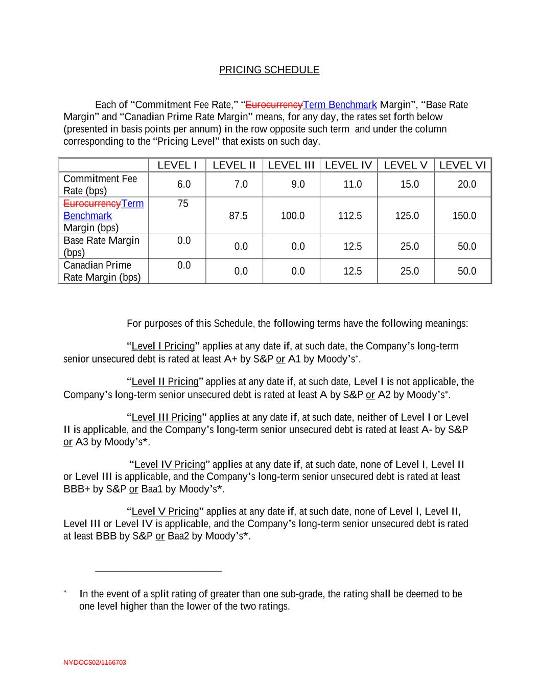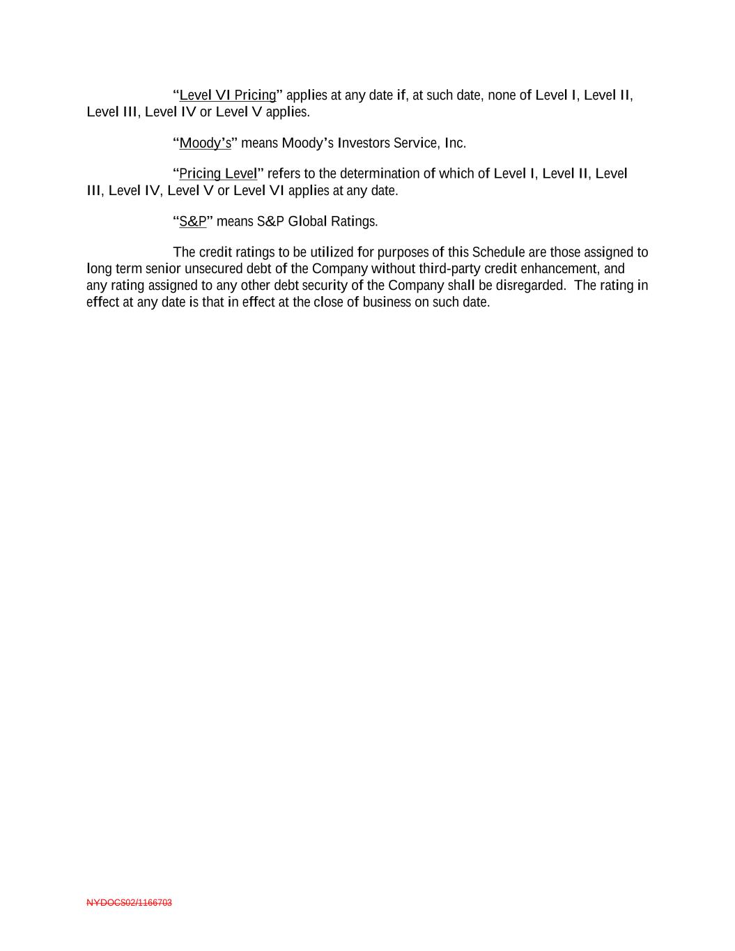 NYDOCS02/1166703 “Level VI Pricing” applies at any date if, at such date, none of Level I, Level II, Level III, Level IV or Level V applies. “Moody’s” means Moody’s Investors Service, Inc. “Pricing Level” refers to the determination of which of Level I, Level II, Level III, Level IV, Level V or Level VI applies at any date. “S&P” means S&P Global Ratings. The credit ratings to be utilized for purposes of this Schedule are those assigned to long term senior unsecured debt of the Company without third-party credit enhancement, and any rating assigned to any other debt security of the Company shall be disregarded. The rating in effect at any date is that in effect at the close of business on such date.
