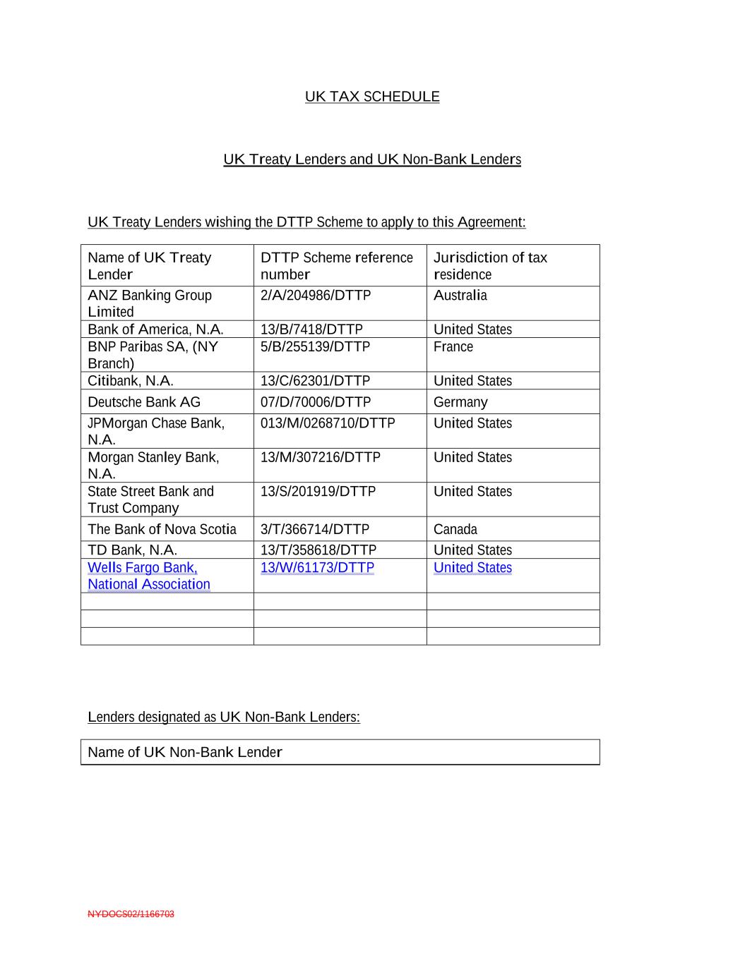 NYDOCS02/1166703 UK TAX SCHEDULE UK Treaty Lenders and UK Non-Bank Lenders UK Treaty Lenders wishing the DTTP Scheme to apply to this Agreement: Name of UK Treaty Lender DTTP Scheme reference number Jurisdiction of tax residence ANZ Banking Group Limited 2/A/204986/DTTP Australia Bank of America, N.A. 13/B/7418/DTTP United States BNP Paribas SA, (NY Branch) 5/B/255139/DTTP France Citibank, N.A. 13/C/62301/DTTP United States Deutsche Bank AG 07/D/70006/DTTP Germany JPMorgan Chase Bank, N.A. 013/M/0268710/DTTP United States Morgan Stanley Bank, N.A. 13/M/307216/DTTP United States State Street Bank and Trust Company 13/S/201919/DTTP United States The Bank of Nova Scotia 3/T/366714/DTTP Canada TD Bank, N.A. 13/T/358618/DTTP United States Wells Fargo Bank, National Association 13/W/61173/DTTP United States Lenders designated as UK Non-Bank Lenders: Name of UK Non-Bank Lender