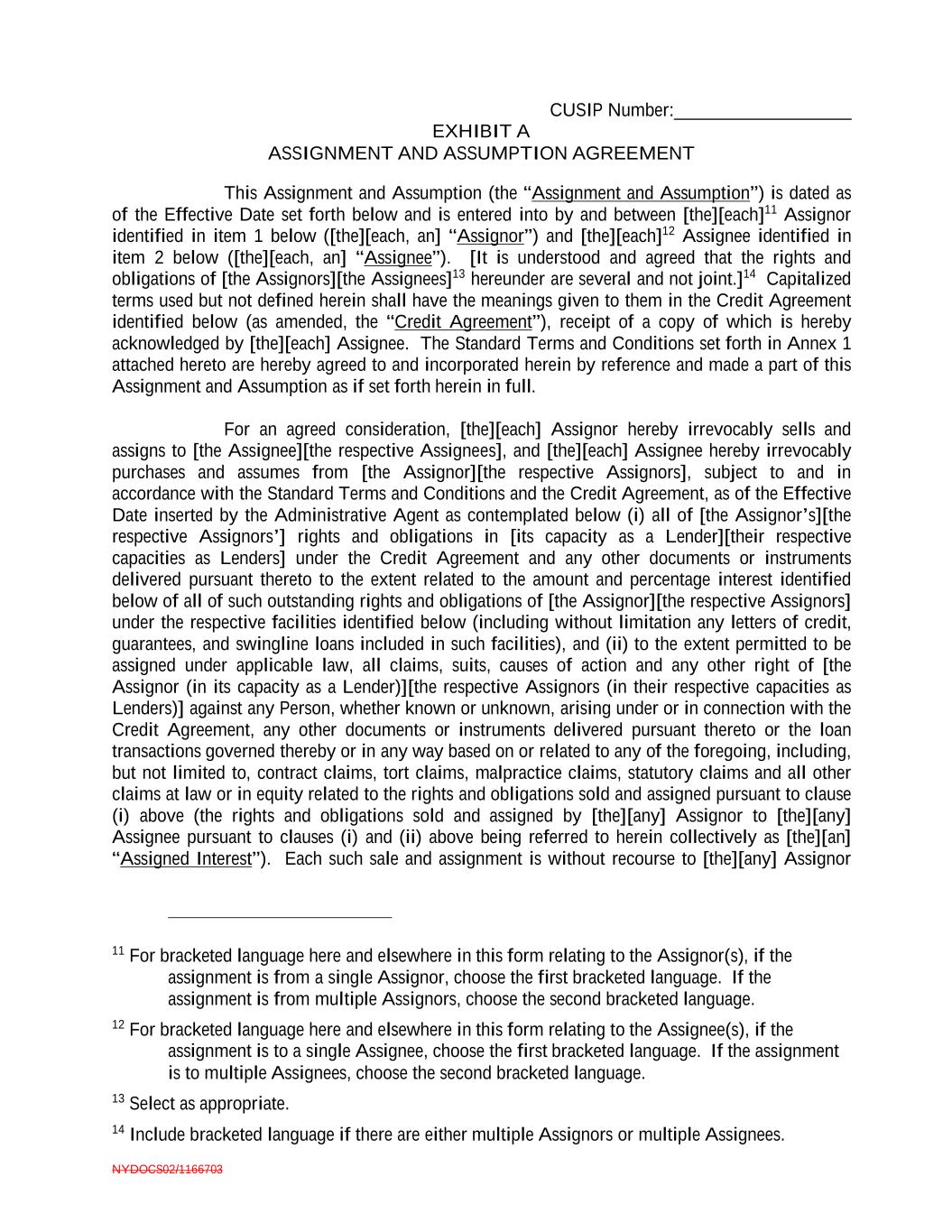 CUSIP Number:___________________ NYDOCS02/1166703 EXHIBIT A ASSIGNMENT AND ASSUMPTION AGREEMENT This Assignment and Assumption (the “Assignment and Assumption”) is dated as of the Effective Date set forth below and is entered into by and between [the][each]11 Assignor identified in item 1 below ([the][each, an] “Assignor”) and [the][each]12 Assignee identified in item 2 below ([the][each, an] “Assignee”). [It is understood and agreed that the rights and obligations of [the Assignors][the Assignees]13 hereunder are several and not joint.]14 Capitalized terms used but not defined herein shall have the meanings given to them in the Credit Agreement identified below (as amended, the “Credit Agreement”), receipt of a copy of which is hereby acknowledged by [the][each] Assignee. The Standard Terms and Conditions set forth in Annex 1 attached hereto are hereby agreed to and incorporated herein by reference and made a part of this Assignment and Assumption as if set forth herein in full. For an agreed consideration, [the][each] Assignor hereby irrevocably sells and assigns to [the Assignee][the respective Assignees], and [the][each] Assignee hereby irrevocably purchases and assumes from [the Assignor][the respective Assignors], subject to and in accordance with the Standard Terms and Conditions and the Credit Agreement, as of the Effective Date inserted by the Administrative Agent as contemplated below (i) all of [the Assignor’s][the respective Assignors’] rights and obligations in [its capacity as a Lender][their respective capacities as Lenders] under the Credit Agreement and any other documents or instruments delivered pursuant thereto to the extent related to the amount and percentage interest identified below of all of such outstanding rights and obligations of [the Assignor][the respective Assignors] under the respective facilities identified below (including without limitation any letters of credit, guarantees, and swingline loans included in such facilities), and (ii) to the extent permitted to be assigned under applicable law, all claims, suits, causes of action and any other right of [the Assignor (in its capacity as a Lender)][the respective Assignors (in their respective capacities as Lenders)] against any Person, whether known or unknown, arising under or in connection with the Credit Agreement, any other documents or instruments delivered pursuant thereto or the loan transactions governed thereby or in any way based on or related to any of the foregoing, including, but not limited to, contract claims, tort claims, malpractice claims, statutory claims and all other claims at law or in equity related to the rights and obligations sold and assigned pursuant to clause (i) above (the rights and obligations sold and assigned by [the][any] Assignor to [the][any] Assignee pursuant to clauses (i) and (ii) above being referred to herein collectively as [the][an] “Assigned Interest”). Each such sale and assignment is without recourse to [the][any] Assignor 11 For bracketed language here and elsewhere in this form relating to the Assignor(s), if the assignment is from a single Assignor, choose the first bracketed language. If the assignment is from multiple Assignors, choose the second bracketed language. 12 For bracketed language here and elsewhere in this form relating to the Assignee(s), if the assignment is to a single Assignee, choose the first bracketed language. If the assignment is to multiple Assignees, choose the second bracketed language. 13 Select as appropriate. 14 Include bracketed language if there are either multiple Assignors or multiple Assignees.