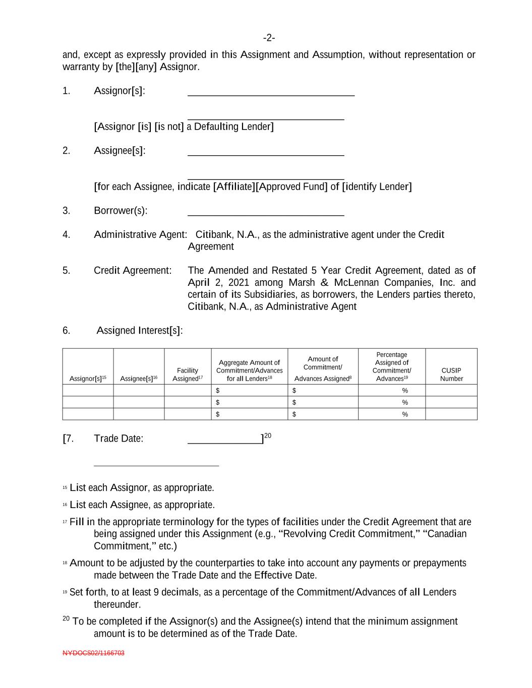 -2- NYDOCS02/1166703 and, except as expressly provided in this Assignment and Assumption, without representation or warranty by [the][any] Assignor. 1. Assignor[s]: ________________________________ ______________________________ [Assignor [is] [is not] a Defaulting Lender] 2. Assignee[s]: ______________________________ ______________________________ [for each Assignee, indicate [Affiliate][Approved Fund] of [identify Lender] 3. Borrower(s): ______________________________ 4. Administrative Agent: Citibank, N.A., as the administrative agent under the Credit Agreement 5. Credit Agreement: The Amended and Restated 5 Year Credit Agreement, dated as of April 2, 2021 among Marsh & McLennan Companies, Inc. and certain of its Subsidiaries, as borrowers, the Lenders parties thereto, Citibank, N.A., as Administrative Agent 6. Assigned Interest[s]: Assignor[s]15 Assignee[s]16 Facility Assigned17 Aggregate Amount of Commitment/Advances for all Lenders18 Amount of Commitment/ Advances Assigned8 Percentage Assigned of Commitment/ Advances19 CUSIP Number $ $ % $ $ % $ $ % [7. Trade Date: ______________]20 15 List each Assignor, as appropriate. 16 List each Assignee, as appropriate. 17 Fill in the appropriate terminology for the types of facilities under the Credit Agreement that are being assigned under this Assignment (e.g., “Revolving Credit Commitment,” “Canadian Commitment,” etc.) 18 Amount to be adjusted by the counterparties to take into account any payments or prepayments made between the Trade Date and the Effective Date. 19 Set forth, to at least 9 decimals, as a percentage of the Commitment/Advances of all Lenders thereunder. 20 To be completed if the Assignor(s) and the Assignee(s) intend that the minimum assignment amount is to be determined as of the Trade Date.