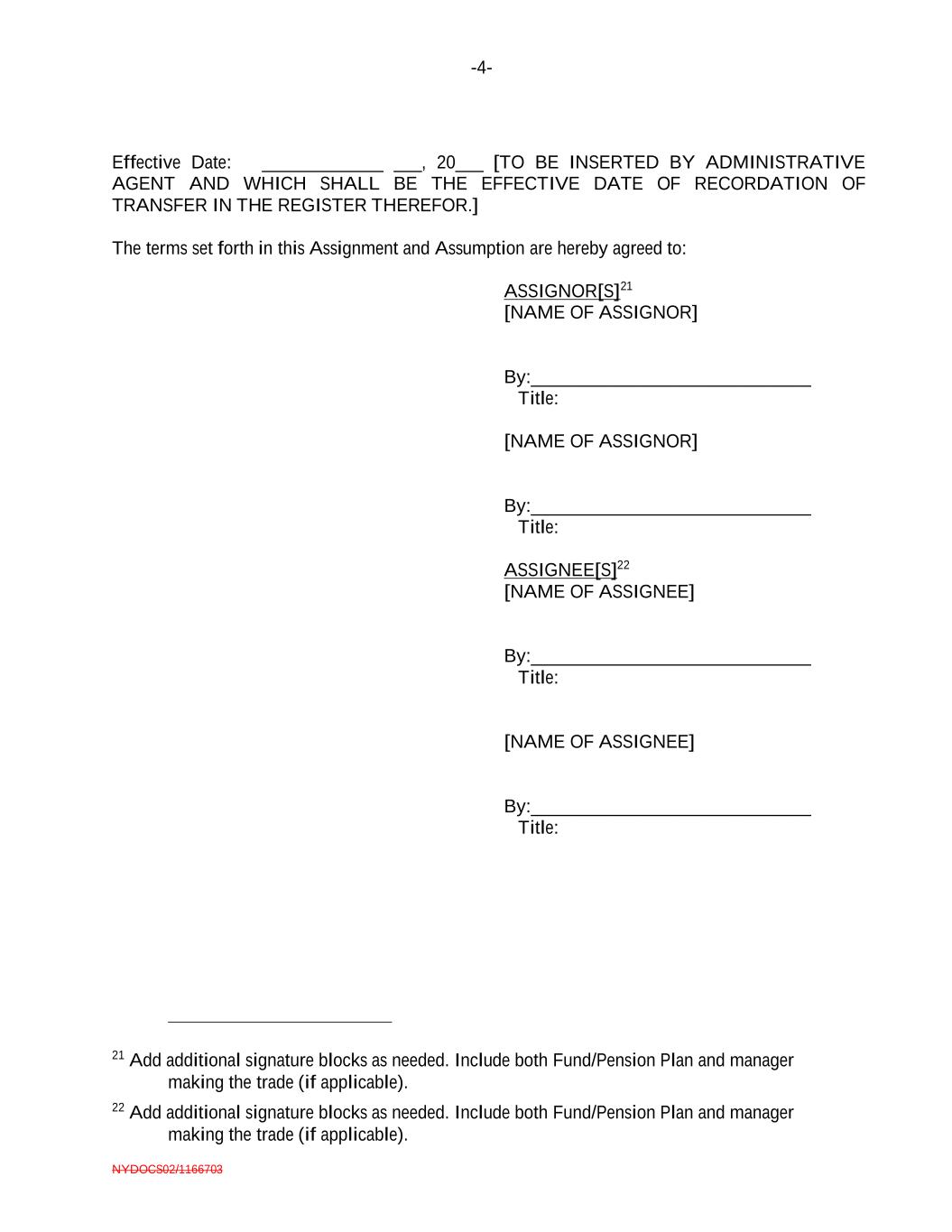 -4- NYDOCS02/1166703 Effective Date: _____________ ___, 20___ [TO BE INSERTED BY ADMINISTRATIVE AGENT AND WHICH SHALL BE THE EFFECTIVE DATE OF RECORDATION OF TRANSFER IN THE REGISTER THEREFOR.] The terms set forth in this Assignment and Assumption are hereby agreed to: ASSIGNOR[S]21 [NAME OF ASSIGNOR] By:______________________________ Title: [NAME OF ASSIGNOR] By:______________________________ Title: ASSIGNEE[S]22 [NAME OF ASSIGNEE] By:______________________________ Title: [NAME OF ASSIGNEE] By:______________________________ Title: 21 Add additional signature blocks as needed. Include both Fund/Pension Plan and manager making the trade (if applicable). 22 Add additional signature blocks as needed. Include both Fund/Pension Plan and manager making the trade (if applicable).
