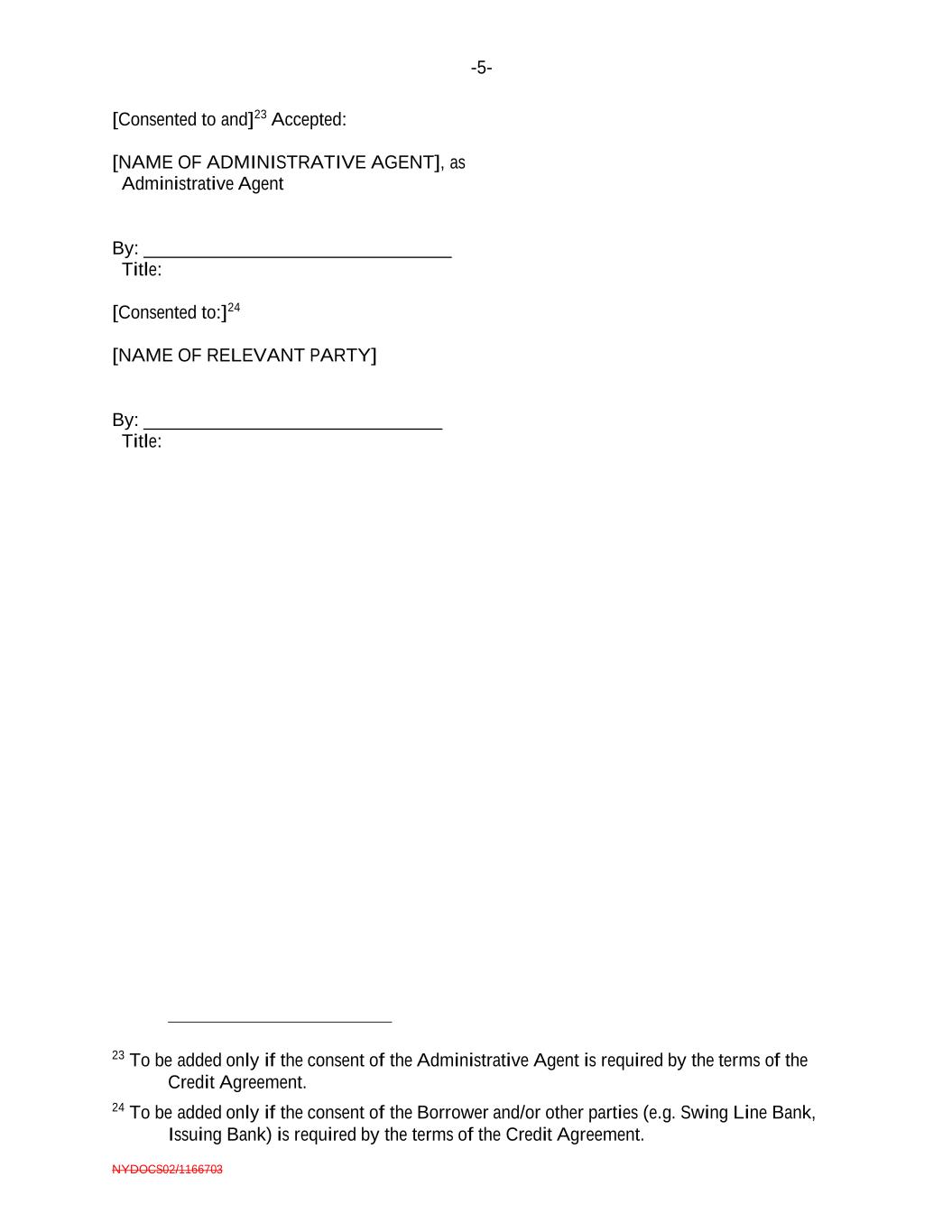-5- NYDOCS02/1166703 [Consented to and]23 Accepted: [NAME OF ADMINISTRATIVE AGENT], as Administrative Agent By: _________________________________ Title: [Consented to:]24 [NAME OF RELEVANT PARTY] By: ________________________________ Title: 23 To be added only if the consent of the Administrative Agent is required by the terms of the Credit Agreement. 24 To be added only if the consent of the Borrower and/or other parties (e.g. Swing Line Bank, Issuing Bank) is required by the terms of the Credit Agreement.