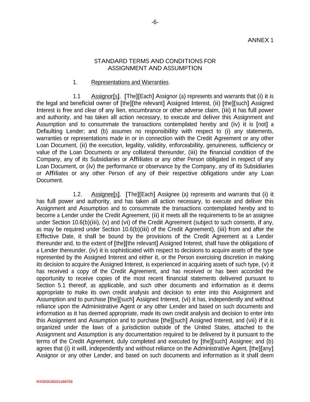 -6- NYDOCS02/1166703 ANNEX 1 STANDARD TERMS AND CONDITIONS FOR ASSIGNMENT AND ASSUMPTION 1. Representations and Warranties. 1.1 Assignor[s]. [The][Each] Assignor (a) represents and warrants that (i) it is the legal and beneficial owner of [the][the relevant] Assigned Interest, (ii) [the][such] Assigned Interest is free and clear of any lien, encumbrance or other adverse claim, (iii) it has full power and authority, and has taken all action necessary, to execute and deliver this Assignment and Assumption and to consummate the transactions contemplated hereby and (iv) it is [not] a Defaulting Lender; and (b) assumes no responsibility with respect to (i) any statements, warranties or representations made in or in connection with the Credit Agreement or any other Loan Document, (ii) the execution, legality, validity, enforceability, genuineness, sufficiency or value of the Loan Documents or any collateral thereunder, (iii) the financial condition of the Company, any of its Subsidiaries or Affiliates or any other Person obligated in respect of any Loan Document, or (iv) the performance or observance by the Company, any of its Subsidiaries or Affiliates or any other Person of any of their respective obligations under any Loan Document. 1.2. Assignee[s]. [The][Each] Assignee (a) represents and warrants that (i) it has full power and authority, and has taken all action necessary, to execute and deliver this Assignment and Assumption and to consummate the transactions contemplated hereby and to become a Lender under the Credit Agreement, (ii) it meets all the requirements to be an assignee under Section 10.6(b)(iii), (v) and (vi) of the Credit Agreement (subject to such consents, if any, as may be required under Section 10.6(b)(iii) of the Credit Agreement), (iii) from and after the Effective Date, it shall be bound by the provisions of the Credit Agreement as a Lender thereunder and, to the extent of [the][the relevant] Assigned Interest, shall have the obligations of a Lender thereunder, (iv) it is sophisticated with respect to decisions to acquire assets of the type represented by the Assigned Interest and either it, or the Person exercising discretion in making its decision to acquire the Assigned Interest, is experienced in acquiring assets of such type, (v) it has received a copy of the Credit Agreement, and has received or has been accorded the opportunity to receive copies of the most recent financial statements delivered pursuant to Section 5.1 thereof, as applicable, and such other documents and information as it deems appropriate to make its own credit analysis and decision to enter into this Assignment and Assumption and to purchase [the][such] Assigned Interest, (vi) it has, independently and without reliance upon the Administrative Agent or any other Lender and based on such documents and information as it has deemed appropriate, made its own credit analysis and decision to enter into this Assignment and Assumption and to purchase [the][such] Assigned Interest, and (vii) if it is organized under the laws of a jurisdiction outside of the United States, attached to the Assignment and Assumption is any documentation required to be delivered by it pursuant to the terms of the Credit Agreement, duly completed and executed by [the][such] Assignee; and (b) agrees that (i) it will, independently and without reliance on the Administrative Agent, [the][any] Assignor or any other Lender, and based on such documents and information as it shall deem