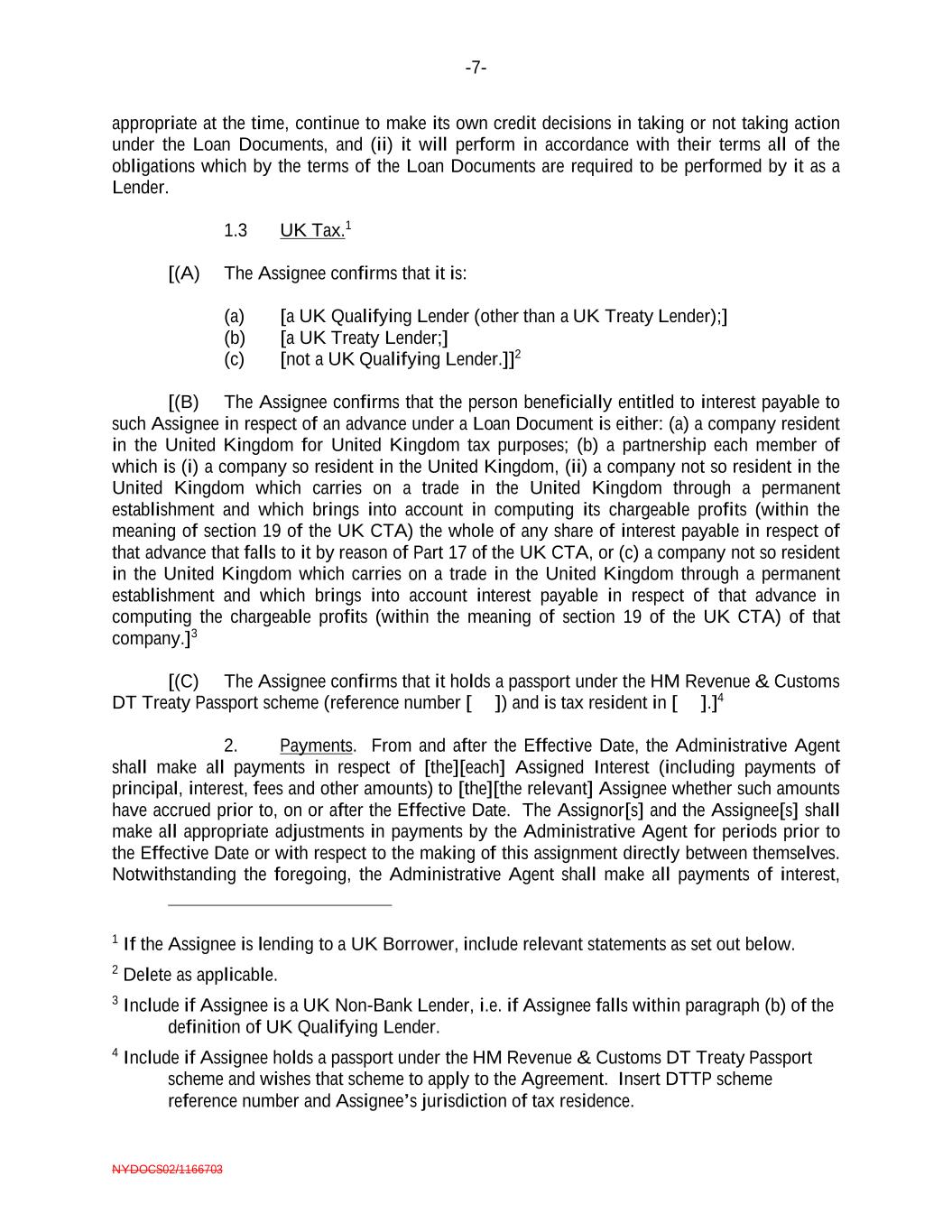 -7- NYDOCS02/1166703 appropriate at the time, continue to make its own credit decisions in taking or not taking action under the Loan Documents, and (ii) it will perform in accordance with their terms all of the obligations which by the terms of the Loan Documents are required to be performed by it as a Lender. 1.3 UK Tax.1 [(A) The Assignee confirms that it is: (a) [a UK Qualifying Lender (other than a UK Treaty Lender);] (b) [a UK Treaty Lender;] (c) [not a UK Qualifying Lender.]]2 [(B) The Assignee confirms that the person beneficially entitled to interest payable to such Assignee in respect of an advance under a Loan Document is either: (a) a company resident in the United Kingdom for United Kingdom tax purposes; (b) a partnership each member of which is (i) a company so resident in the United Kingdom, (ii) a company not so resident in the United Kingdom which carries on a trade in the United Kingdom through a permanent establishment and which brings into account in computing its chargeable profits (within the meaning of section 19 of the UK CTA) the whole of any share of interest payable in respect of that advance that falls to it by reason of Part 17 of the UK CTA, or (c) a company not so resident in the United Kingdom which carries on a trade in the United Kingdom through a permanent establishment and which brings into account interest payable in respect of that advance in computing the chargeable profits (within the meaning of section 19 of the UK CTA) of that company.]3 [(C) The Assignee confirms that it holds a passport under the HM Revenue & Customs DT Treaty Passport scheme (reference number [ ]) and is tax resident in [ ].]4 2. Payments. From and after the Effective Date, the Administrative Agent shall make all payments in respect of [the][each] Assigned Interest (including payments of principal, interest, fees and other amounts) to [the][the relevant] Assignee whether such amounts have accrued prior to, on or after the Effective Date. The Assignor[s] and the Assignee[s] shall make all appropriate adjustments in payments by the Administrative Agent for periods prior to the Effective Date or with respect to the making of this assignment directly between themselves. Notwithstanding the foregoing, the Administrative Agent shall make all payments of interest, 1 If the Assignee is lending to a UK Borrower, include relevant statements as set out below. 2 Delete as applicable. 3 Include if Assignee is a UK Non-Bank Lender, i.e. if Assignee falls within paragraph (b) of the definition of UK Qualifying Lender. 4 Include if Assignee holds a passport under the HM Revenue & Customs DT Treaty Passport scheme and wishes that scheme to apply to the Agreement. Insert DTTP scheme reference number and Assignee’s jurisdiction of tax residence.