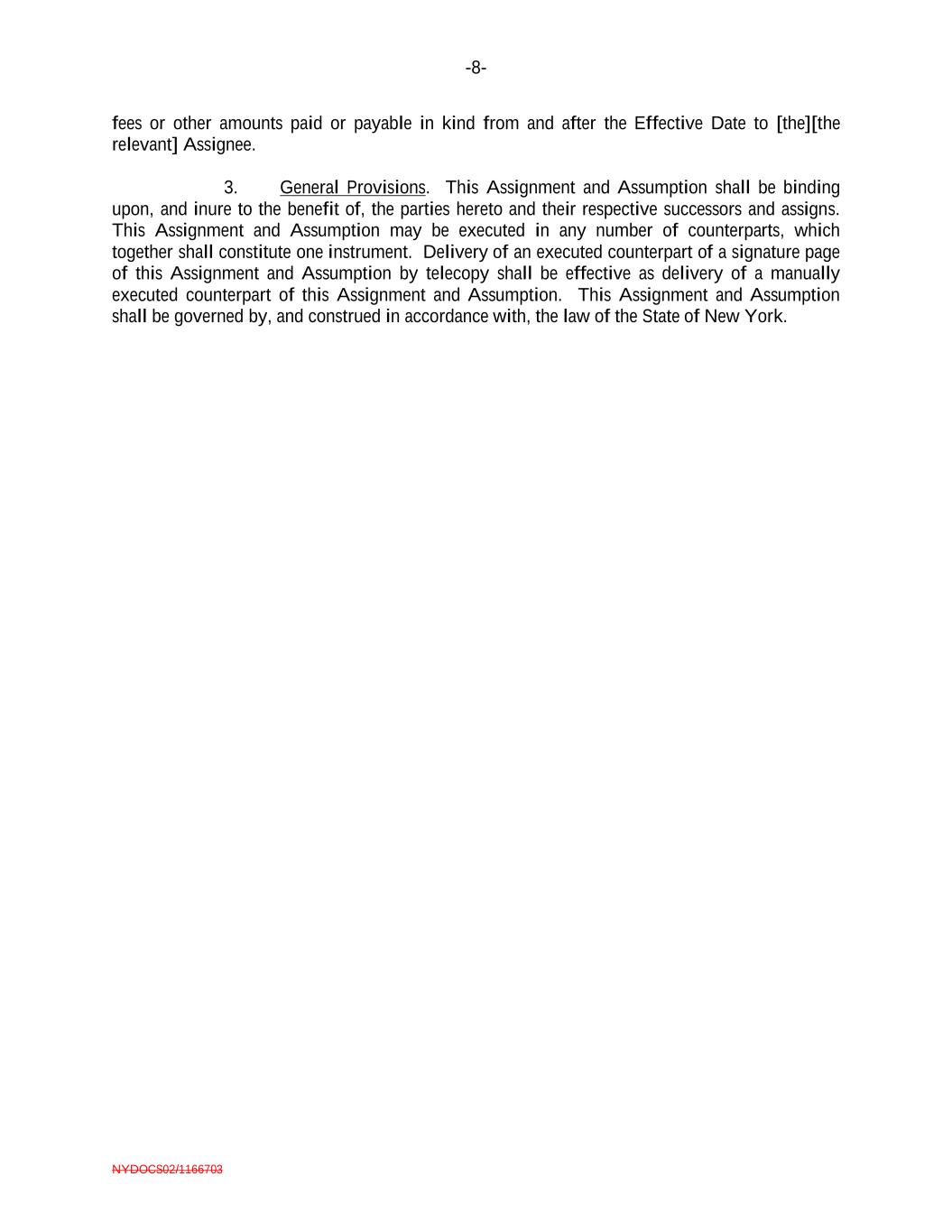 -8- NYDOCS02/1166703 fees or other amounts paid or payable in kind from and after the Effective Date to [the][the relevant] Assignee. 3. General Provisions. This Assignment and Assumption shall be binding upon, and inure to the benefit of, the parties hereto and their respective successors and assigns. This Assignment and Assumption may be executed in any number of counterparts, which together shall constitute one instrument. Delivery of an executed counterpart of a signature page of this Assignment and Assumption by telecopy shall be effective as delivery of a manually executed counterpart of this Assignment and Assumption. This Assignment and Assumption shall be governed by, and construed in accordance with, the law of the State of New York.
