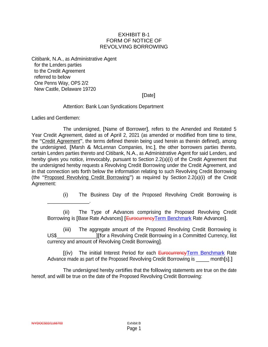 NYDOCS02/1166703 Exhibit B Page 1 EXHIBIT B-1 FORM OF NOTICE OF REVOLVING BORROWING Citibank, N.A., as Administrative Agent for the Lenders parties to the Credit Agreement referred to below One Penns Way, OPS 2/2 New Castle, Delaware 19720 [Date] Attention: Bank Loan Syndications Department Ladies and Gentlemen: The undersigned, [Name of Borrower], refers to the Amended and Restated 5 Year Credit Agreement, dated as of April 2, 2021 (as amended or modified from time to time, the “Credit Agreement”, the terms defined therein being used herein as therein defined), among the undersigned, [Marsh & McLennan Companies, Inc.], the other borrowers parties thereto, certain Lenders parties thereto and Citibank, N.A., as Administrative Agent for said Lenders, and hereby gives you notice, irrevocably, pursuant to Section 2.2(a)(i) of the Credit Agreement that the undersigned hereby requests a Revolving Credit Borrowing under the Credit Agreement, and in that connection sets forth below the information relating to such Revolving Credit Borrowing (the “Proposed Revolving Credit Borrowing”) as required by Section 2.2(a)(i) of the Credit Agreement: (i) The Business Day of the Proposed Revolving Credit Borrowing is ________________. (ii) The Type of Advances comprising the Proposed Revolving Credit Borrowing is [Base Rate Advances] [EurocurrencyTerm Benchmark Rate Advances]. (iii) The aggregate amount of the Proposed Revolving Credit Borrowing is US$_______________][for a Revolving Credit Borrowing in a Committed Currency, list currency and amount of Revolving Credit Borrowing]. [(iv) The initial Interest Period for each EurocurrencyTerm Benchmark Rate Advance made as part of the Proposed Revolving Credit Borrowing is _____ month[s].] The undersigned hereby certifies that the following statements are true on the date hereof, and will be true on the date of the Proposed Revolving Credit Borrowing: