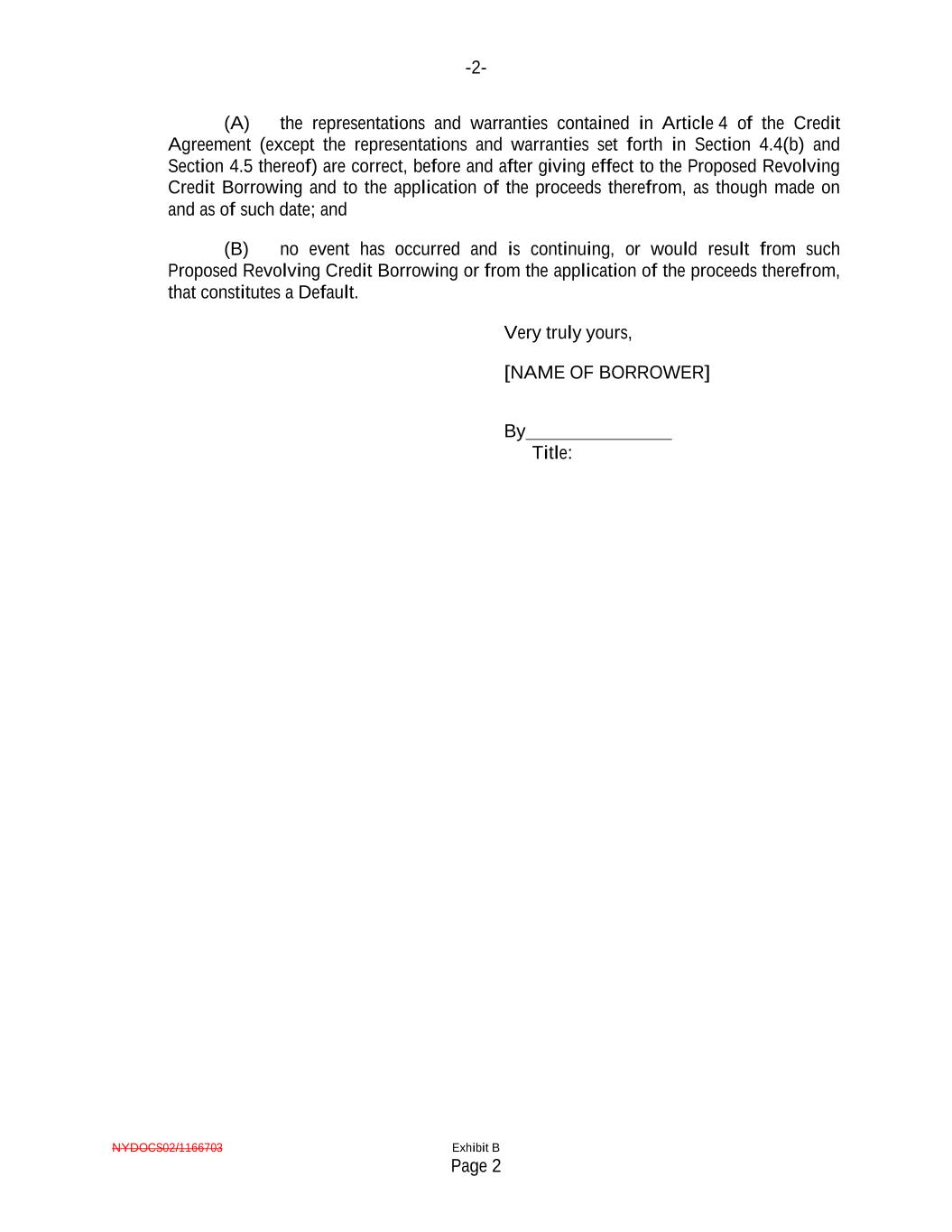 -2- NYDOCS02/1166703 Exhibit B Page 2 (A) the representations and warranties contained in Article 4 of the Credit Agreement (except the representations and warranties set forth in Section 4.4(b) and Section 4.5 thereof) are correct, before and after giving effect to the Proposed Revolving Credit Borrowing and to the application of the proceeds therefrom, as though made on and as of such date; and (B) no event has occurred and is continuing, or would result from such Proposed Revolving Credit Borrowing or from the application of the proceeds therefrom, that constitutes a Default. Very truly yours, [NAME OF BORROWER] By Title: