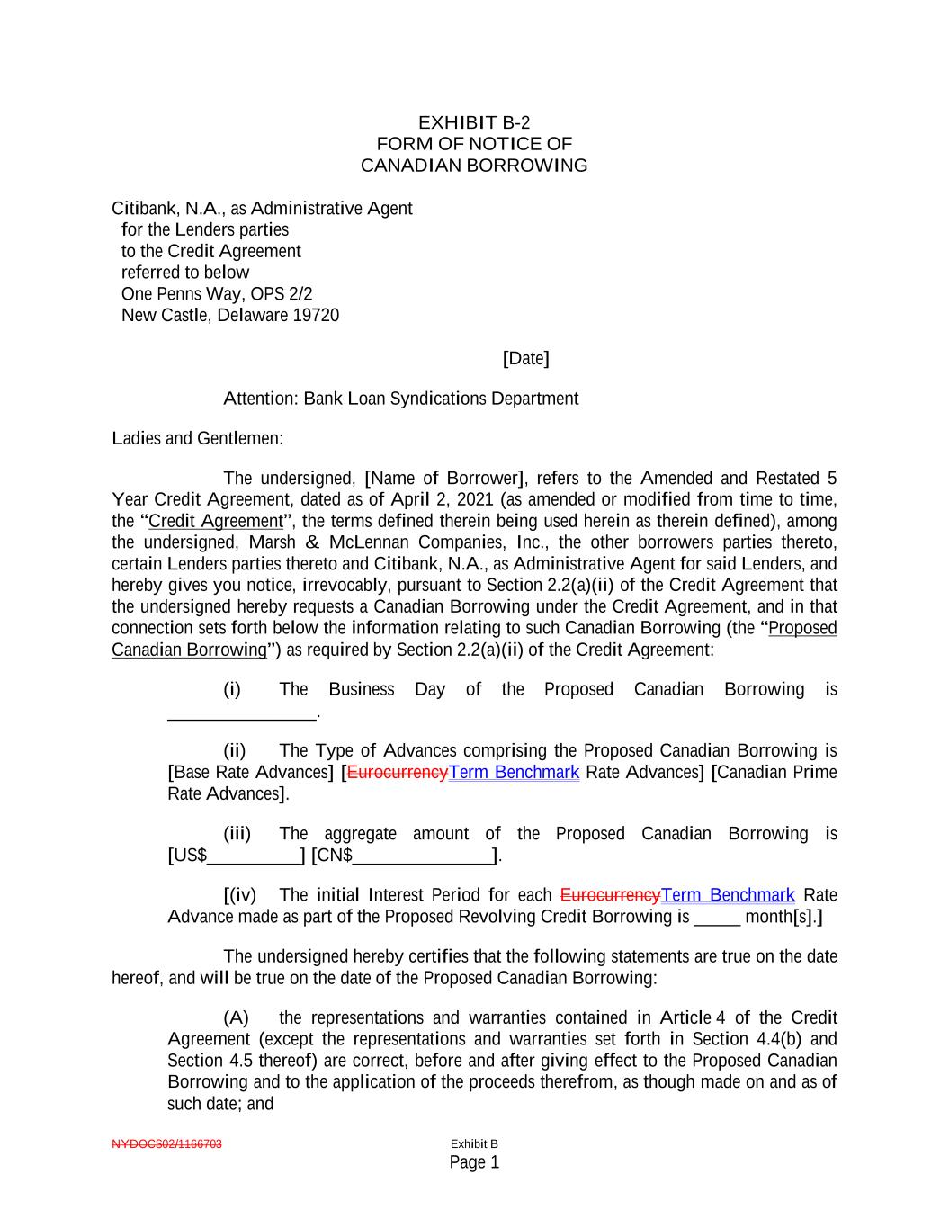NYDOCS02/1166703 Exhibit B Page 1 EXHIBIT B-2 FORM OF NOTICE OF CANADIAN BORROWING Citibank, N.A., as Administrative Agent for the Lenders parties to the Credit Agreement referred to below One Penns Way, OPS 2/2 New Castle, Delaware 19720 [Date] Attention: Bank Loan Syndications Department Ladies and Gentlemen: The undersigned, [Name of Borrower], refers to the Amended and Restated 5 Year Credit Agreement, dated as of April 2, 2021 (as amended or modified from time to time, the “Credit Agreement”, the terms defined therein being used herein as therein defined), among the undersigned, Marsh & McLennan Companies, Inc., the other borrowers parties thereto, certain Lenders parties thereto and Citibank, N.A., as Administrative Agent for said Lenders, and hereby gives you notice, irrevocably, pursuant to Section 2.2(a)(ii) of the Credit Agreement that the undersigned hereby requests a Canadian Borrowing under the Credit Agreement, and in that connection sets forth below the information relating to such Canadian Borrowing (the “Proposed Canadian Borrowing”) as required by Section 2.2(a)(ii) of the Credit Agreement: (i) The Business Day of the Proposed Canadian Borrowing is ________________. (ii) The Type of Advances comprising the Proposed Canadian Borrowing is [Base Rate Advances] [EurocurrencyTerm Benchmark Rate Advances] [Canadian Prime Rate Advances]. (iii) The aggregate amount of the Proposed Canadian Borrowing is [US$__________] [CN$_______________]. [(iv) The initial Interest Period for each EurocurrencyTerm Benchmark Rate Advance made as part of the Proposed Revolving Credit Borrowing is _____ month[s].] The undersigned hereby certifies that the following statements are true on the date hereof, and will be true on the date of the Proposed Canadian Borrowing: (A) the representations and warranties contained in Article 4 of the Credit Agreement (except the representations and warranties set forth in Section 4.4(b) and Section 4.5 thereof) are correct, before and after giving effect to the Proposed Canadian Borrowing and to the application of the proceeds therefrom, as though made on and as of such date; and