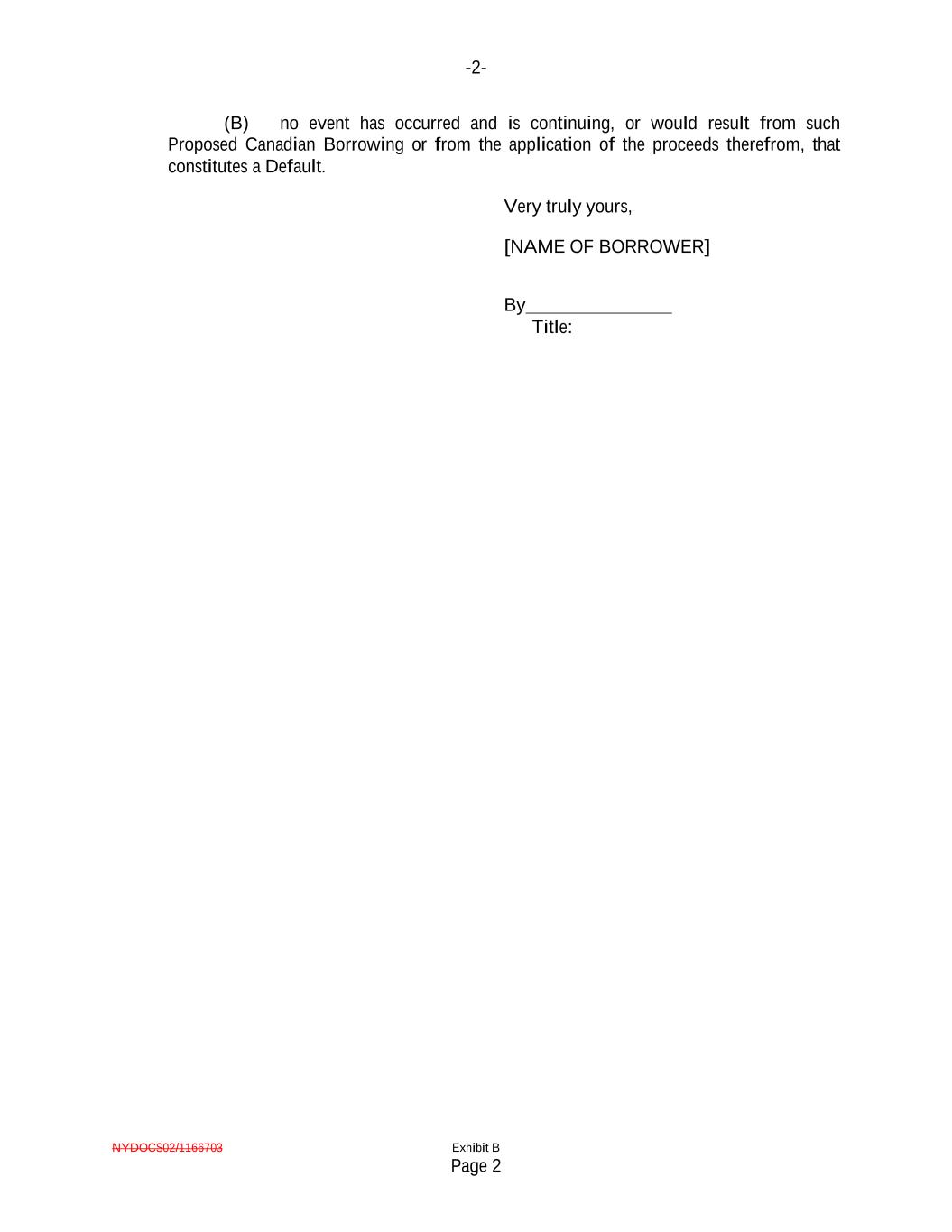 -2- NYDOCS02/1166703 Exhibit B Page 2 (B) no event has occurred and is continuing, or would result from such Proposed Canadian Borrowing or from the application of the proceeds therefrom, that constitutes a Default. Very truly yours, [NAME OF BORROWER] By Title: