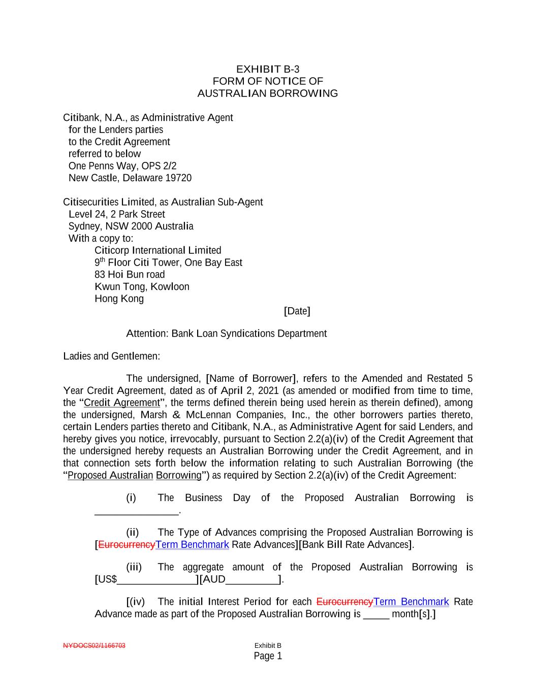 NYDOCS02/1166703 Exhibit B Page 1 EXHIBIT B-3 FORM OF NOTICE OF AUSTRALIAN BORROWING Citibank, N.A., as Administrative Agent for the Lenders parties to the Credit Agreement referred to below One Penns Way, OPS 2/2 New Castle, Delaware 19720 Citisecurities Limited, as Australian Sub-Agent Level 24, 2 Park Street Sydney, NSW 2000 Australia With a copy to: Citicorp International Limited 9th Floor Citi Tower, One Bay East 83 Hoi Bun road Kwun Tong, Kowloon Hong Kong [Date] Attention: Bank Loan Syndications Department Ladies and Gentlemen: The undersigned, [Name of Borrower], refers to the Amended and Restated 5 Year Credit Agreement, dated as of April 2, 2021 (as amended or modified from time to time, the “Credit Agreement”, the terms defined therein being used herein as therein defined), among the undersigned, Marsh & McLennan Companies, Inc., the other borrowers parties thereto, certain Lenders parties thereto and Citibank, N.A., as Administrative Agent for said Lenders, and hereby gives you notice, irrevocably, pursuant to Section 2.2(a)(iv) of the Credit Agreement that the undersigned hereby requests an Australian Borrowing under the Credit Agreement, and in that connection sets forth below the information relating to such Australian Borrowing (the “Proposed Australian Borrowing”) as required by Section 2.2(a)(iv) of the Credit Agreement: (i) The Business Day of the Proposed Australian Borrowing is ________________. (ii) The Type of Advances comprising the Proposed Australian Borrowing is [EurocurrencyTerm Benchmark Rate Advances][Bank Bill Rate Advances]. (iii) The aggregate amount of the Proposed Australian Borrowing is [US$_______________][AUD__________]. [(iv) The initial Interest Period for each EurocurrencyTerm Benchmark Rate Advance made as part of the Proposed Australian Borrowing is _____ month[s].]
