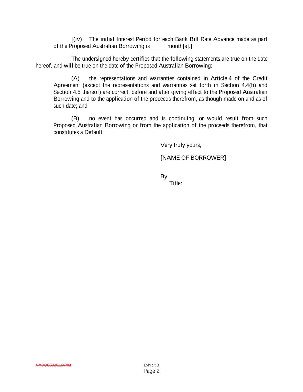 NYDOCS02/1166703 Exhibit B Page 2 [(iv) The initial Interest Period for each Bank Bill Rate Advance made as part of the Proposed Australian Borrowing is _____ month[s].] The undersigned hereby certifies that the following statements are true on the date hereof, and will be true on the date of the Proposed Australian Borrowing: (A) the representations and warranties contained in Article 4 of the Credit Agreement (except the representations and warranties set forth in Section 4.4(b) and Section 4.5 thereof) are correct, before and after giving effect to the Proposed Australian Borrowing and to the application of the proceeds therefrom, as though made on and as of such date; and (B) no event has occurred and is continuing, or would result from such Proposed Australian Borrowing or from the application of the proceeds therefrom, that constitutes a Default. Very truly yours, [NAME OF BORROWER] By Title: