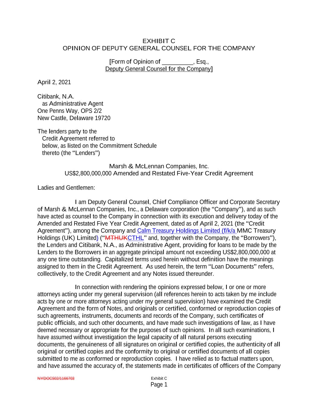 NYDOCS02/1166703 Exhibit C Page 1 EXHIBIT C OPINION OF DEPUTY GENERAL COUNSEL FOR THE COMPANY [Form of Opinion of __________, Esq., Deputy General Counsel for the Company] April 2, 2021 Citibank, N.A. as Administrative Agent One Penns Way, OPS 2/2 New Castle, Delaware 19720 The lenders party to the Credit Agreement referred to below, as listed on the Commitment Schedule thereto (the “Lenders”) Marsh & McLennan Companies, Inc. US$2,800,000,000 Amended and Restated Five-Year Credit Agreement Ladies and Gentlemen: I am Deputy General Counsel, Chief Compliance Officer and Corporate Secretary of Marsh & McLennan Companies, Inc., a Delaware corporation (the “Company”), and as such have acted as counsel to the Company in connection with its execution and delivery today of the Amended and Restated Five Year Credit Agreement, dated as of April 2, 2021 (the “Credit Agreement”), among the Company and Calm Treasury Holdings Limited (f/k/a MMC Treasury Holdings (UK) Limited) (“MTHUKCTHL” and, together with the Company, the “Borrowers”), the Lenders and Citibank, N.A., as Administrative Agent, providing for loans to be made by the Lenders to the Borrowers in an aggregate principal amount not exceeding US$2,800,000,000 at any one time outstanding. Capitalized terms used herein without definition have the meanings assigned to them in the Credit Agreement. As used herein, the term “Loan Documents” refers, collectively, to the Credit Agreement and any Notes issued thereunder. In connection with rendering the opinions expressed below, I or one or more attorneys acting under my general supervision (all references herein to acts taken by me include acts by one or more attorneys acting under my general supervision) have examined the Credit Agreement and the form of Notes, and originals or certified, conformed or reproduction copies of such agreements, instruments, documents and records of the Company, such certificates of public officials, and such other documents, and have made such investigations of law, as I have deemed necessary or appropriate for the purposes of such opinions. In all such examinations, I have assumed without investigation the legal capacity of all natural persons executing documents, the genuineness of all signatures on original or certified copies, the authenticity of all original or certified copies and the conformity to original or certified documents of all copies submitted to me as conformed or reproduction copies. I have relied as to factual matters upon, and have assumed the accuracy of, the statements made in certificates of officers of the Company