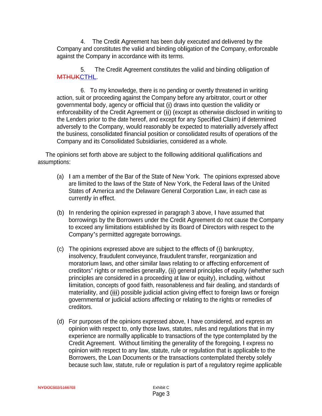 NYDOCS02/1166703 Exhibit C Page 3 4. The Credit Agreement has been duly executed and delivered by the Company and constitutes the valid and binding obligation of the Company, enforceable against the Company in accordance with its terms. 5. The Credit Agreement constitutes the valid and binding obligation of MTHUKCTHL. 6. To my knowledge, there is no pending or overtly threatened in writing action, suit or proceeding against the Company before any arbitrator, court or other governmental body, agency or official that (i) draws into question the validity or enforceability of the Credit Agreement or (ii) (except as otherwise disclosed in writing to the Lenders prior to the date hereof, and except for any Specified Claim) if determined adversely to the Company, would reasonably be expected to materially adversely affect the business, consolidated financial position or consolidated results of operations of the Company and its Consolidated Subsidiaries, considered as a whole. The opinions set forth above are subject to the following additional qualifications and assumptions: (a) I am a member of the Bar of the State of New York. The opinions expressed above are limited to the laws of the State of New York, the Federal laws of the United States of America and the Delaware General Corporation Law, in each case as currently in effect. (b) In rendering the opinion expressed in paragraph 3 above, I have assumed that borrowings by the Borrowers under the Credit Agreement do not cause the Company to exceed any limitations established by its Board of Directors with respect to the Company’s permitted aggregate borrowings. (c) The opinions expressed above are subject to the effects of (i) bankruptcy, insolvency, fraudulent conveyance, fraudulent transfer, reorganization and moratorium laws, and other similar laws relating to or affecting enforcement of creditors’ rights or remedies generally, (ii) general principles of equity (whether such principles are considered in a proceeding at law or equity), including, without limitation, concepts of good faith, reasonableness and fair dealing, and standards of materiality, and (iii) possible judicial action giving effect to foreign laws or foreign governmental or judicial actions affecting or relating to the rights or remedies of creditors. (d) For purposes of the opinions expressed above, I have considered, and express an opinion with respect to, only those laws, statutes, rules and regulations that in my experience are normally applicable to transactions of the type contemplated by the Credit Agreement. Without limiting the generality of the foregoing, I express no opinion with respect to any law, statute, rule or regulation that is applicable to the Borrowers, the Loan Documents or the transactions contemplated thereby solely because such law, statute, rule or regulation is part of a regulatory regime applicable