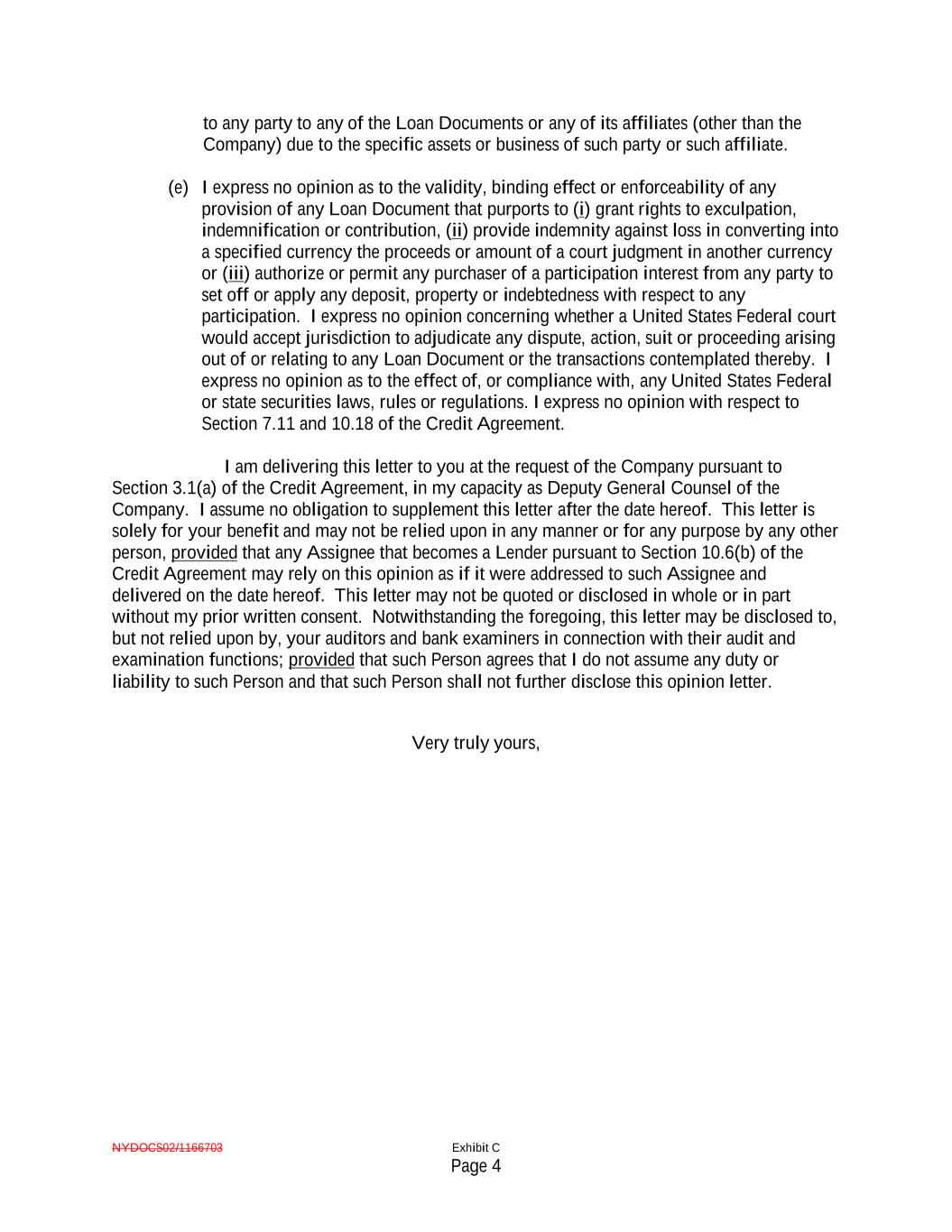 NYDOCS02/1166703 Exhibit C Page 4 to any party to any of the Loan Documents or any of its affiliates (other than the Company) due to the specific assets or business of such party or such affiliate. (e) I express no opinion as to the validity, binding effect or enforceability of any provision of any Loan Document that purports to (i) grant rights to exculpation, indemnification or contribution, (ii) provide indemnity against loss in converting into a specified currency the proceeds or amount of a court judgment in another currency or (iii) authorize or permit any purchaser of a participation interest from any party to set off or apply any deposit, property or indebtedness with respect to any participation. I express no opinion concerning whether a United States Federal court would accept jurisdiction to adjudicate any dispute, action, suit or proceeding arising out of or relating to any Loan Document or the transactions contemplated thereby. I express no opinion as to the effect of, or compliance with, any United States Federal or state securities laws, rules or regulations. I express no opinion with respect to Section 7.11 and 10.18 of the Credit Agreement. I am delivering this letter to you at the request of the Company pursuant to Section 3.1(a) of the Credit Agreement, in my capacity as Deputy General Counsel of the Company. I assume no obligation to supplement this letter after the date hereof. This letter is solely for your benefit and may not be relied upon in any manner or for any purpose by any other person, provided that any Assignee that becomes a Lender pursuant to Section 10.6(b) of the Credit Agreement may rely on this opinion as if it were addressed to such Assignee and delivered on the date hereof. This letter may not be quoted or disclosed in whole or in part without my prior written consent. Notwithstanding the foregoing, this letter may be disclosed to, but not relied upon by, your auditors and bank examiners in connection with their audit and examination functions; provided that such Person agrees that I do not assume any duty or liability to such Person and that such Person shall not further disclose this opinion letter. Very truly yours,