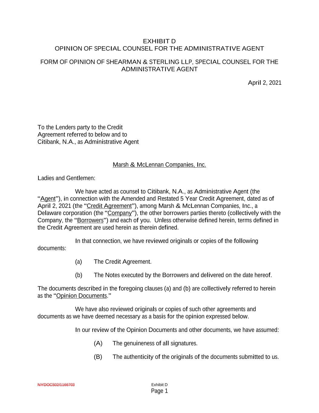 NYDOCS02/1166703 Exhibit D Page 1 EXHIBIT D OPINION OF SPECIAL COUNSEL FOR THE ADMINISTRATIVE AGENT FORM OF OPINION OF SHEARMAN & STERLING LLP, SPECIAL COUNSEL FOR THE ADMINISTRATIVE AGENT April 2, 2021 To the Lenders party to the Credit Agreement referred to below and to Citibank, N.A., as Administrative Agent Marsh & McLennan Companies, Inc. Ladies and Gentlemen: We have acted as counsel to Citibank, N.A., as Administrative Agent (the “Agent”), in connection with the Amended and Restated 5 Year Credit Agreement, dated as of April 2, 2021 (the “Credit Agreement”), among Marsh & McLennan Companies, Inc., a Delaware corporation (the “Company”), the other borrowers parties thereto (collectively with the Company, the “Borrowers”) and each of you. Unless otherwise defined herein, terms defined in the Credit Agreement are used herein as therein defined. In that connection, we have reviewed originals or copies of the following documents: (a) The Credit Agreement. (b) The Notes executed by the Borrowers and delivered on the date hereof. The documents described in the foregoing clauses (a) and (b) are collectively referred to herein as the “Opinion Documents.” We have also reviewed originals or copies of such other agreements and documents as we have deemed necessary as a basis for the opinion expressed below. In our review of the Opinion Documents and other documents, we have assumed: (A) The genuineness of all signatures. (B) The authenticity of the originals of the documents submitted to us.