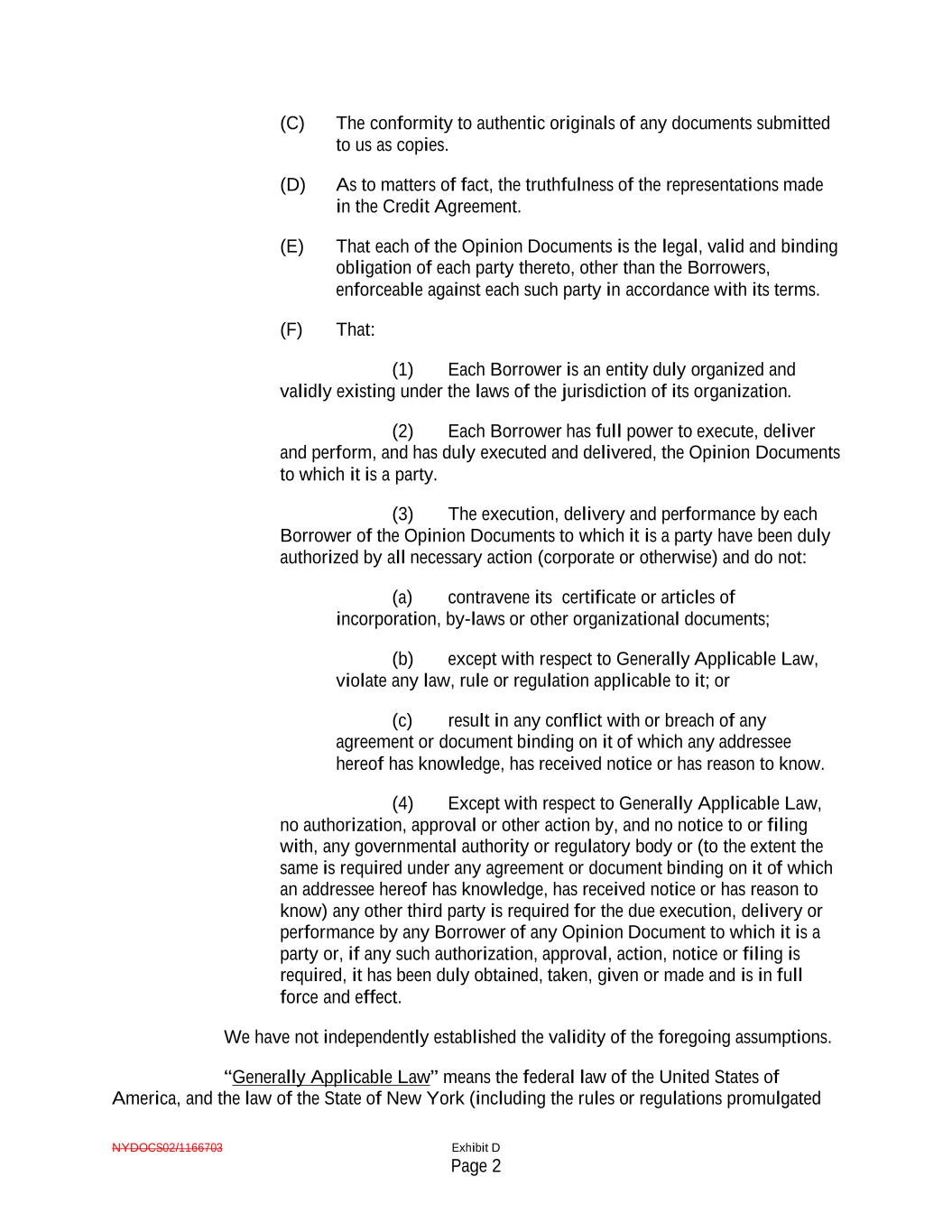 NYDOCS02/1166703 Exhibit D Page 2 (C) The conformity to authentic originals of any documents submitted to us as copies. (D) As to matters of fact, the truthfulness of the representations made in the Credit Agreement. (E) That each of the Opinion Documents is the legal, valid and binding obligation of each party thereto, other than the Borrowers, enforceable against each such party in accordance with its terms. (F) That: (1) Each Borrower is an entity duly organized and validly existing under the laws of the jurisdiction of its organization. (2) Each Borrower has full power to execute, deliver and perform, and has duly executed and delivered, the Opinion Documents to which it is a party. (3) The execution, delivery and performance by each Borrower of the Opinion Documents to which it is a party have been duly authorized by all necessary action (corporate or otherwise) and do not: (a) contravene its certificate or articles of incorporation, by-laws or other organizational documents; (b) except with respect to Generally Applicable Law, violate any law, rule or regulation applicable to it; or (c) result in any conflict with or breach of any agreement or document binding on it of which any addressee hereof has knowledge, has received notice or has reason to know. (4) Except with respect to Generally Applicable Law, no authorization, approval or other action by, and no notice to or filing with, any governmental authority or regulatory body or (to the extent the same is required under any agreement or document binding on it of which an addressee hereof has knowledge, has received notice or has reason to know) any other third party is required for the due execution, delivery or performance by any Borrower of any Opinion Document to which it is a party or, if any such authorization, approval, action, notice or filing is required, it has been duly obtained, taken, given or made and is in full force and effect. We have not independently established the validity of the foregoing assumptions. “Generally Applicable Law” means the federal law of the United States of America, and the law of the State of New York (including the rules or regulations promulgated