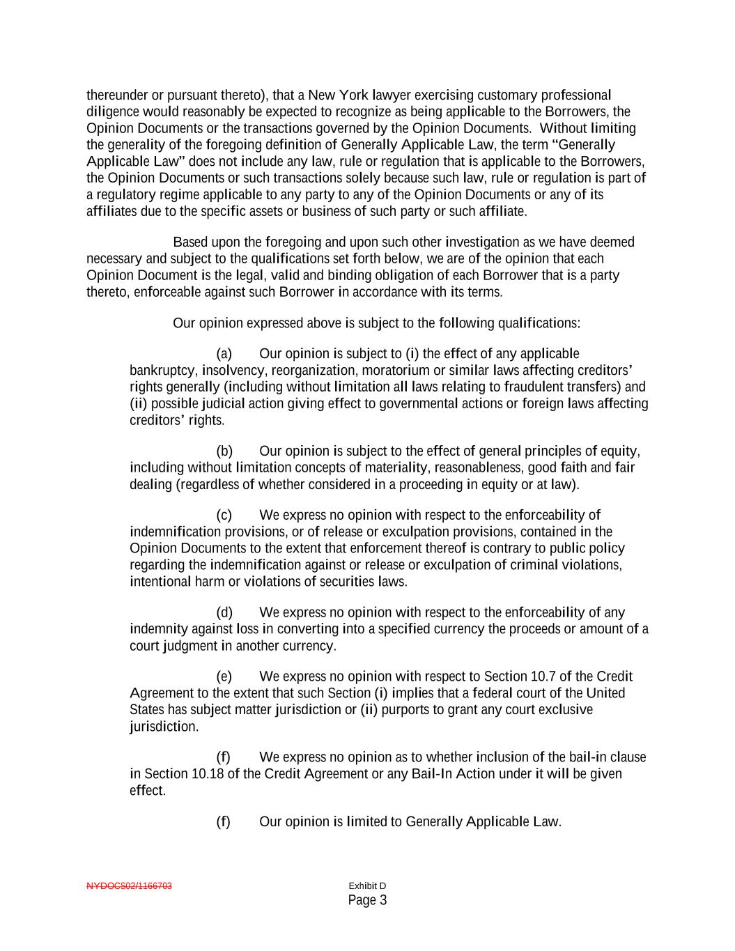 NYDOCS02/1166703 Exhibit D Page 3 thereunder or pursuant thereto), that a New York lawyer exercising customary professional diligence would reasonably be expected to recognize as being applicable to the Borrowers, the Opinion Documents or the transactions governed by the Opinion Documents. Without limiting the generality of the foregoing definition of Generally Applicable Law, the term “Generally Applicable Law” does not include any law, rule or regulation that is applicable to the Borrowers, the Opinion Documents or such transactions solely because such law, rule or regulation is part of a regulatory regime applicable to any party to any of the Opinion Documents or any of its affiliates due to the specific assets or business of such party or such affiliate. Based upon the foregoing and upon such other investigation as we have deemed necessary and subject to the qualifications set forth below, we are of the opinion that each Opinion Document is the legal, valid and binding obligation of each Borrower that is a party thereto, enforceable against such Borrower in accordance with its terms. Our opinion expressed above is subject to the following qualifications: (a) Our opinion is subject to (i) the effect of any applicable bankruptcy, insolvency, reorganization, moratorium or similar laws affecting creditors’ rights generally (including without limitation all laws relating to fraudulent transfers) and (ii) possible judicial action giving effect to governmental actions or foreign laws affecting creditors’ rights. (b) Our opinion is subject to the effect of general principles of equity, including without limitation concepts of materiality, reasonableness, good faith and fair dealing (regardless of whether considered in a proceeding in equity or at law). (c) We express no opinion with respect to the enforceability of indemnification provisions, or of release or exculpation provisions, contained in the Opinion Documents to the extent that enforcement thereof is contrary to public policy regarding the indemnification against or release or exculpation of criminal violations, intentional harm or violations of securities laws. (d) We express no opinion with respect to the enforceability of any indemnity against loss in converting into a specified currency the proceeds or amount of a court judgment in another currency. (e) We express no opinion with respect to Section 10.7 of the Credit Agreement to the extent that such Section (i) implies that a federal court of the United States has subject matter jurisdiction or (ii) purports to grant any court exclusive jurisdiction. (f) We express no opinion as to whether inclusion of the bail-in clause in Section 10.18 of the Credit Agreement or any Bail-In Action under it will be given effect. (f) Our opinion is limited to Generally Applicable Law.